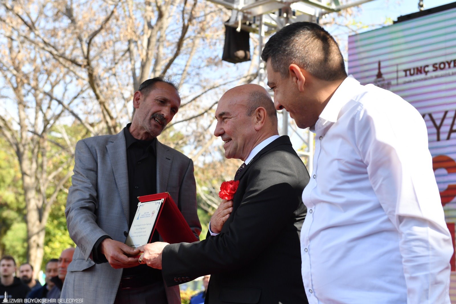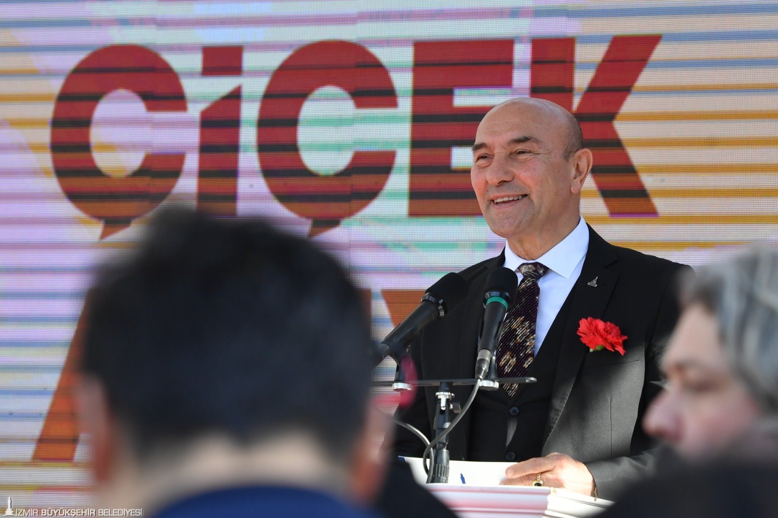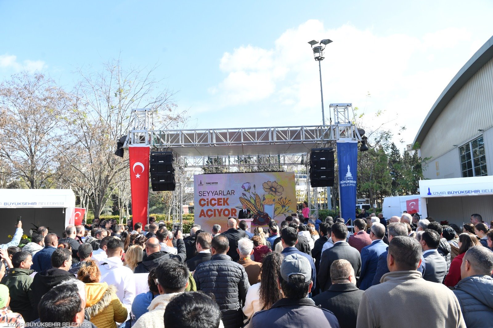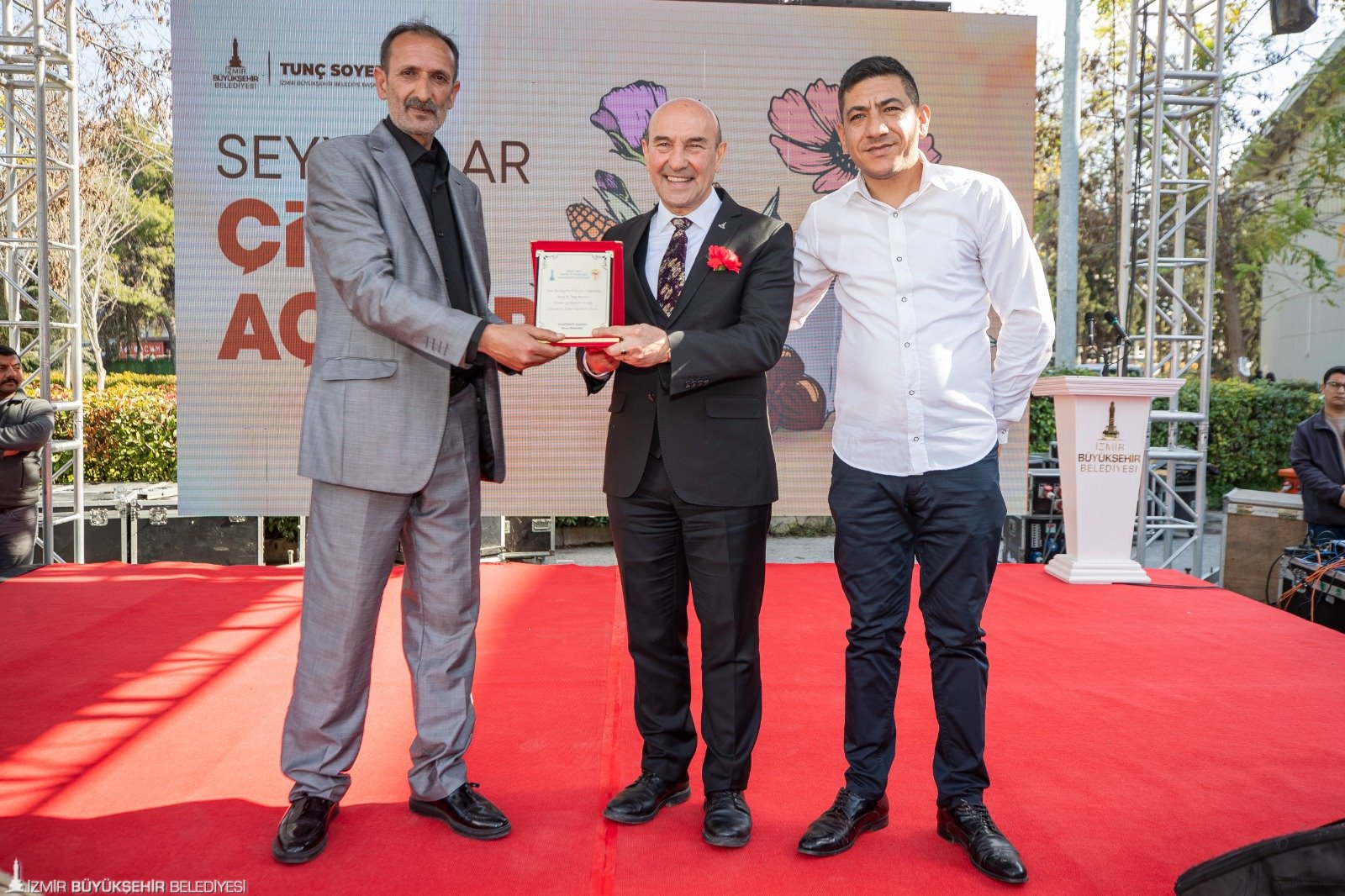 İzmir Büyükşehir Belediye Başkanı Tunç Soyer’in konuşması sırasında sık sık slogan atıldı. Yurttaşların “Dik dur eğilme İzmir halkı seninle” sloganı üzerine Soyer, “Asla eğilmem. Hiç bir zaman eğilmedim. Bundan sonra kimse eğemez” karşılığını verdi. Daha sonra konuşmasını sürdüren Tunç Soyer, şunları söyledi: “Bu şehir, bu memleket sizinle güzel. Biz birlikte güzeliz. Artık asla korkmayın. Bundan sonra hiç kimse evinizi başınıza yıkamayacak. Hiç kimse sizi sokakta bırakamayacak. Kimse sizin iş, aş ve eğitim hakkınızı elinizden alamayacak. Hiç kimse Romanların muazzam kültürünü hakir göremeyecek. Buna asla izin vermedik, vermeyeceğiz. Bugün açtığımız seyyar kestane ve çiçek satış noktalarımız, bu kararlılığımızın ete kemiğe bürünmüş halidir. Sizlerin emeğine, alın terine her zaman sahip çıkacağımızın teminatıdır. Sizlerin huzurunda bir kez daha söz veriyorum. İzmir'in 8 bin 500 yıllık uyum meydanını hiç durmadan büyüteceğiz. Ayrımcılık karşısında asla taviz vermeyeceğiz. İyi ki varsınız, iyi ki bu şehre can katıyorsunuz. Daima çok renk. Daima çok ses. Daima çok nefes, daima İzmir…”