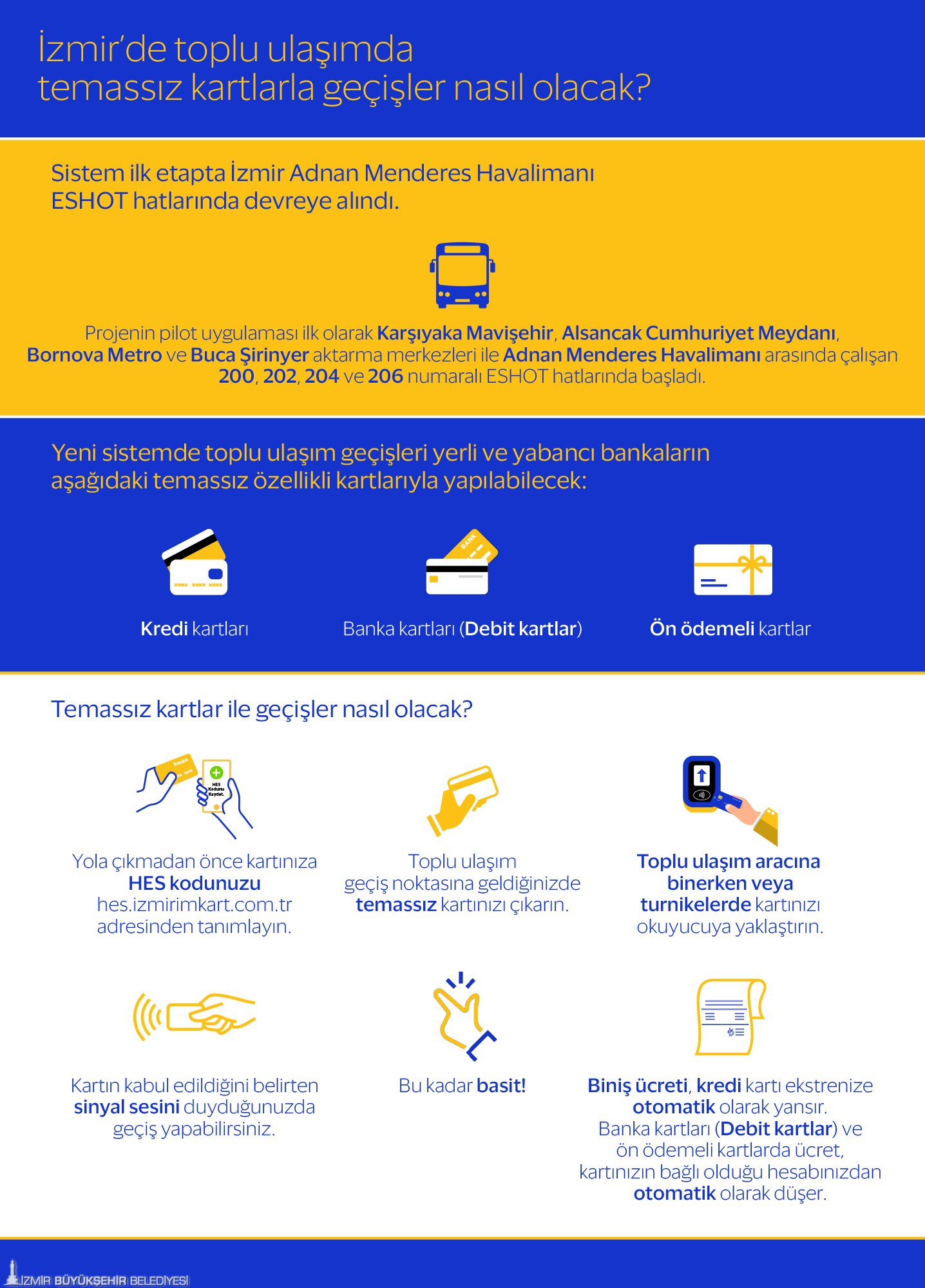 Uygulama kent geneline yayıldığında, İzmirliler, para taşımak veya kartlarını doldurmak zorunda kalmadan, temassız özellikli kredi kartı, banka kartı veya ön ödemeli kartlarını turnike ve kart okuyucularına okutarak, tüm toplu ulaşım araçlarına kolaylıkla biniş yapabilecek. Ayrıca kenti ziyaret eden turistlerin ulaşım için ek bir kart almasına gerek kalmayacağından, turist dostu sistem, sorunsuz bir müşteri deneyimi sunacak.