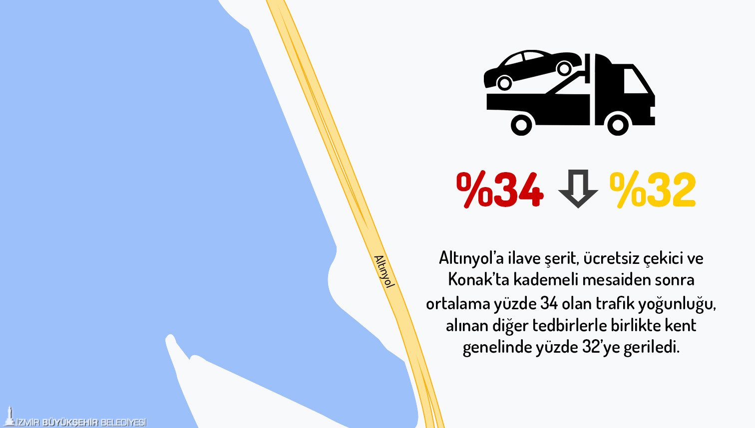 İzmir Büyükşehir Belediyesi’nin, kent trafiğini hızlandırma adına sorunlu yerlerde attığı adımlar olumlu sonuçlar vermeye başladı. Özellikle ana arterlerdeki ücretsiz çekici hizmeti ve İzmir Emniyet Müdürlüğü işbirliğiyle Altınyol’da sabah 07.30-09.30, akşam 17.00-19.30 saatleri arasında başlatılan ilave şerit uygulaması sayesinde trafikte gözle görülür rahatlama sağlandı. İzmir Valiliği’nin Konak’taki kamu kurumlarında devreye aldığı kademeli mesai uygulamasının da önemli katkısı oldu.