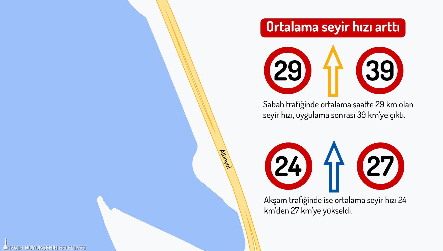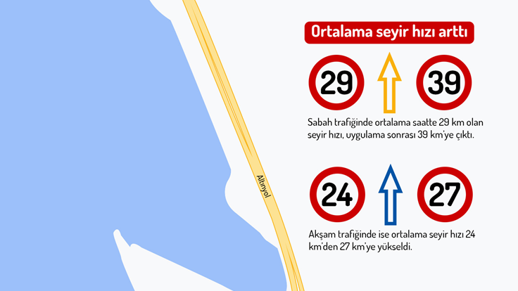 İzmir Ulaşım Merkezi (İZUM) verilerine göre, ilave şeridin açılmasıyla birlikte Anadolu Caddesi ve Altınyol’dan geçen araç sayısı bir haftada yüzde 14 artış gösterdi. Güzergâhı kullanan araçların yüzde 18’i sabah; yüzde 13’ü ise akşam saatlerinde ilave şeridi tercih etti. Ortalama seyir hızlarında da artış gözlendi. Sabah trafiğinde ortalama saatte 29 km olan seyir hızı, uygulama sonrası 39 km’ye çıktı. Akşam trafiğinde ise ortalama seyir hızı 24 km’den 27 km’ye yükseldi. Öte yandan kent genelinde ortalama yüzde 34 olan trafik yoğunluğu, alınan diğer tedbirlerle birlikte yüzde 32’ye geriledi. Kent trafiğini 7/24 kesintisiz izleyen ve yönlendiren İZUM yetkilileri, sürücülerin, ilave şerit uygulamasını yeni yeni fark ettiğini, kullanımının her geçen gün arttığını kaydetti.