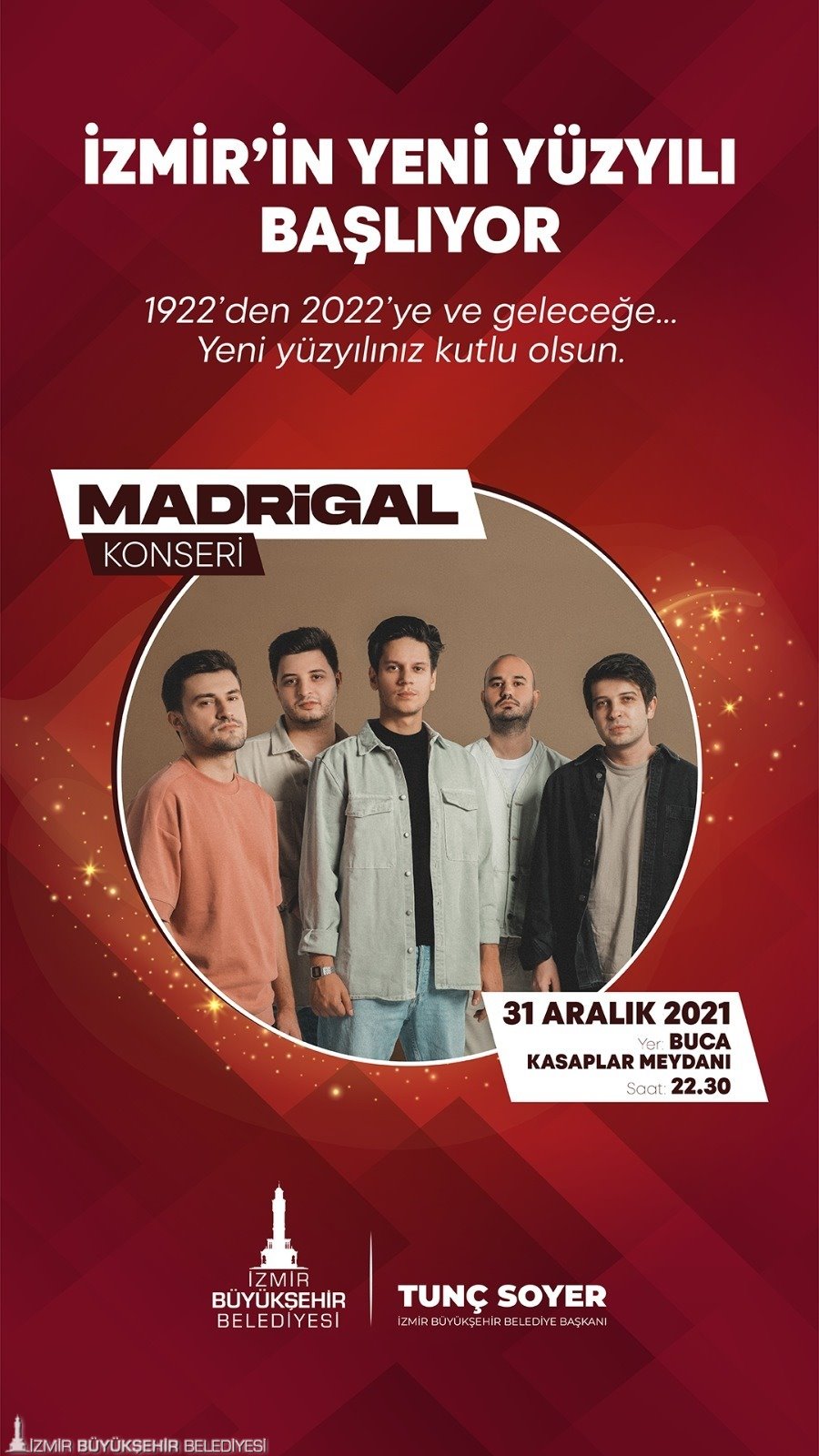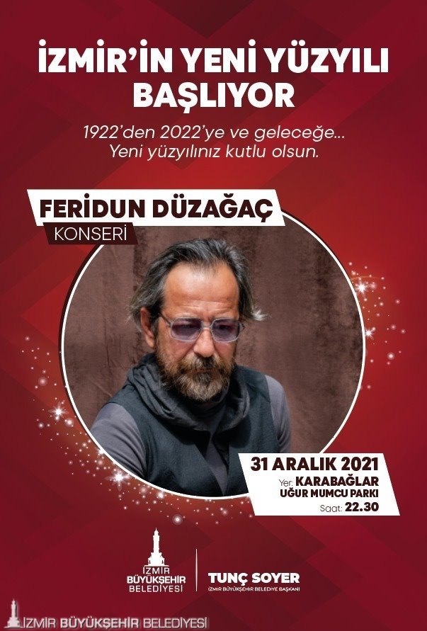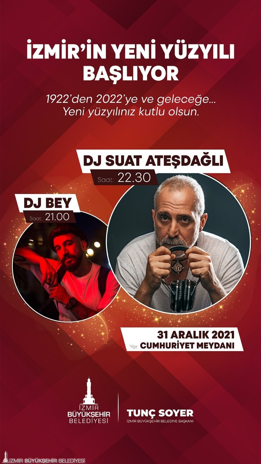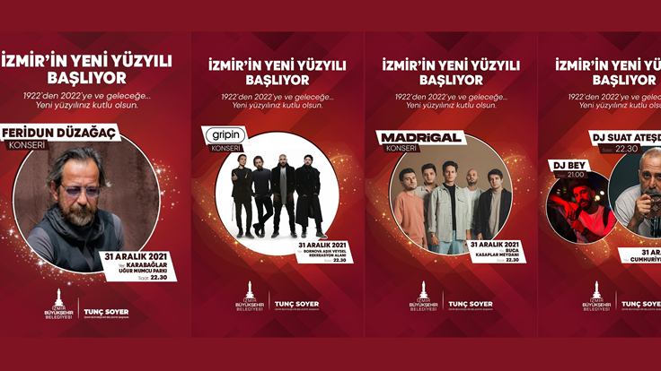 “İzmir’in yeni yüzyılı başlıyor” sloganıyla yeni yıl coşkusunu kentin her köşesine yaymayı amaçlayan İzmir Büyükşehir Belediyesi, 31 Aralık Cuma gecesi usta müzisyenleri ağırlayacak. Cumhuriyet Meydanı’nda 21.00’de “DJ Bey”in performansının ardından 22.30’da 1983’ten bu yana DJ kabininde olan Suat Ateşdağlı sahne alacak. Alternatif rock grubu “Madrigal” ise Buca Kasaplar Meydanı’nda 22.30’da İzmirliler ile buluşacak. Bornova Âşık Veysel Rekreasyon Alanı’nda yine 22.30’da “Gripin”, Karabağlar Uğur Mumcu Parkı’nda ise Feridun Düzağaç konseri var. Yılbaşı eğlencesi video mapping gösterileriyle renklenecek.