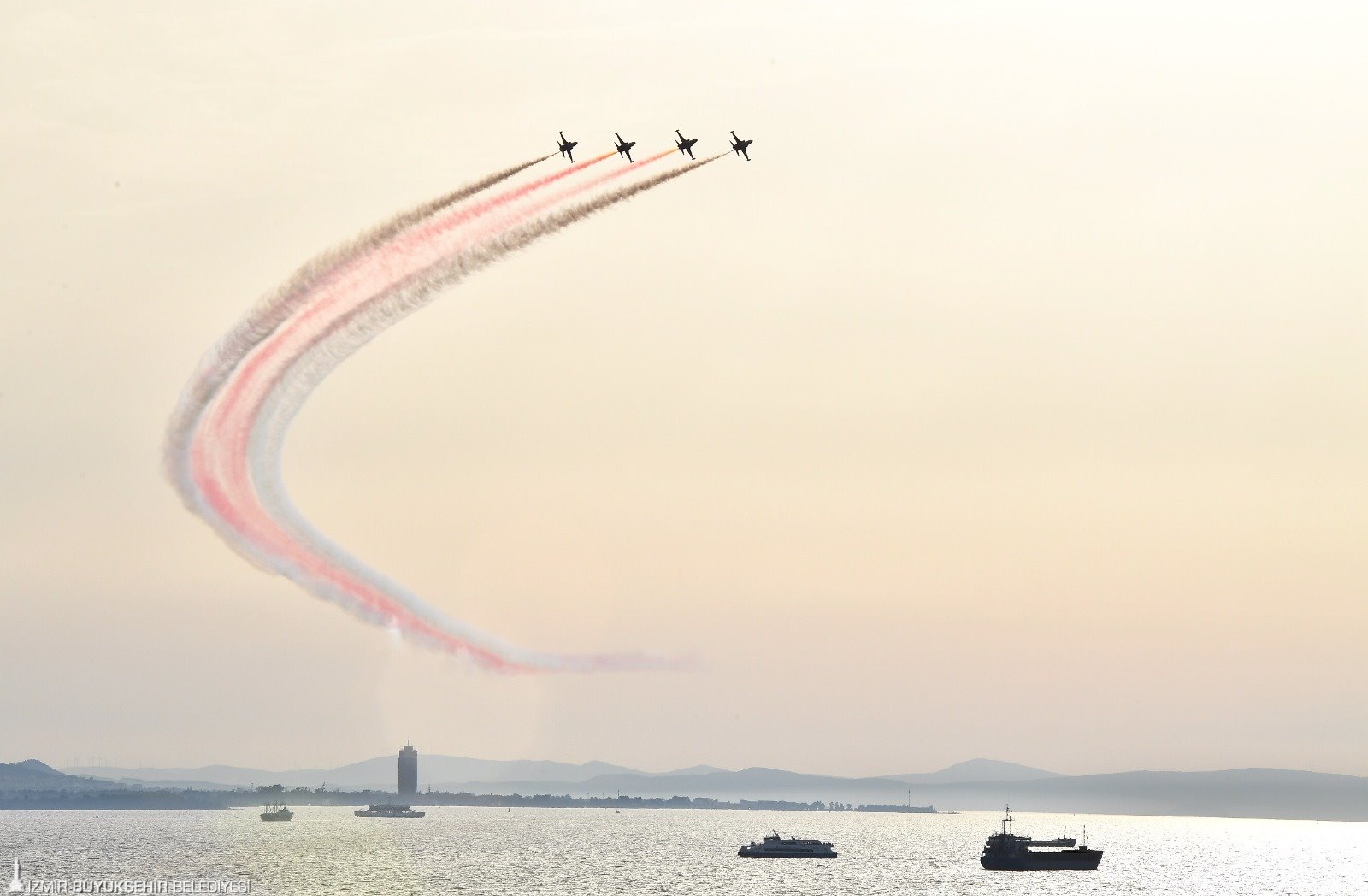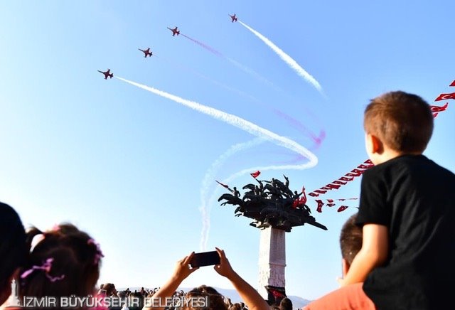 Saat 15.45'de Süvari Birlikleri'nin Cumhuriyet Meydanı'ndan Gündoğdu Meydanı'na yapacağı yürüyüşten hemen sonra İzmir semaları, saat 16.15'den itibaren önce Genel Havacılık Uçakları ve İzmir Kulüpleri selamlama uçuşuna sahne olacak. Gökyüzü Hürkuş Gösteri Uçuşu, Solo Türk, Türk Yıldızları, Jandarma Çelik Kanatlar gösterisi, Polis Havacılık Üzüm Salkımı, Sahil Güvenlik Arama Kurtarma ve selamlama ile Flyboard gösterisi ile şenlenecek. Ayrıca saat 19.00’da Deniz-Hava-Karada Zeybek- Türk Silahlı Kuvvetleri Armoni Mızıkası 100. Yıl coşkusunu zirveye taşıyacak.
