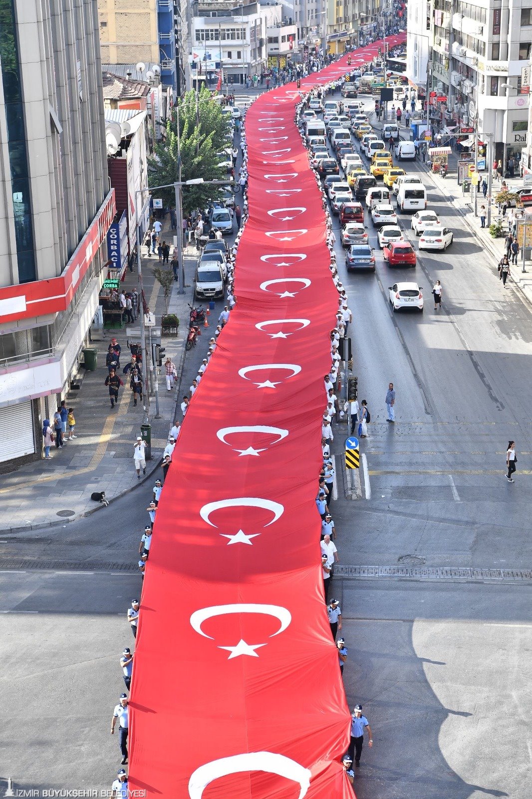 Türk Ordusu'nun İzmir'e girerken kullandığı güzergah üzerinde Gaziler, Anafartalar ve İkiçeşmelik caddelerini takip edecek İzmirliler, 350 metre uzunluğundaki dev Türk bayrağını birlikte taşıyacak. Cumhuriyet Meydanı'ndaki törenler, saat 10.00'da Atatürk Anıtı'na çelenk sunumu, saygı duruşu ve İstiklal Marşı'nın okunması ile başlayıp, ardından Hükümet Konağı'ndaki bayrak töreni ile devam edecek. Cumhuriyet Meydanı, saat 11.15'ten itibaren gösterilerin yer aldığı kutlamaları izlemek isteyen on binlerce İzmirliye kucak açacak. İzmir Büyükşehir Belediye Başkanı Tunç Soyer, burada İzmirlilere hitap edecek. Programda Büyükşehir Belediyesi Dans ve Ritim Topluluğu gösterisi, Zeybek, Bendir Dansı, Kafkas ve İzmir Büyükşehir Bandosu da yer alacak.