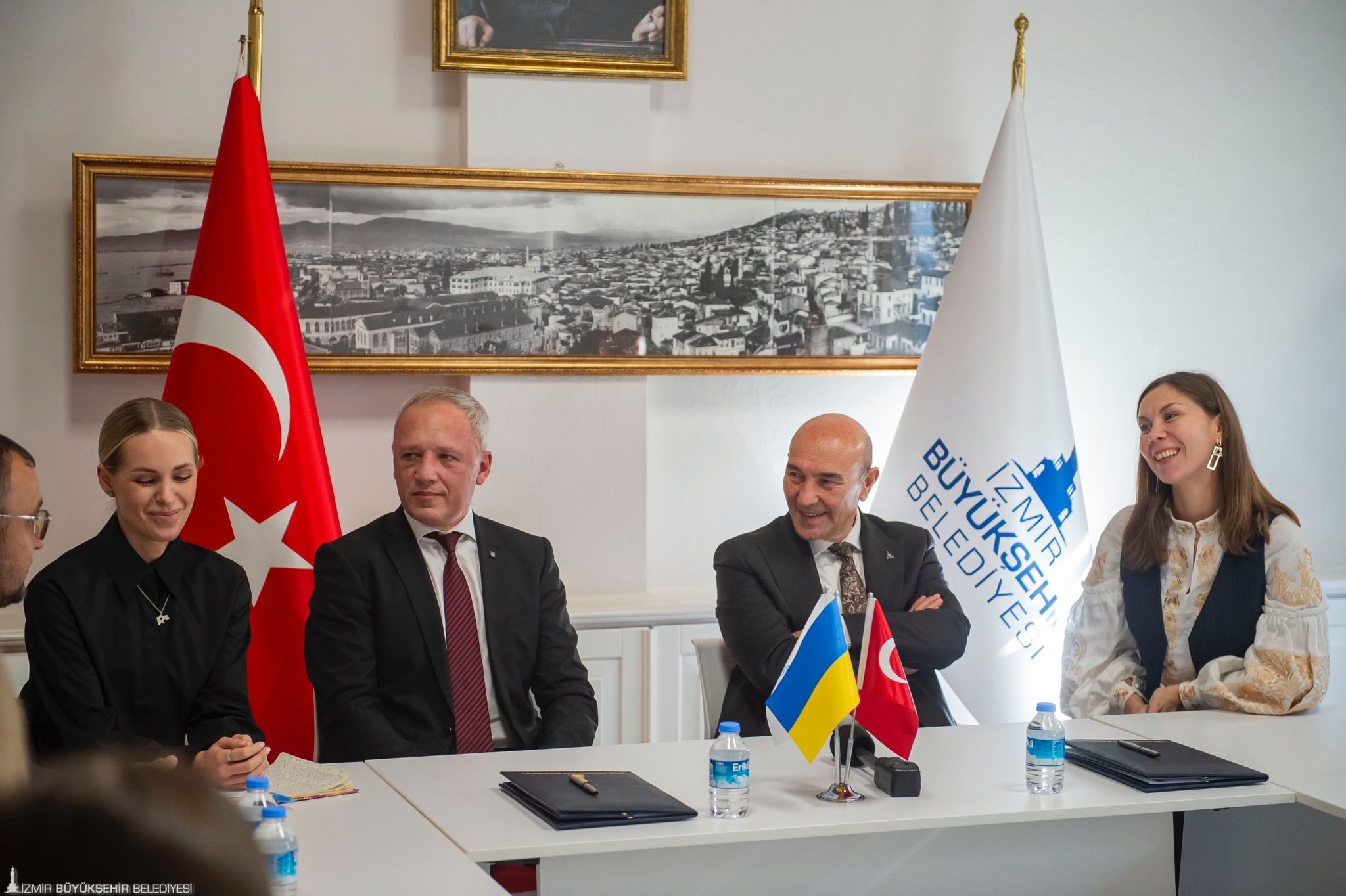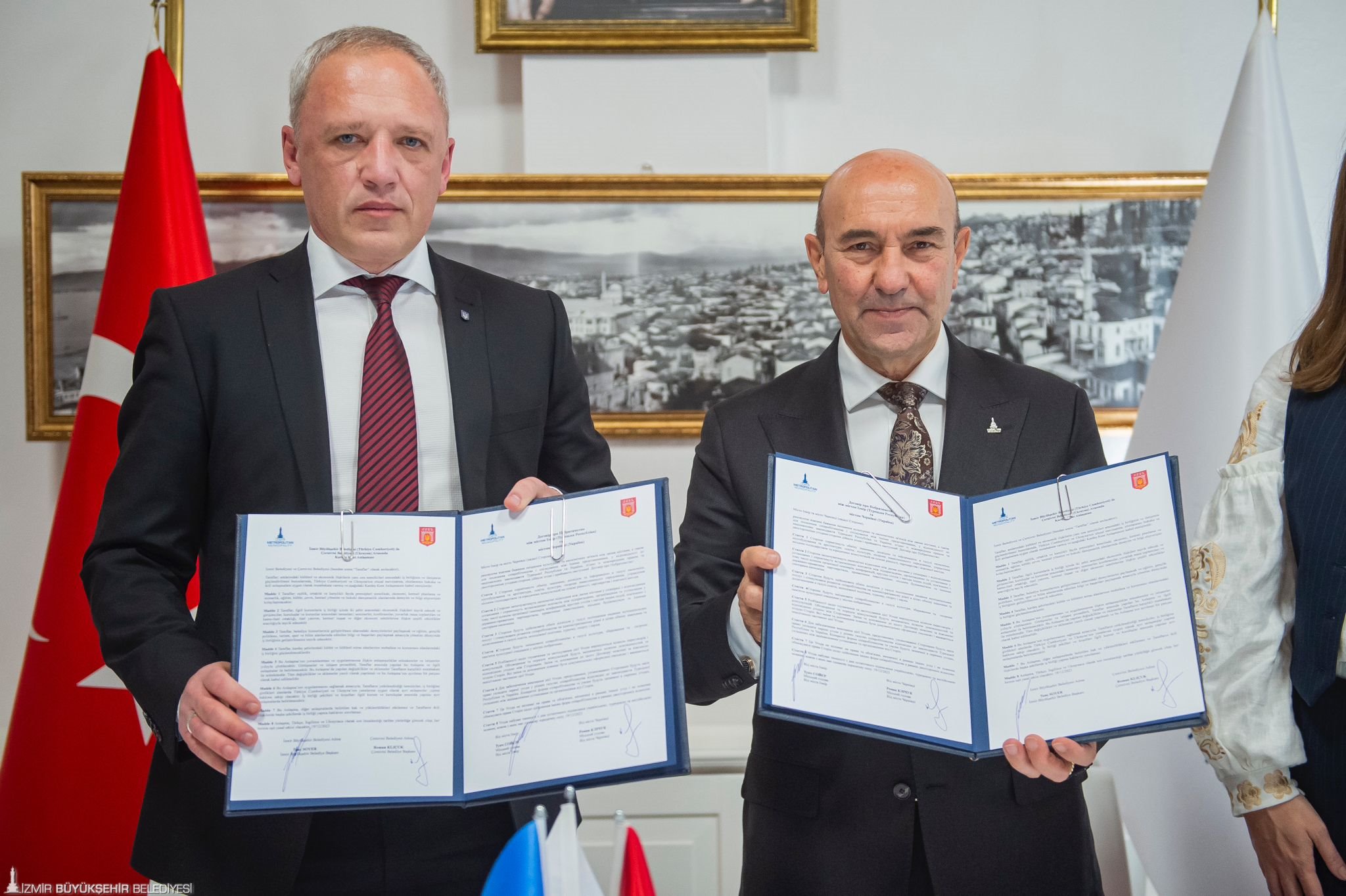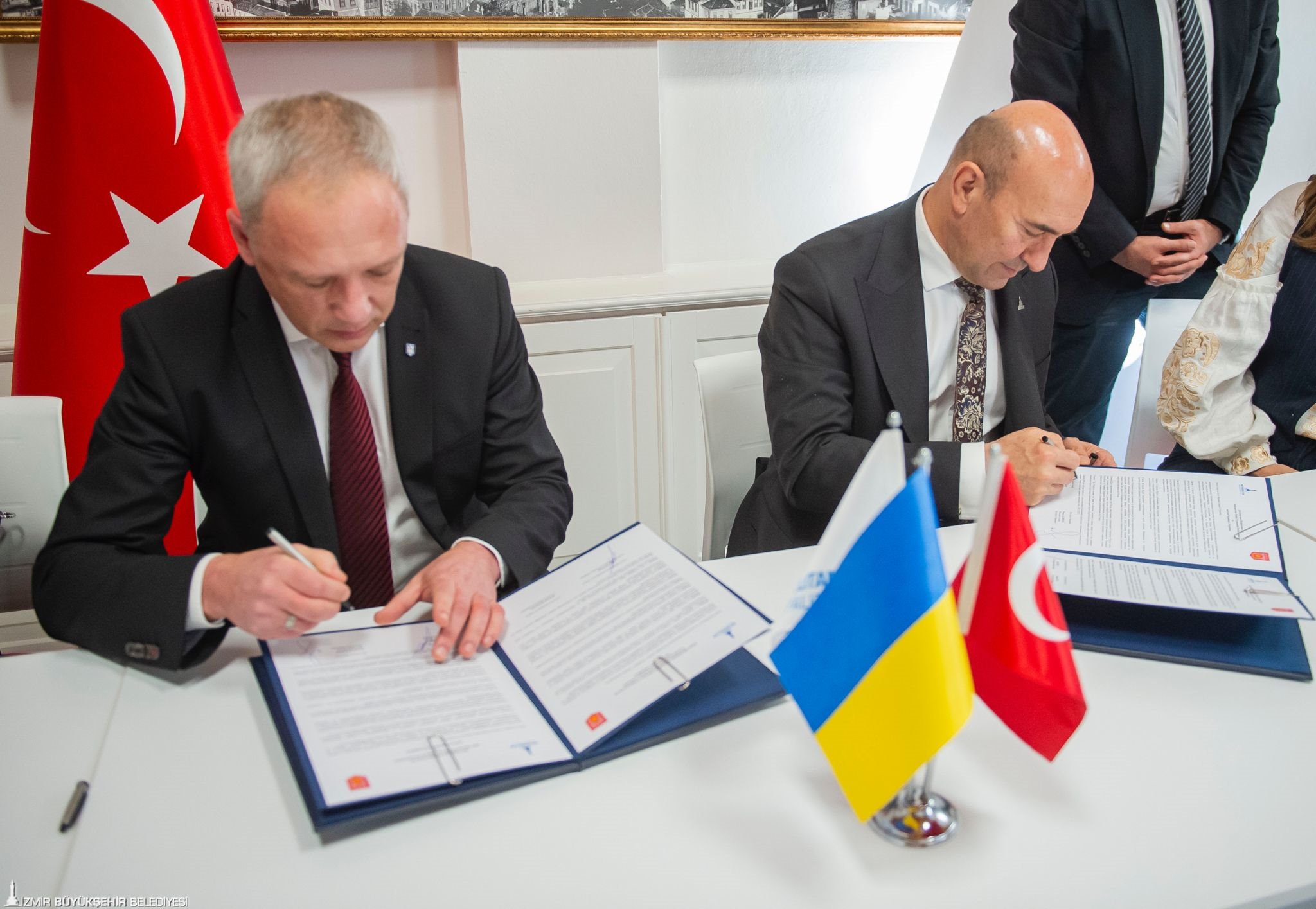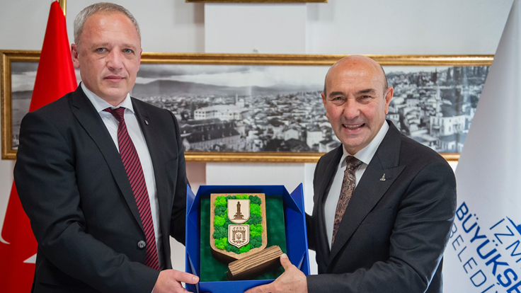 İzmir Büyükşehir Belediyesi ile Ukrayna’nın Çernivtsi kenti arasında “kardeş kent” anlaşması imzalandı. İzmir Büyükşehir Belediyesi Egemenlik Evi’nde düzenlenen törenle atılan imzalar Rusya-Ukrayna savaşı sırasında imzalanan ilk anlaşma olma özelliği de taşıyor. İzmir- Çernivtsi kardeş kent imza törenine İzmir Büyükşehir Belediyesi Danışmanı Onur Eryüce, Çernivtsi Belediye Başkanı Roman Klichuk, Ukrayna Ankara Büyükelçisi Vasyl Bodnar, Çernivtsi Kent Konseyi Sosyo-Ekonomik Kalkınma ve Stratejik Planlama Departmanı Direktörü Serhii Bostan, Ukrayna İstanbul Başkonsolosu Roman Nedilskyi ve İzmir Ukraynalılar Derneği Başkanı Oksana Özek katıldı. İmza töreninin ardından Başkan Tunç Soyer ve Ukrayna heyeti Nefes Restoran’da düzenlenen yemekte bir araya geldi.