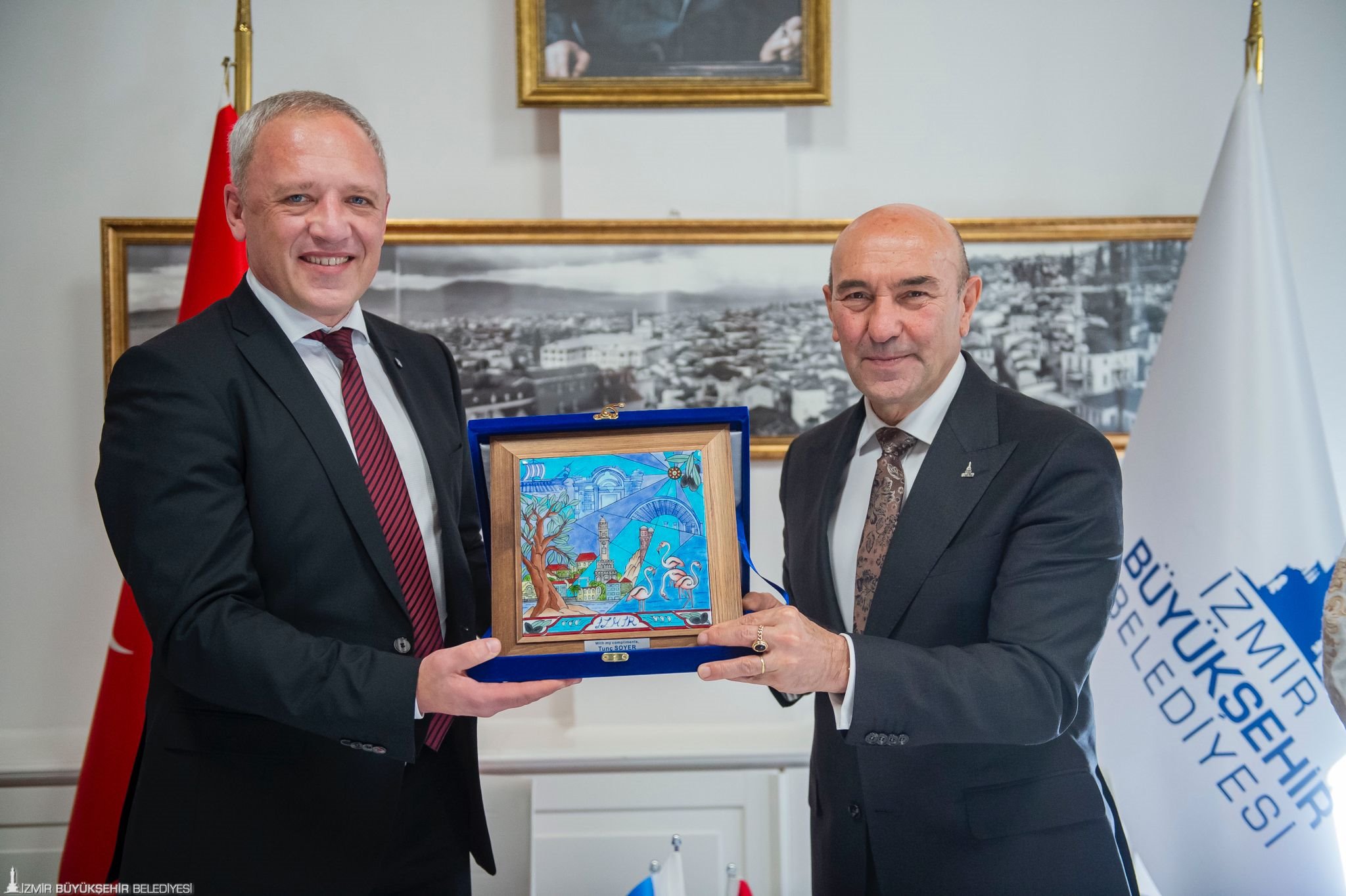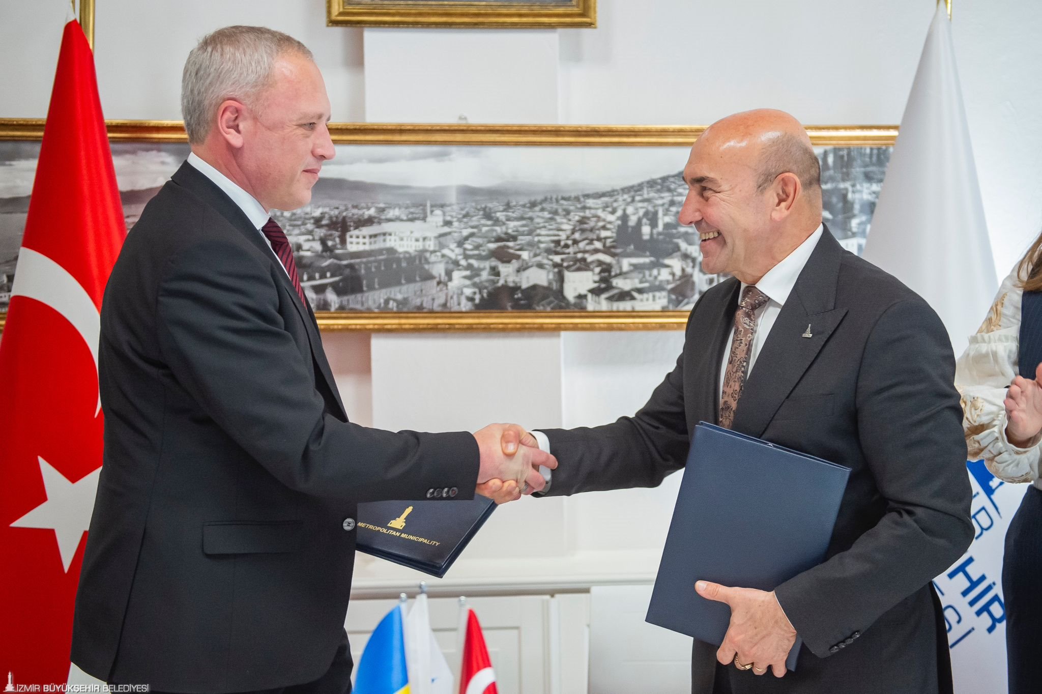 Barışın ve refahın büyüyeceği bir geleceği birlikte kuracaklarını ifade eden İzmir Büyükşehir Belediye Başkanı Tunç Soyer, “Bugün yaşanan bu siyasal iklimin ruhlarımızı karartmasına izin vermeyeceğiz. Büyük umutlarımız ve büyük heyecanlarımız var. Birlikteliğimizi daha da ileriye taşıyacağız. Eğitimde, ticarette, sporda birçok alanda iş birliği yapabiliriz. İlk olmak çok gurur verici. Savaş döneminde bu anlaşmanın yapılıyor olması çok gurur verici ama bu aynı zamanda çok büyük bir sorumluluk. Biz çok iyi ve başarılı olmazsak diğerlerinin böyle bir anlaşma yapma olasılığını da yok etmiş oluruz. O nedenle bu andan itibaren sorumluluğumuz iki şehirle sınırlı değil. Anlaşma yapma potansiyeli taşıyan tüm şehirler için biz bunu yapmak zorundayız. Burada gülen yüzleri gördüğüm için umudum çok büyük. En iyisini en güzelini yapacağımızı biliyorum. Birlikte çok güzel işler başaracağız” dedi.