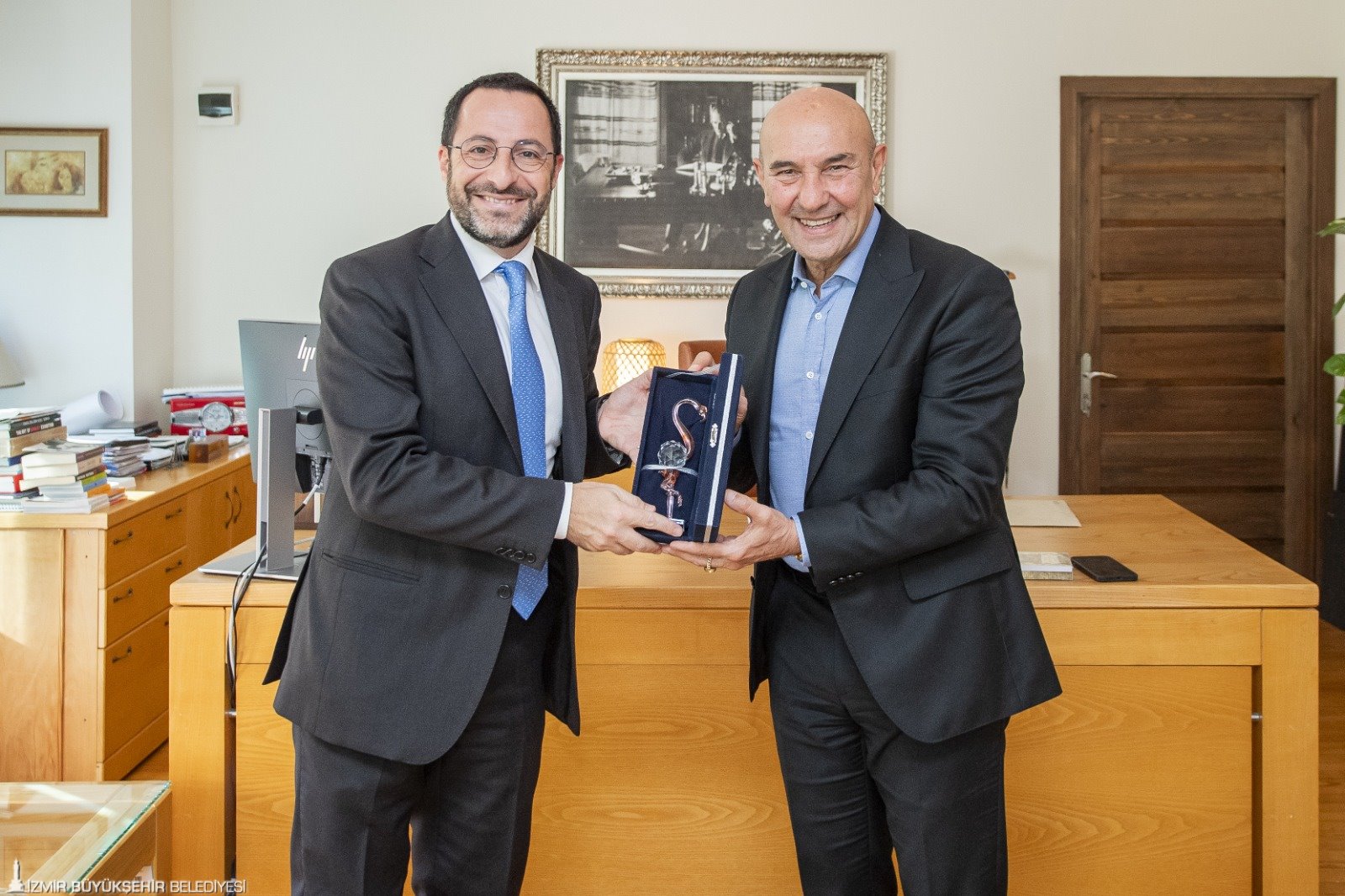 Görev süresi tamamlanan İtalya’nın İzmir Konsolosu Valerio Giorgio, İzmir Büyükşehir Belediye Başkanı Tunç Soyer’e veda ziyaretinde bulundu. Konsolosun kentte güzel hizmetlerde bulunduğunu belirten Başkan Soyer, “Sizinle çalışmak güzeldi. İzmir’de unutulmayacak izler bıraktınız. İki ülke arasındaki ilişkileri güçlendirdiniz. Kentteki çalışmalarınız çok kıymetli. Her zaman sizleri İzmir’de ağırlamaktan mutluluk duyacağız” dedi.