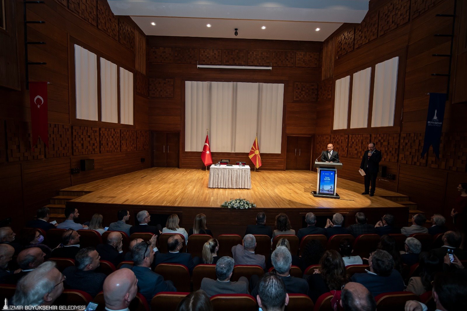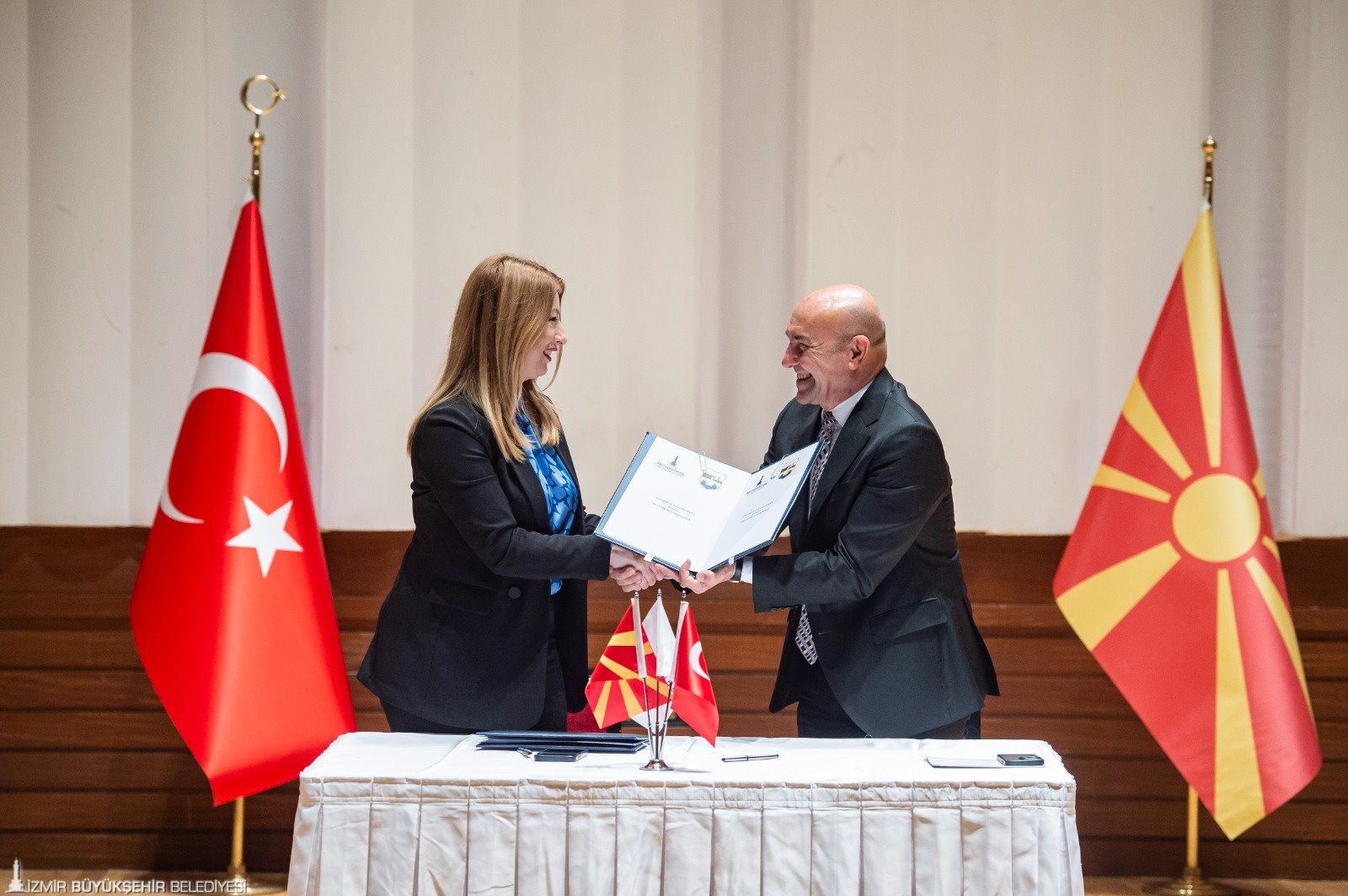 İzmir Büyükşehir Belediyesi, Kuzey Makedonya'nın Üsküp kentiyle “kardeş kent” anlaşması imzaladı. İzmir Büyükşehir Belediye Başkanı Tunç Soyer’in ev sahipliğinde Ahmed Adnan Saygun Sanat Merkezi’nde düzenlenen imza törenine Üsküp Belediye Başkanı Danela Arsovska, Dışişleri Bakanlığı İzmir Temsilcisi Büyükelçi Naciye Gökçen Kaya, Kuzey Makedonya'nın İstanbul Başkonsolosu Aktan Ago, CHP milletvekilleri Kani Beko ile Kamil Okyay Sındır, Konak Belediye Başkanı Abdül Batur, Gaziemir Belediye Başkanı Halil Arda, Ödemiş Belediye Başkanı Mehmet Eriş, CHP İzmir İl Başkanı Şenol Aslanoğlu, İzmir Büyükşehir Belediyesi ve Üsküp Belediyesi meclis üyeleri, Balkan derneklerinin ve siyasi partilerin temsilcileri katıldı.