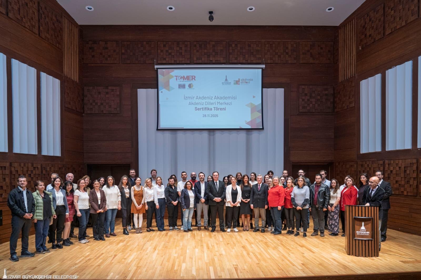 İzmir Büyükşehir Belediyesi Kültür, Sanat ve Sosyal İşler Dairesi Başkanlığı’na bağlı İzmir Akdeniz Akademisi bünyesindeki Akdeniz Dilleri Merkezi’nde sertifika heyecanı yaşandı. Ahmed Adnan Saygun Sanat Merkezi’nde düzenlenen törende konuşan Ankara Üniversitesi Türkçe ve Yabancı Dil Uygulama ve Araştırma Merkezi (TÖMER) İzmir Şube Koordinatörü Öğr. Gör. Özlem Onar, merkezin bilimsel altyapısını ve dil eğitiminde yakalanan başarıyı vurguladı. Ardından kürsüye gelen İzmir Büyükşehir Belediyesi Meclisi İkinci Başkan Mehmet Atilla Baysak, İzmir Büyükşehir Belediyesi’nin eğitim ve kültür alanındaki çalışmalarının önemine değinerek, merkezin kente kattığı değeri ifade etti.