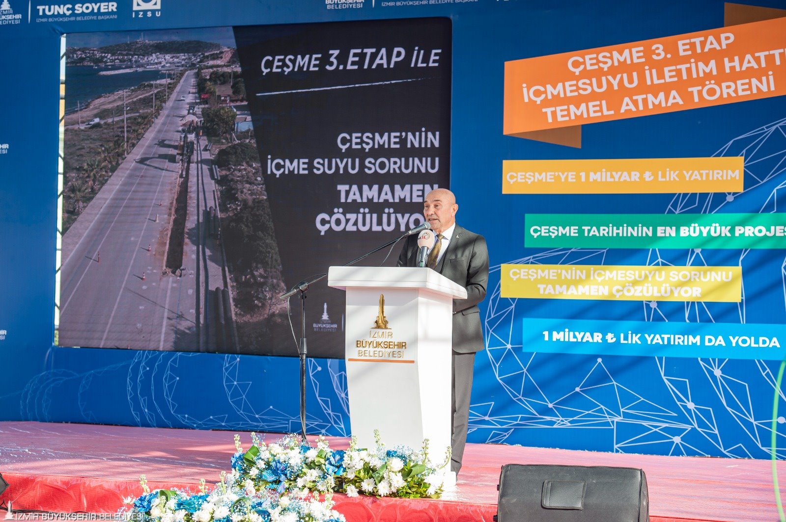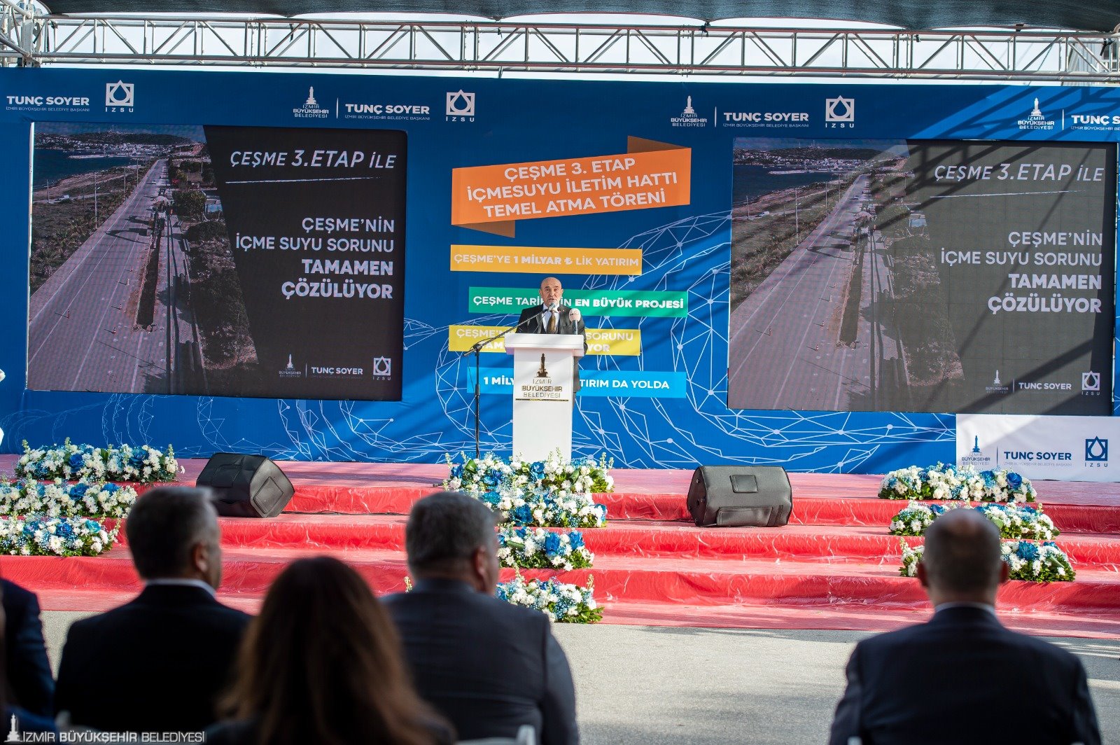 Başkan Tunç Soyer, “Yaz aylarında 1 milyona yaklaşan nüfusuyla Çeşme, her yıl Türkiye’nin ve dünyanın dört bir yanından gelen ziyaretçileri ağırlıyor. İlçemizin bu çok özel durumu uzun yıllardır içme suyu, kanalizasyon ve arıtma altyapısına özellikle yaz aylarında ciddi bir yük oluşturuyordu. İzmir’in her ilçesine, her mahallesine sağlıklı su ve dirençli bir altyapı sağlama hedefimiz doğrultusunda İZSU Genel Müdürlüğü’müzle Çeşme’de yatırım seferberliği başlattık. Kaçaklara, kokuya, arıza ve kesintilere neden olan Çeşme’nin altyapı sorunlarını kökten çözecek tüm adımları planladık” dedi.