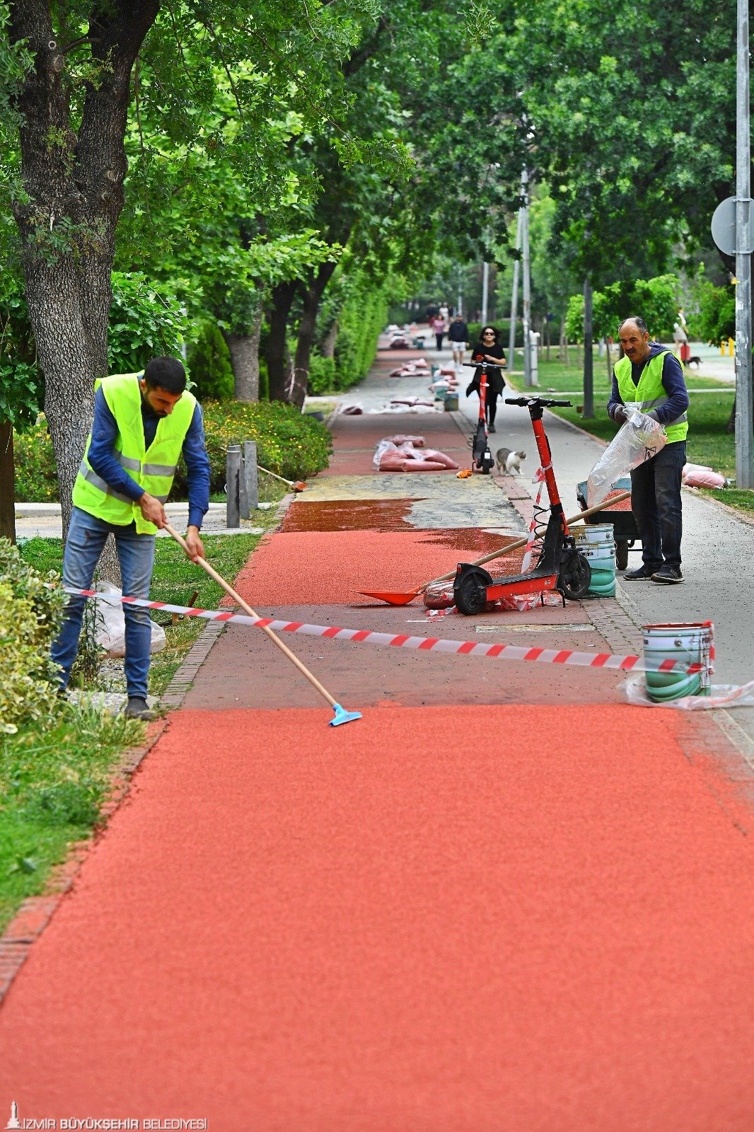 İzmir Büyükşehir Belediyesi, kentin dört bir yanındaki parklarda güvenlik ve konforu sağlamak için zemin onarım çalışması başlattı. İzmirlilerin taleplerini değerlendirerek planlanan çalışmalar kapsamında İzmir Büyükşehir Belediyesi Park ve Bahçeler Dairesi Başkanlığı ekipleri, spor amaçlı kullanılan tartan pistlerin tahrip olan bölümlerini onarırken, çocuk oyun alanlarının kauçuk zeminlerini yeniledi.