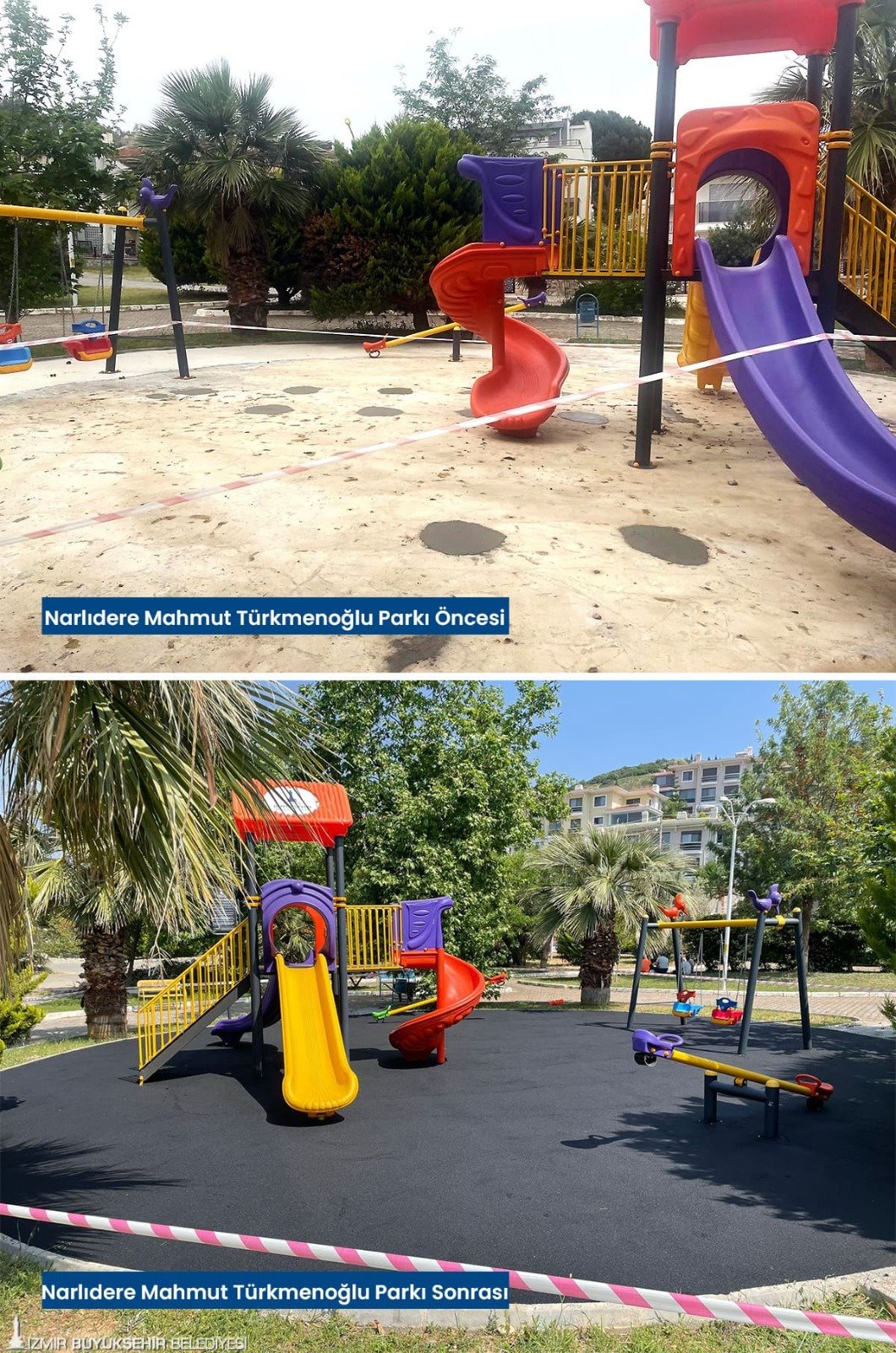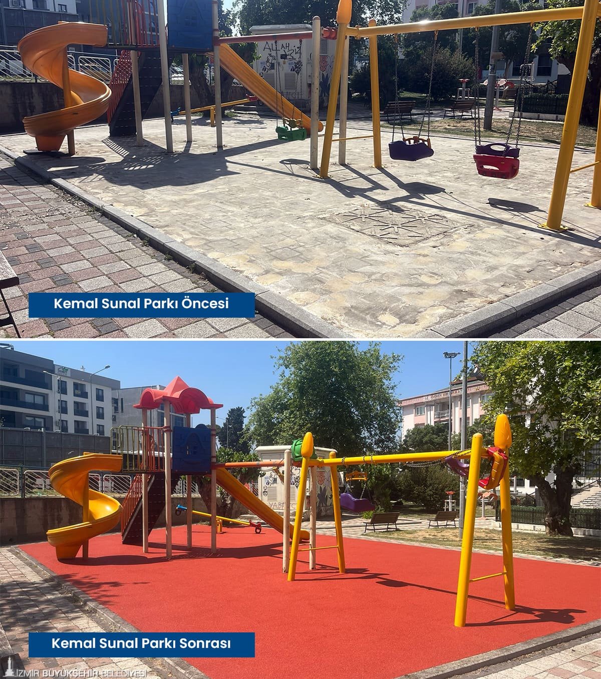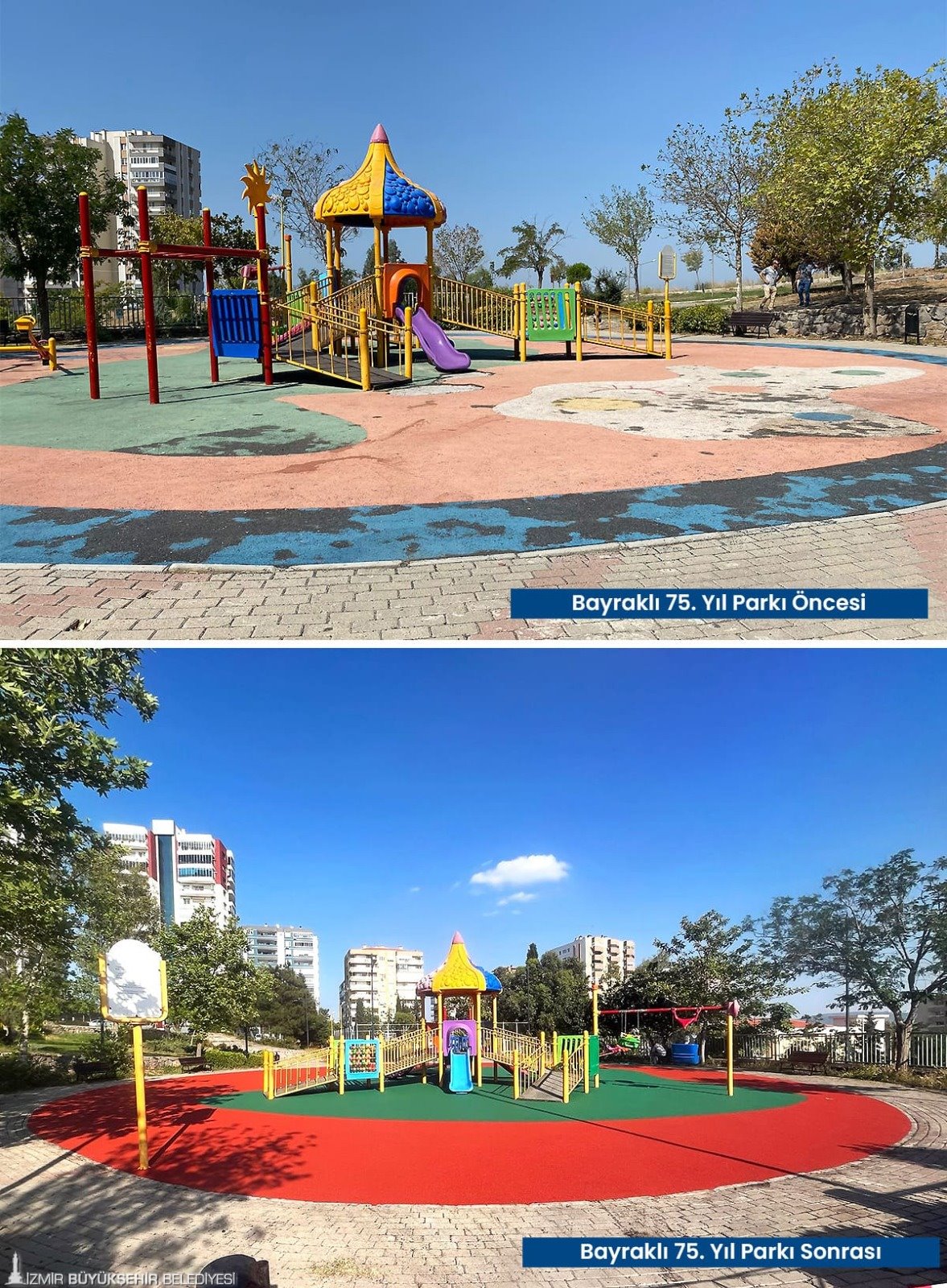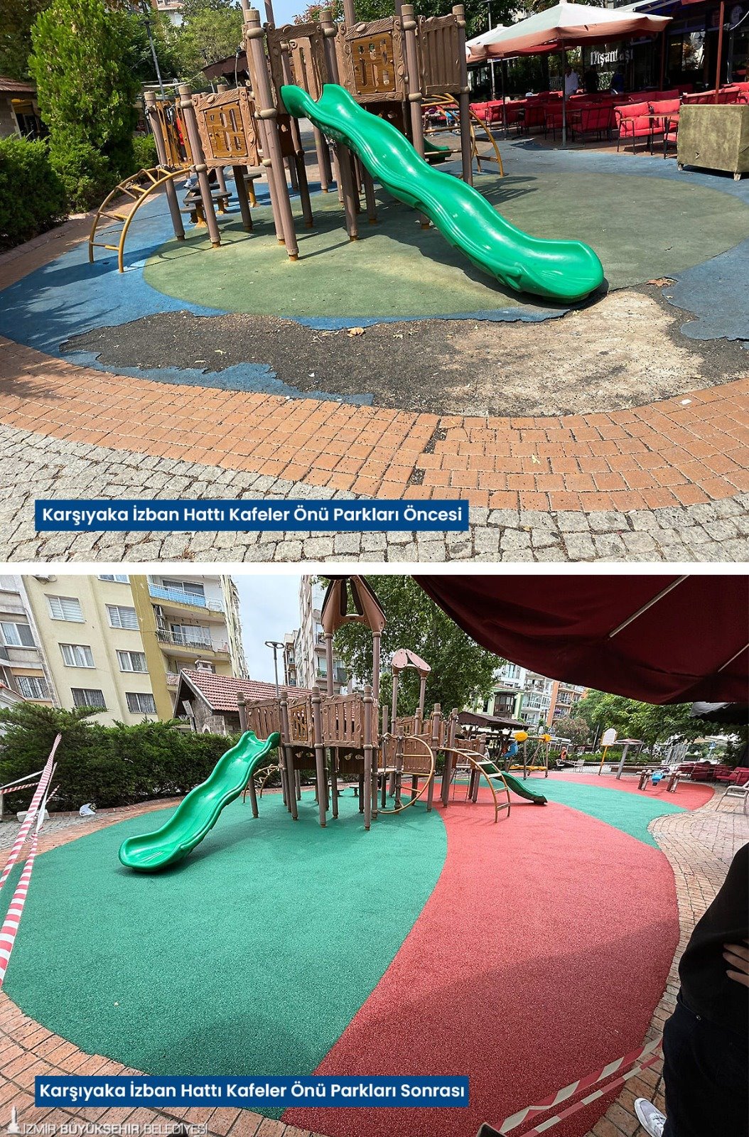 Tartan pistlerin yanı sıra çocukların güvenle parklarda oyun oynayabilmesi için zarar gören kauçuk zeminler baştan sona yenilendi. Karşıyaka’da İZBAN hat boyunda bulunan parklar, Volkan Vedat Akay Parkı, Alaybey’deki kafelerin önündeki parklar, Çiğli İZELMAN Sabiha Gökçen Anaokulu Parkı, Bayraklı 75. Yıl Mahallesi Parkı, Bornova Aşık Veysel Rekreasyon Alanı çocuk oyun alanı, Buca’da Kemal Sunal Parkı, 1081 Sokak Köşesi Parkı, Konak Göztepe’deki kafelerin önündeki parklar, Narlıdere’de İstihkam Lojmanları Parkı, Mahmut Türkmenoğlu Parkı, Menemen Gazi Mahallesi Parkı’nın zemin yenilenmesi tamamlandı. Böylelikle parklar estetik bir görünüme de kavuştu. Onarım ve yenileme çalışmalarının devam edeceği bildirildi.