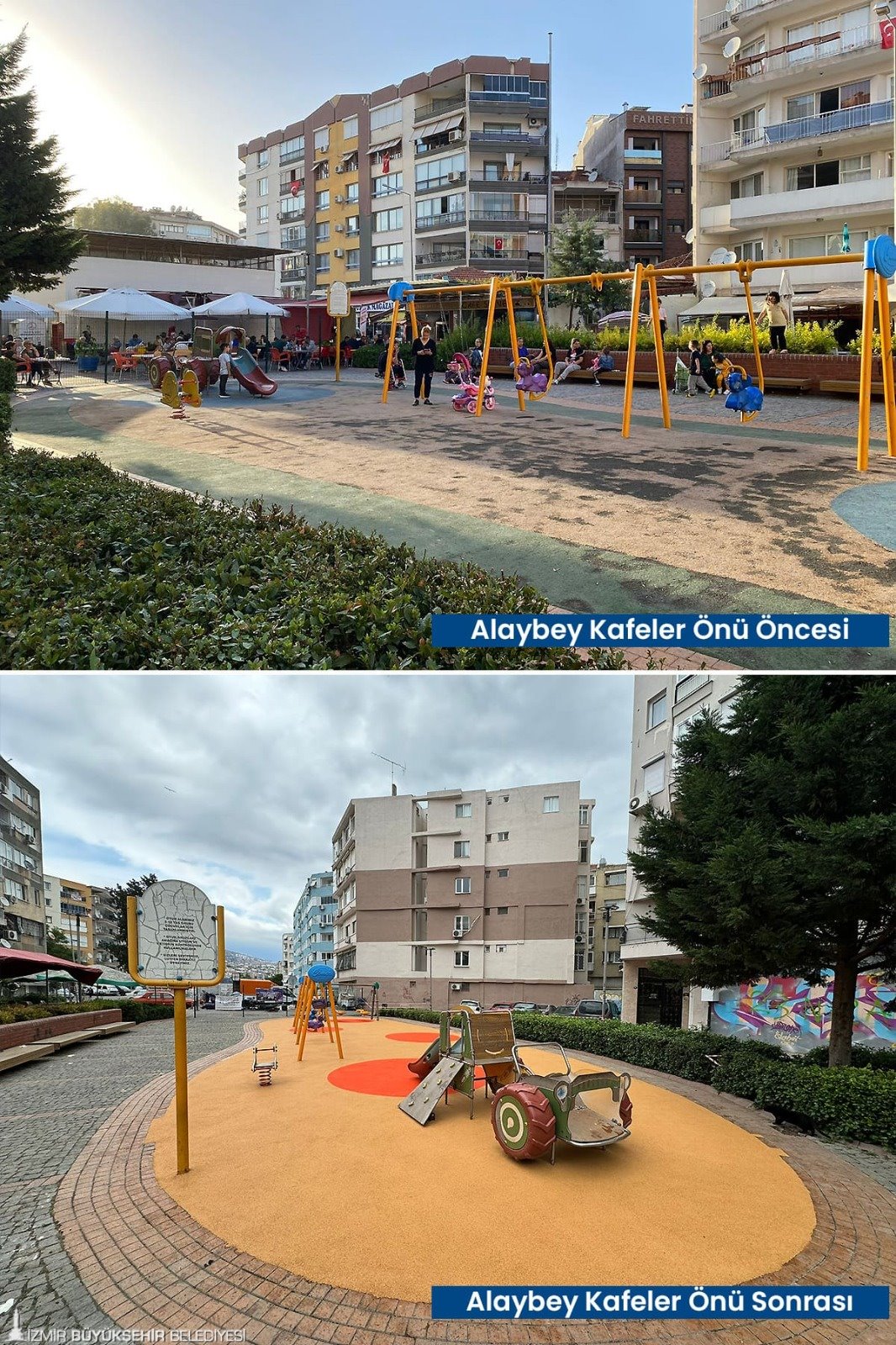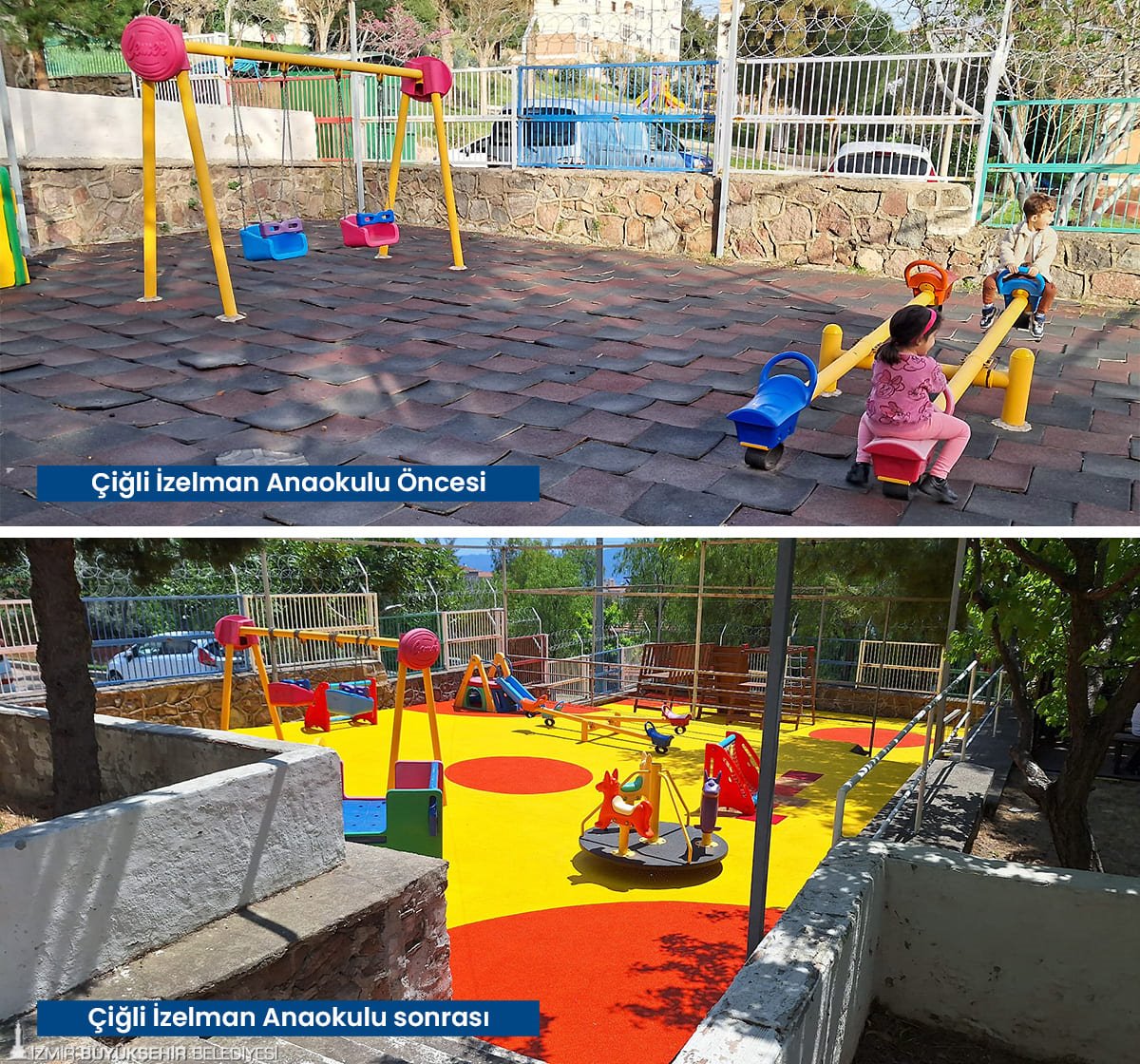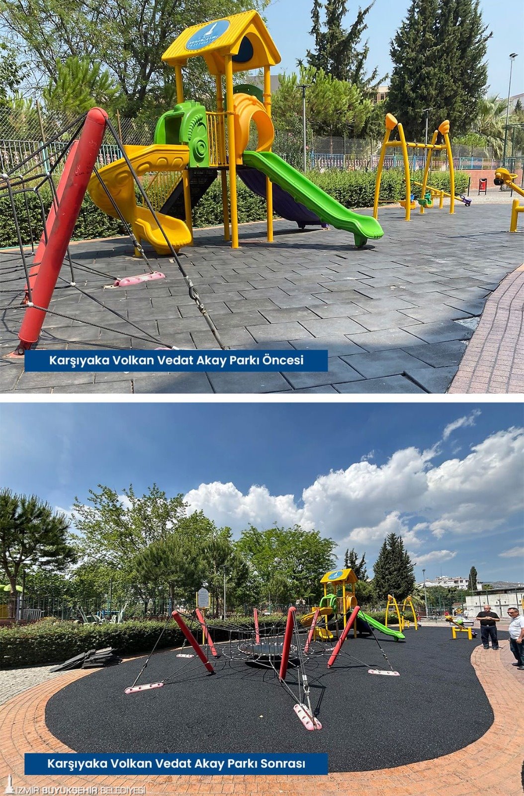 Tartan pistlerin yanı sıra çocukların güvenle parklarda oyun oynayabilmesi için zarar gören kauçuk zeminler baştan sona yenilendi. Karşıyaka’da İZBAN hat boyunda bulunan parklar, Volkan Vedat Akay Parkı, Alaybey’deki kafelerin önündeki parklar, Çiğli İZELMAN Sabiha Gökçen Anaokulu Parkı, Bayraklı 75. Yıl Mahallesi Parkı, Bornova Aşık Veysel Rekreasyon Alanı çocuk oyun alanı, Buca’da Kemal Sunal Parkı, 1081 Sokak Köşesi Parkı, Konak Göztepe’deki kafelerin önündeki parklar, Narlıdere’de İstihkam Lojmanları Parkı, Mahmut Türkmenoğlu Parkı, Menemen Gazi Mahallesi Parkı’nın zemin yenilenmesi tamamlandı. Böylelikle parklar estetik bir görünüme de kavuştu. Onarım ve yenileme çalışmalarının devam edeceği bildirildi.