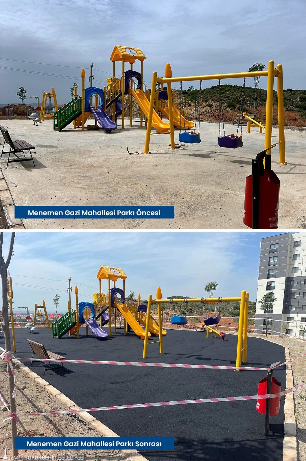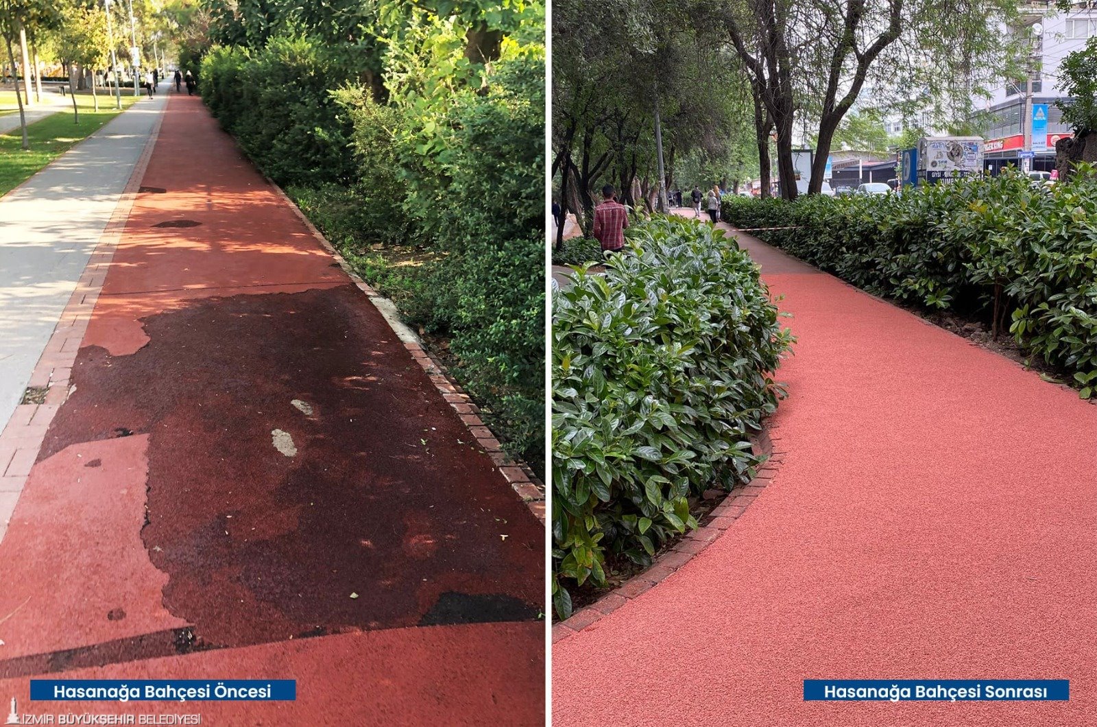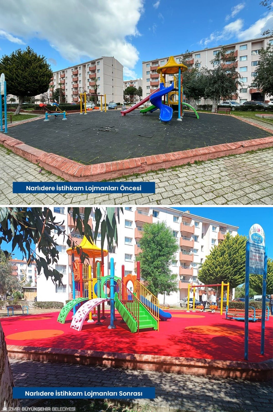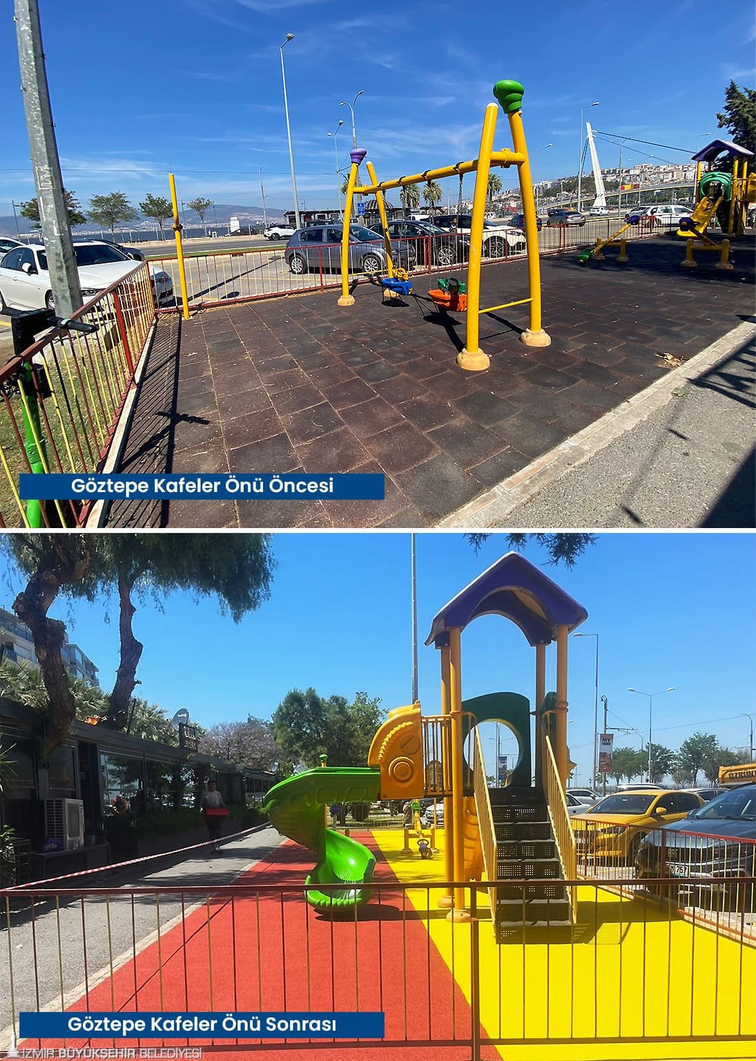 Tartan pistlerin yanı sıra çocukların güvenle parklarda oyun oynayabilmesi için zarar gören kauçuk zeminler baştan sona yenilendi. Karşıyaka’da İZBAN hat boyunda bulunan parklar, Volkan Vedat Akay Parkı, Alaybey’deki kafelerin önündeki parklar, Çiğli İZELMAN Sabiha Gökçen Anaokulu Parkı, Bayraklı 75. Yıl Mahallesi Parkı, Bornova Aşık Veysel Rekreasyon Alanı çocuk oyun alanı, Buca’da Kemal Sunal Parkı, 1081 Sokak Köşesi Parkı, Konak Göztepe’deki kafelerin önündeki parklar, Narlıdere’de İstihkam Lojmanları Parkı, Mahmut Türkmenoğlu Parkı, Menemen Gazi Mahallesi Parkı’nın zemin yenilenmesi tamamlandı. Böylelikle parklar estetik bir görünüme de kavuştu. Onarım ve yenileme çalışmalarının devam edeceği bildirildi.