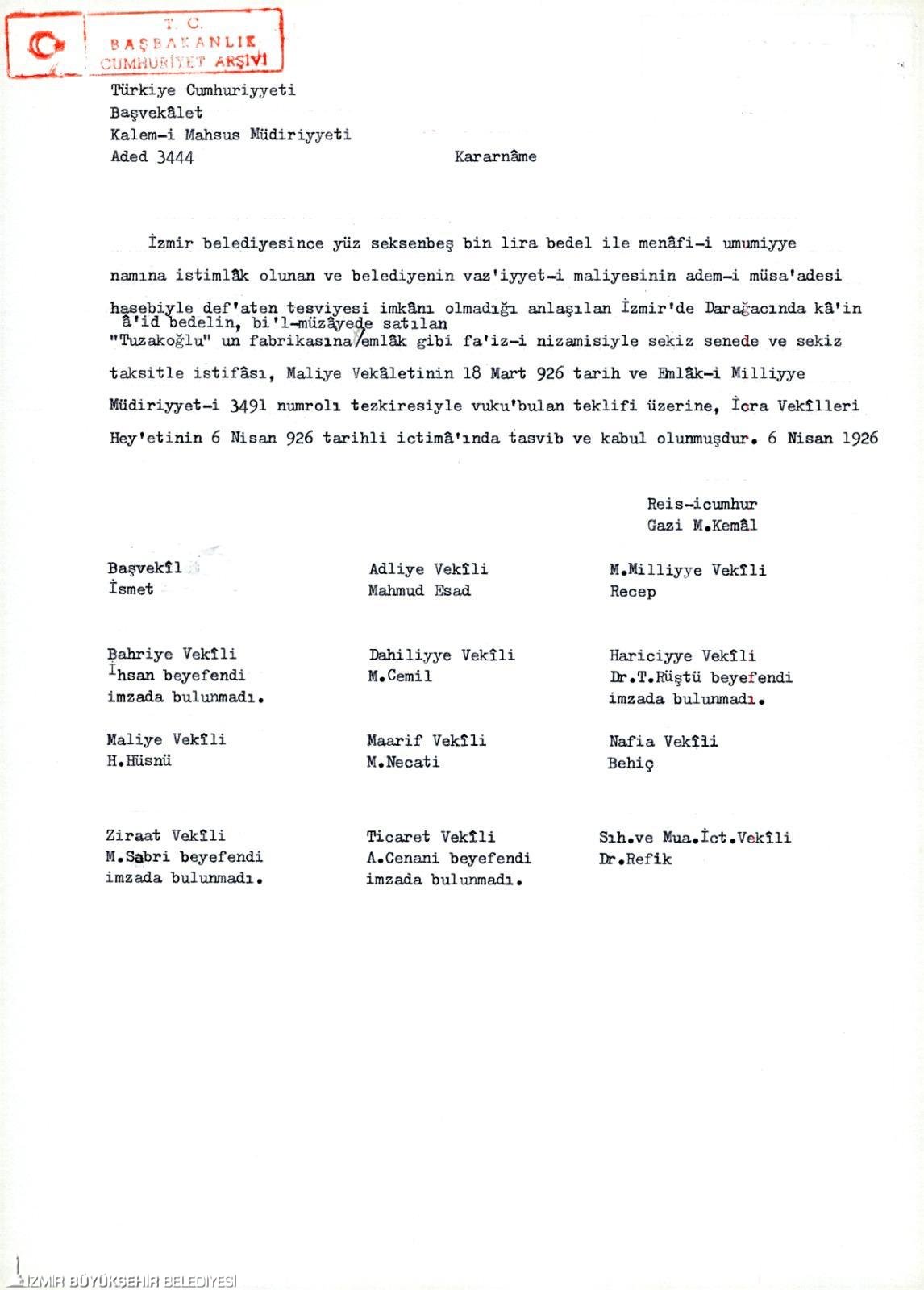 2. 1926 yılında Atatürk ve bakanlar kurulu tarafınca kamulaştırılmış ve İzmir yerel yönetimine verilmiştir.