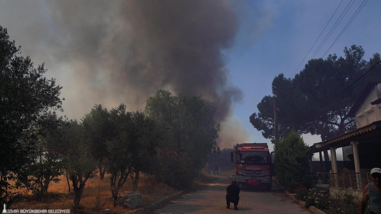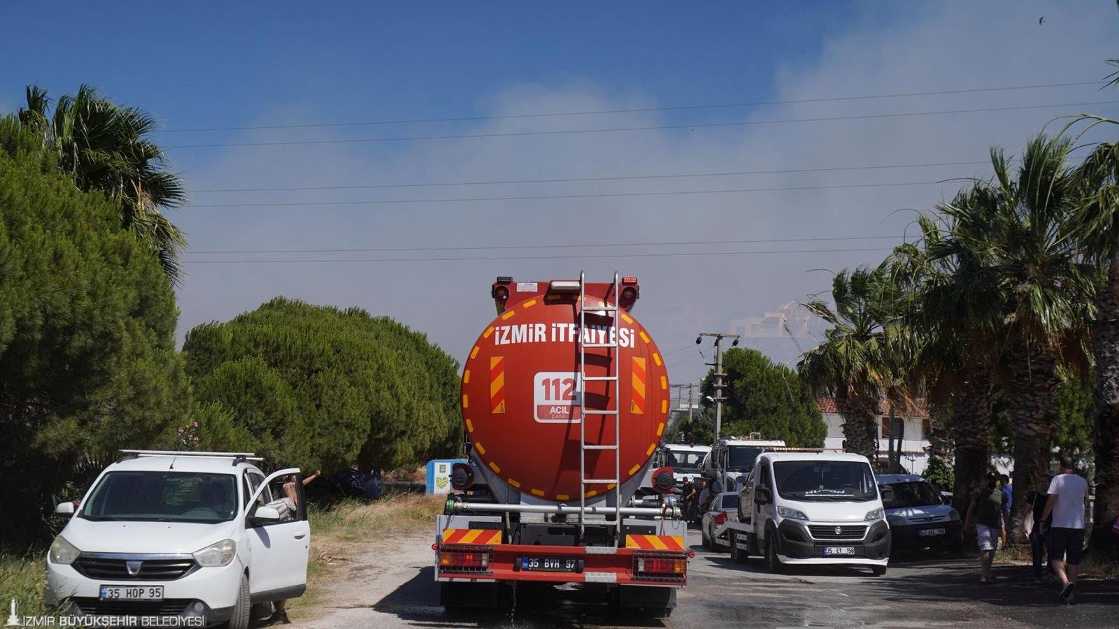 Çeşme ilçesi Ildır Mahallesi’nde saat 14.00’te otluk alanda çıkan yangına İzmir İtfaiyesi ve Orman Bölge Müdürlüğü ekiplerinin müdahalesi sürüyor. 7 itfaiye aracı ve 40 personel ile sahada çalışan İzmir İtfaiyesi yangının yerleşim yerlerine ulaşmasını önlemek için çalışıyor. Orman Bölge Müdürlüğü de 2 helikopter, 4 uçak ile yangına havadan müdahale ediyor. Çeşme Belediyesi birimleri, İlçe Jandarma Komutanlığı ile İzmir AKUT ile komşu ilçe belediyelerine bağlı ekipler yangını söndürmek için yoğun mücadele veriyor. Rüzgarın da etkisi ile yangının Germiyan Mahallesi ve Urla Nohutalan Mahallesi’nde tepede yer alan makilik alana doğru ilerlediği bildirildi. Bu bölgelerde tedbir amaçlı evlerin boşaltılması yönünde uyarı yapıldı. Ildır’da yangının yaşam alanlarına ulaşması sebebiyle riskli bölgelerde bulunan yurttaşların da güvenli bir şekilde tahliyesi sağlandı. Ekipler yangını söndürmek için çalışmalarını sürdürüyor.