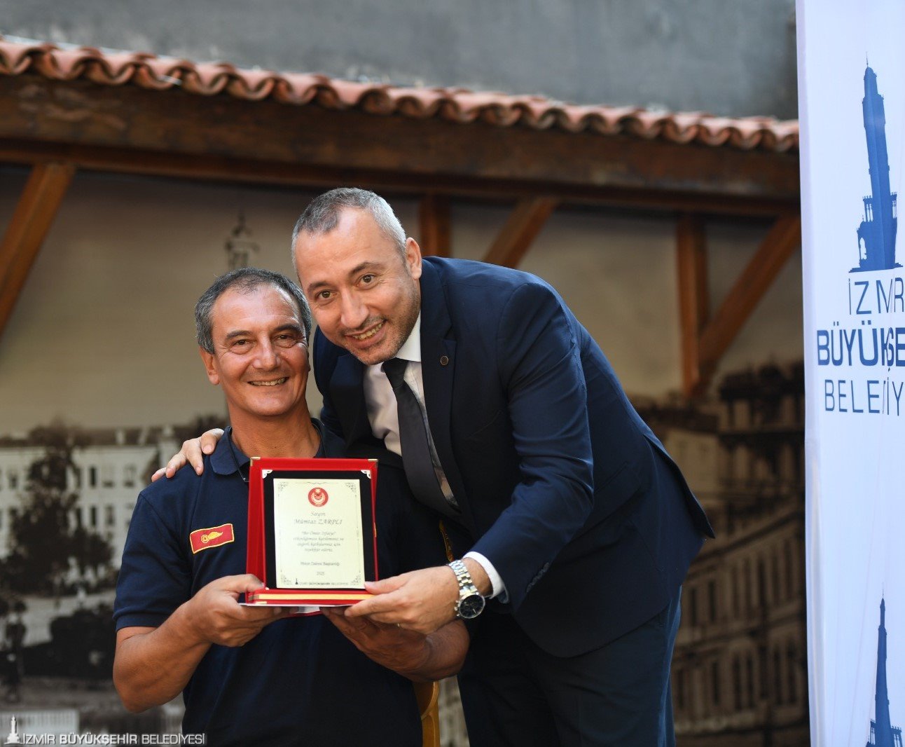 18 yıl önce yangın söndürme tüpü eğitimi sırasında, tüpün patlaması sonucu iki bacağını kaybeden ancak meslekten kopmayan engelli Mümtaz Zarplı da programa katıldı. Zarplı, “Emekli olan büyüklerimiz bu kuruma büyük emek verdi. Biz de bu bayrağı daha ileri taşımak için çalışıyoruz. Emanetçiyiz. Bizden sonraki nesillere, gençlere bayrağı teslim edeceğiz. Elimizden geldiği kadar İzmir halkına faydalı olmaya çalışıyoruz” dedi.