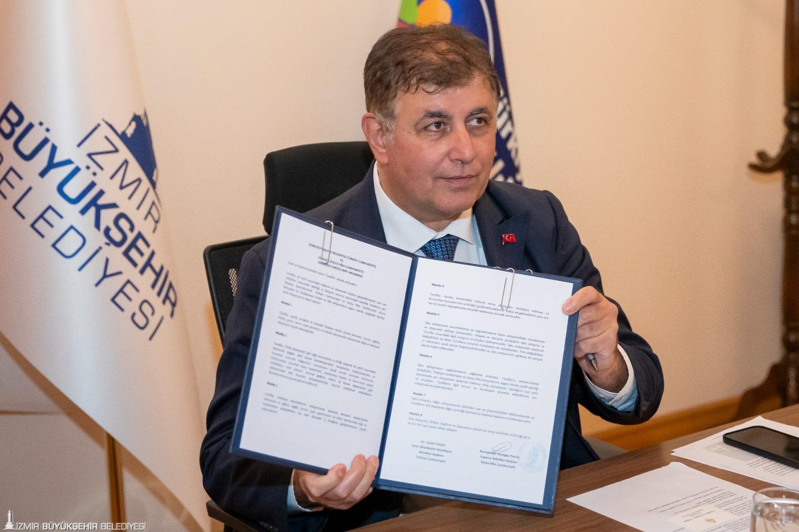 İzmir Büyükşehir Belediye Başkanı Dr. Cemil Tugay, Orta Amerika ülkesi Kosta Rika'nın Esparza kenti ile kardeş şehir protokolünü, Egemenlik Evi Toplantı Salonu’nda düzenlenen törenle imzaladı. Törene Başkan Tugay’ın yanı sıra Kosta Rika Cumhuriyeti Ankara Büyükelçisi Gustavo Campos Fallas, Dışişleri Bakanlığı İzmir Temsilcisi, Büyükelçi Yeşim Kebapçıoğlu, Kosta Rika’nın İzmir Fahri Konsolosu Emre Kızılgüneşler, İzmir Fahri Konsolosluğu İletişim Sorumlusu Mehmet Şenbağcı, İzmir Planlama Ajansı (İZPA) Başkanı Prof. Dr. Koray Velibeyoğlu katıldı. Esparza Belediye Başkanı Bienvenido Venegas Porras ile Türkiye Cumhuriyeti San Hose Büyükelçisi Gökçen Kaya da toplantıya çevrimiçi bağlandı. Bu iş birliği ile iki şehir arasındaki ekonomik ve kültürel ilişkilerin geliştirilmesi, diplomatik bağların güçlendirilmesi hedefleniyor.