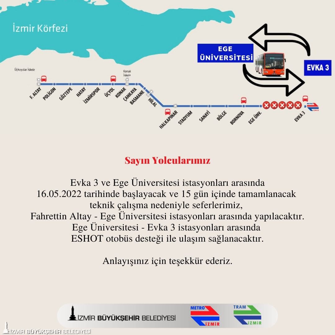 Bu süre içinde metro seferlerinde son durak Bornova İstasyonu olacak. Buradan Ege Üniversitesi İstasyonu’na 6 dakikada bir ring treni çalışacak. Evka 3 Aktarma Merkezi’ne devam edecek yolcular ise Bornova İstasyonu’ndan kalkacak ESHOT otobüslerinden ücretsiz yararlanacak.