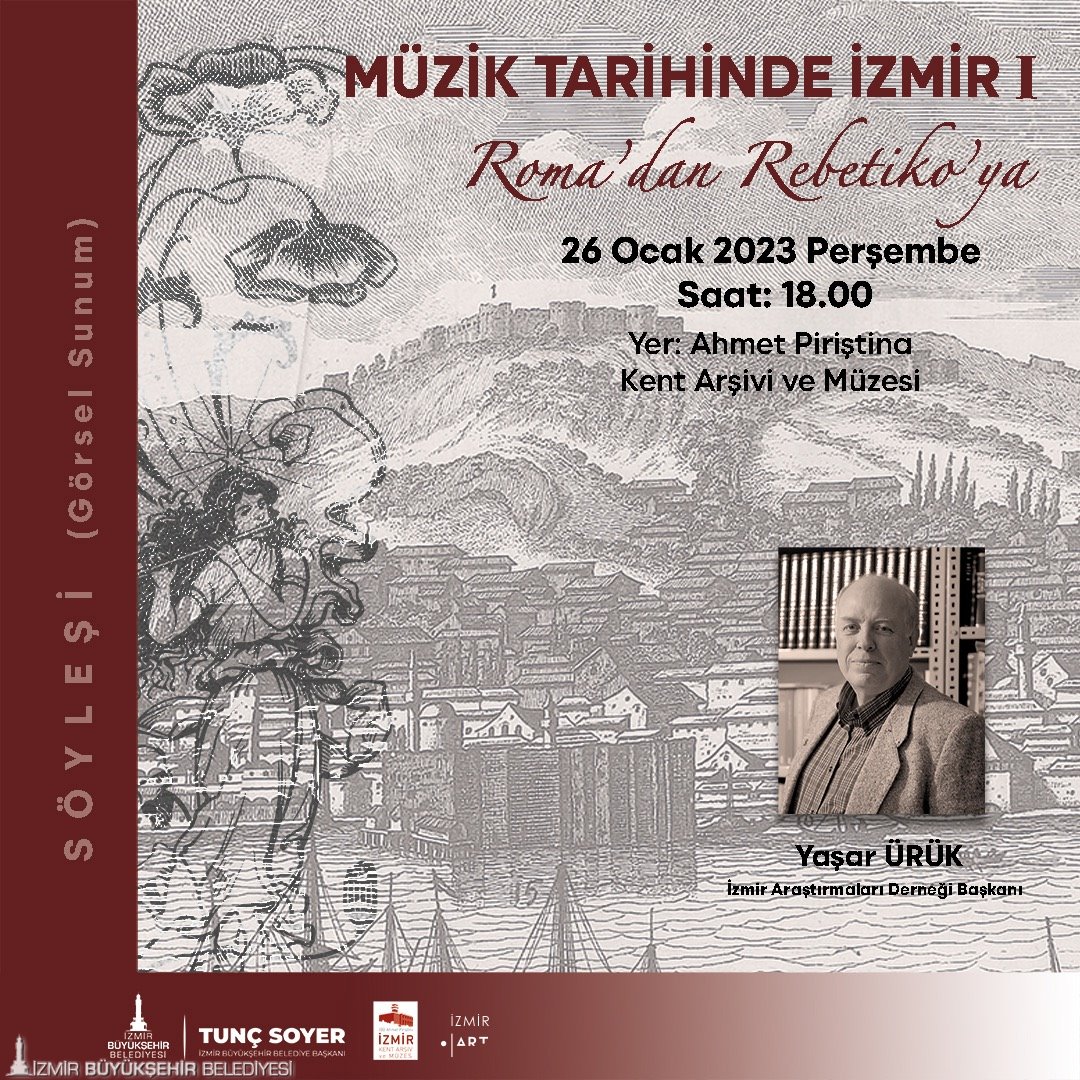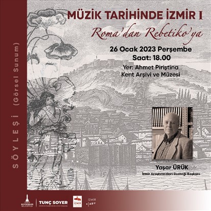 Kent Arşivi, Müzeler ve Kütüphaneler Şube Müdürlüğü tarafından düzenlenen dizinin ilkinde İzmir Araştırmaları Derneği Başkanı Yaşar Ürük “Roma’dan Rebetiko’ya” başlığı altında konuşacak. Ahmet Piriştina Kent Arşivi ve Müzesi (APİKAM) Araştırma ve Toplantı Salonu’nda 26 Ocak Perşembe günü saat 18.00’da başlayacak etkinlikte Ürük, görsel sunumunu dönemsel müzik örnekleriyle süsleyecek.