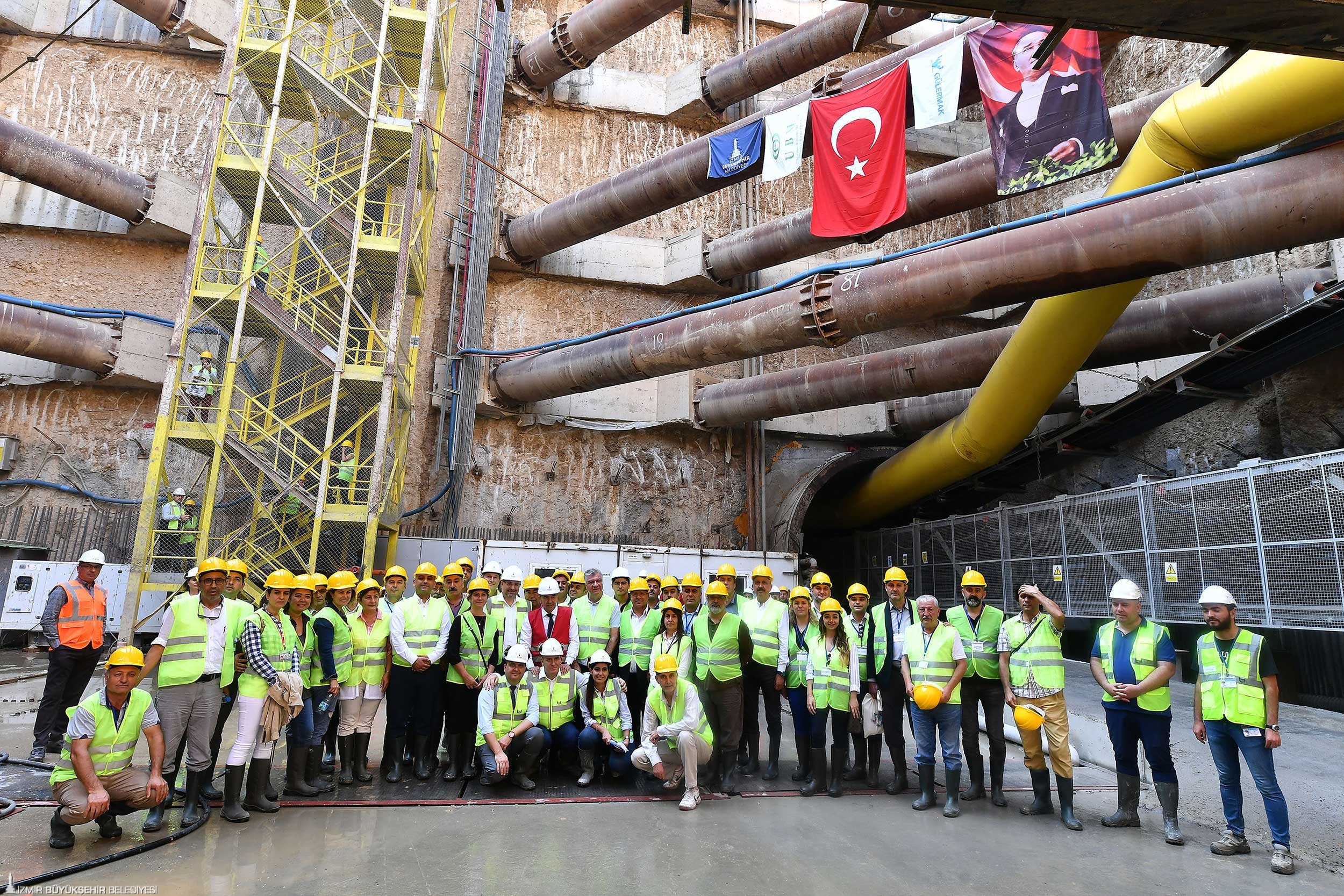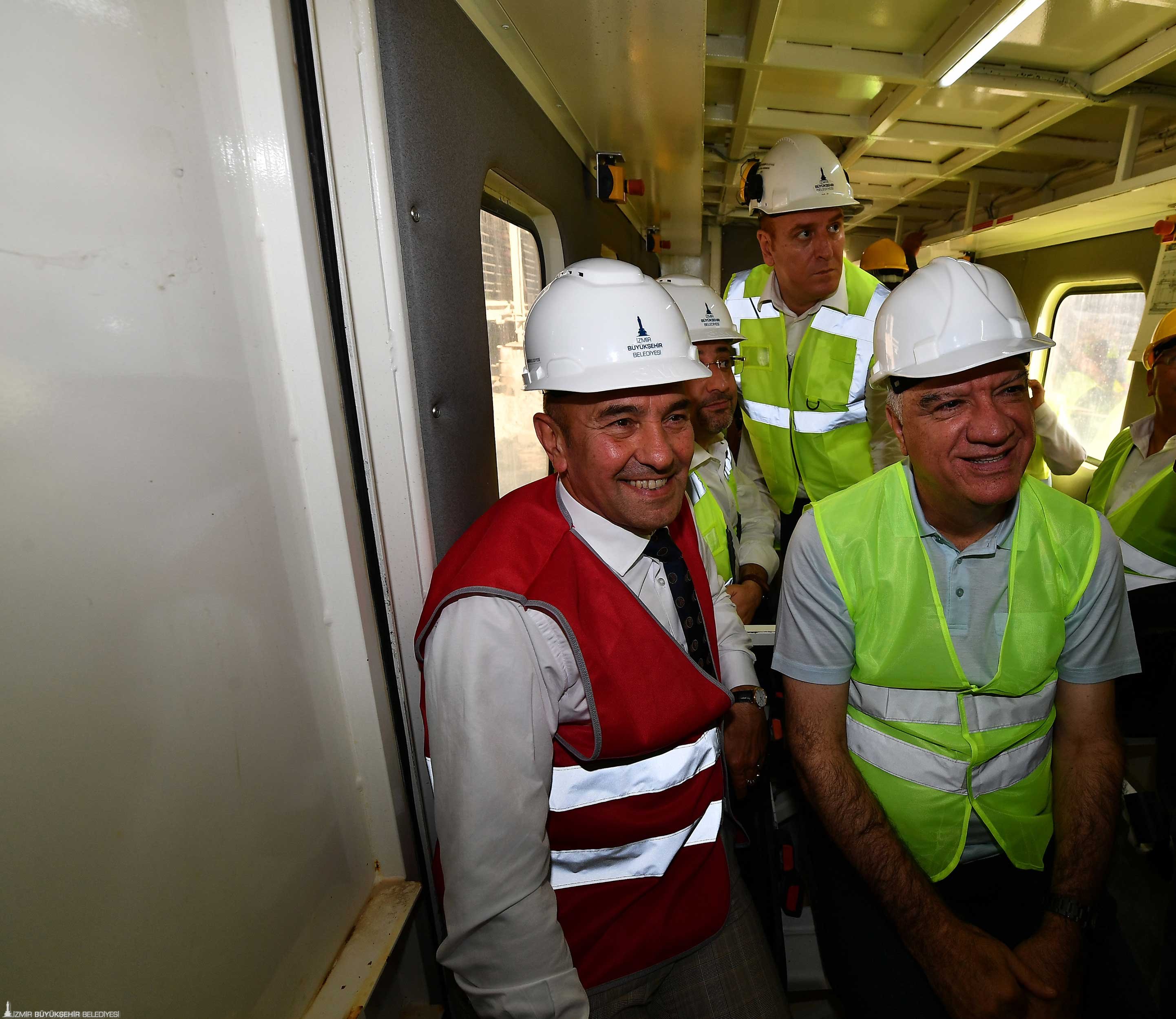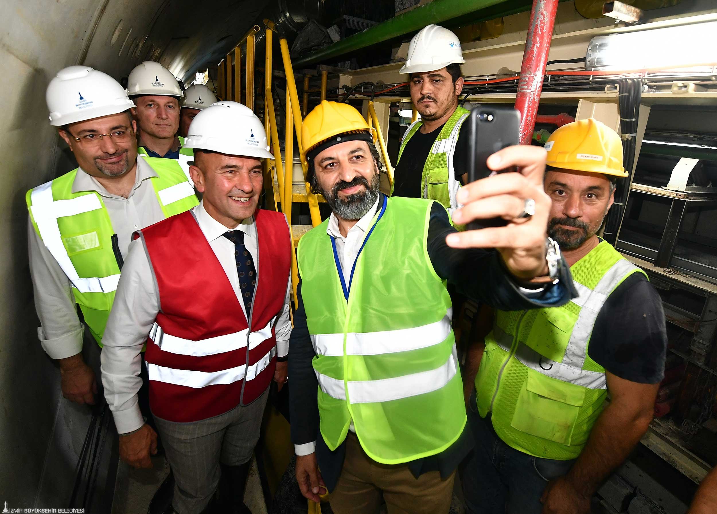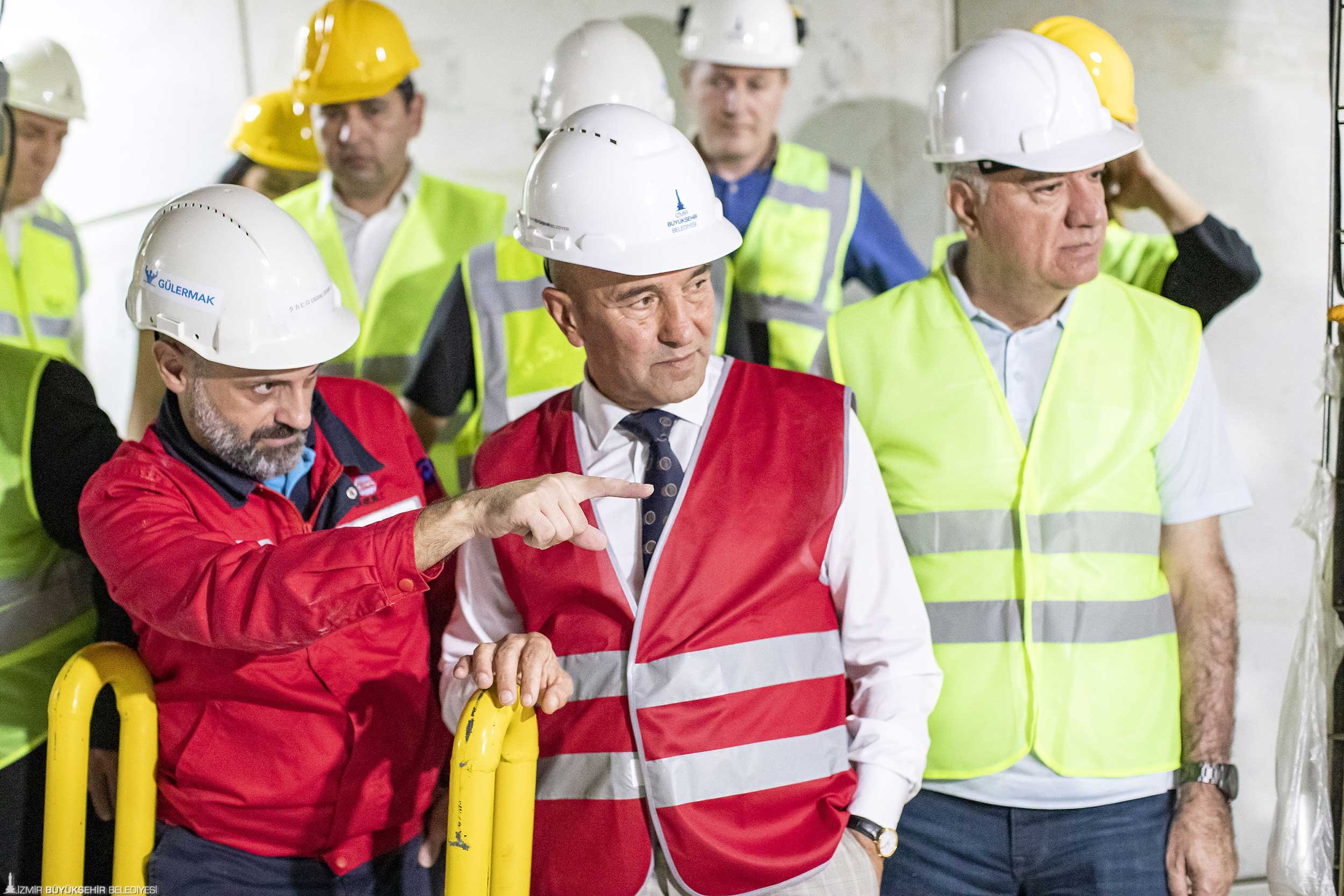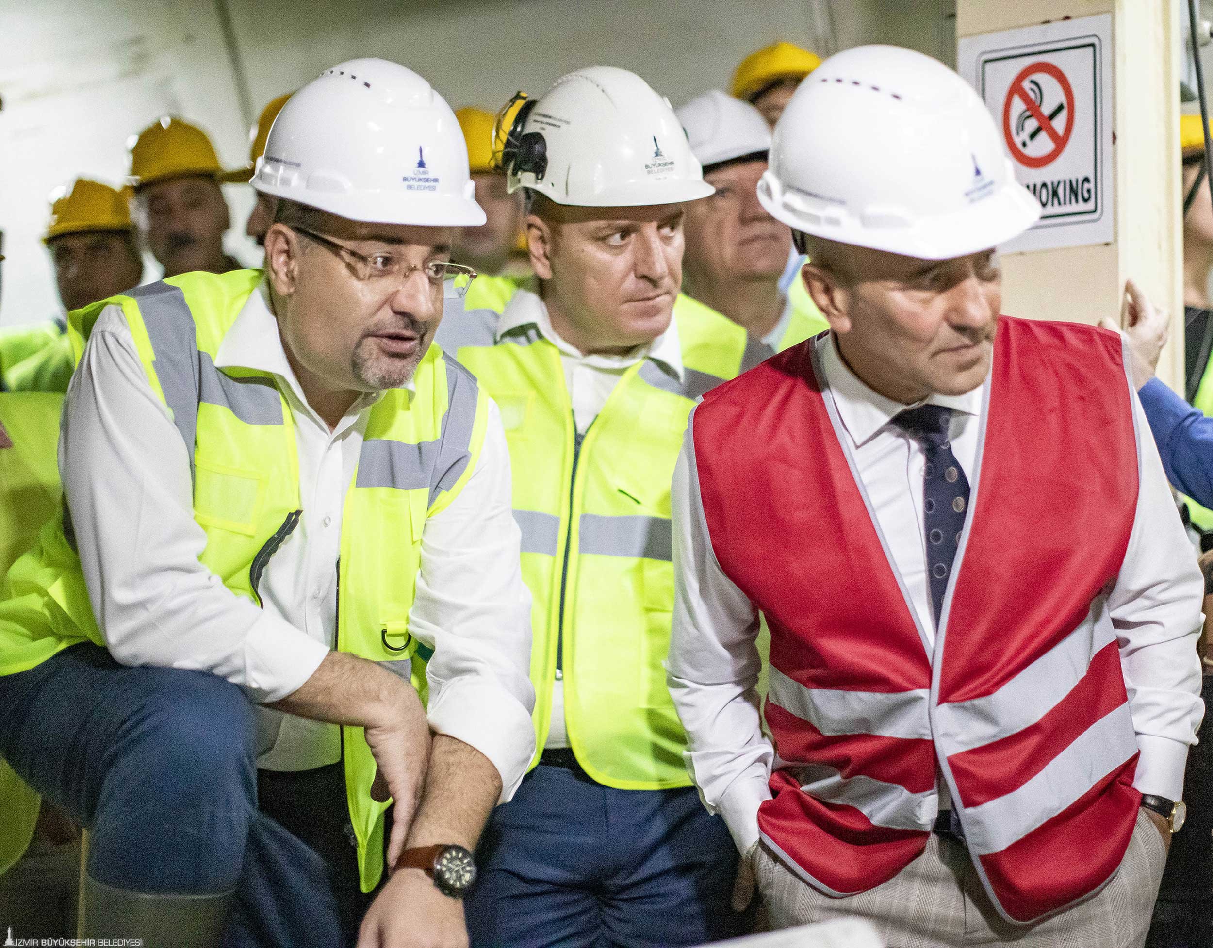 İzmir Büyükşehir Belediye Başkanı Tunç Soyer, belediye başkanları, meclis üyeleri ve muhtarlarla yerin 30 metre altına 155 basamaklı merdivenden inerek çalışmaları yerinde inceledi. 600 metre ilerlemiş tünele giren Soyer, “Türkiye’nin gündemine girmesi gereken bir hikaye bu kadar savaş yaşanırken insanlar bu kadar karamsarlık yaşarken varlığıyla umut veren bir yer. Birçok yerde yatırım durmuşken burada tıkır tıkır işleyen ve belki de Türkiye’nin en büyük yatırımlarından biri olan bu proje hızla devam ediyor. Mühendisinden işçisine kontrolöründen emekçisine hepsiyle iftihar ediyorum. Altı ay içinde işin yüzde 50’si bitecek. Yani işin daha hızlı ilerleyeceği bir döneme gireceğiz, sonrası çok daha kolay olacak” dedi.