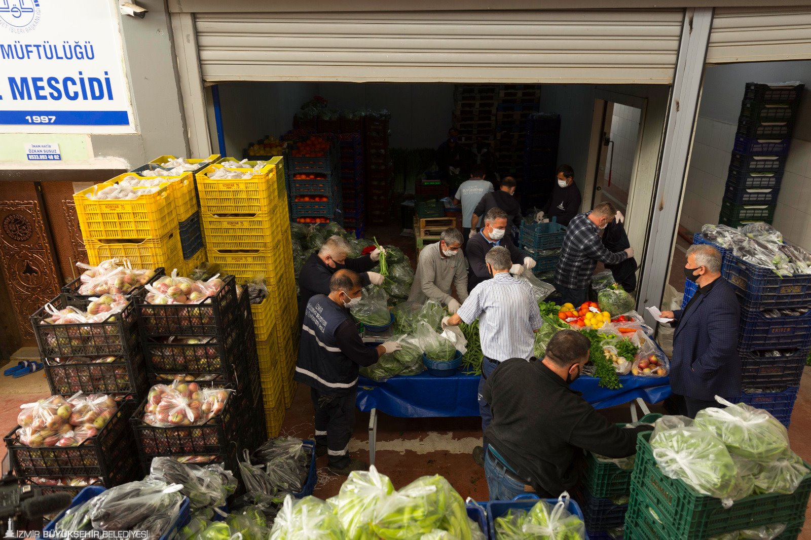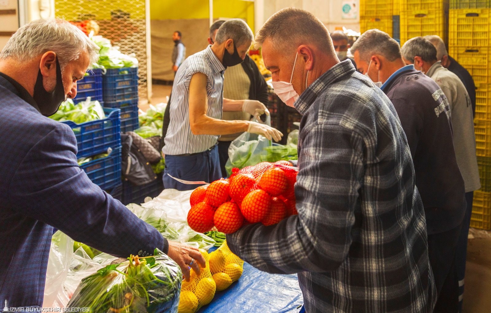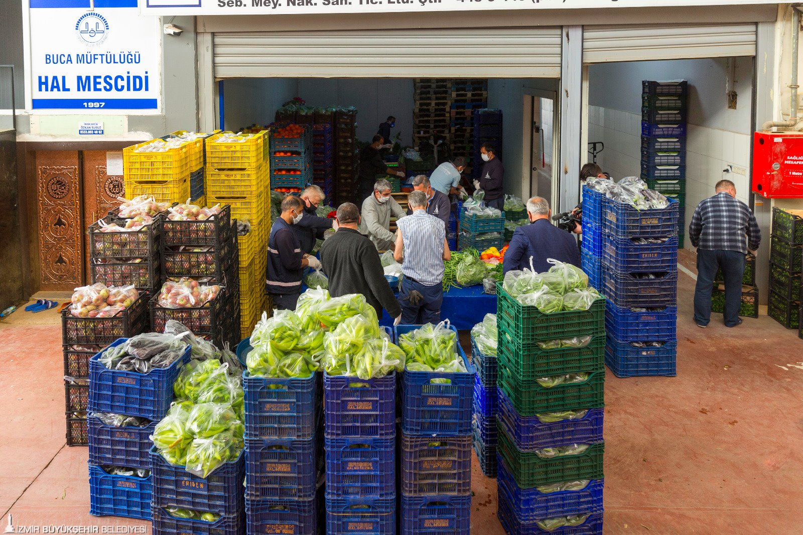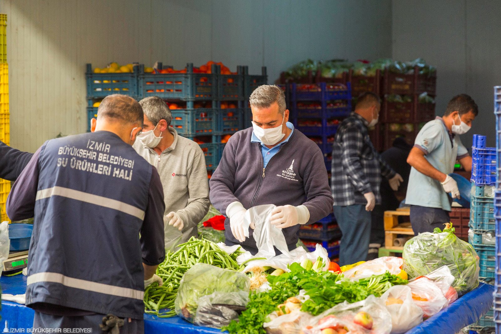 İzmir Büyükşehir Belediye Başkanı Tunç Soyer’in çağrısıyla başlatılan Biz Varız kampanyasına İzmir Büyükşehir Belediyesi Sebze Meyve Hali esnafı da sebze meyve paketleriyle destek oluyor. “Halin kapısını açtık soframızı paylaştık” sloganıyla bir araya gelen 155 kişilik hal esnafı her hafta 700 aile için soğan, patates, domates, salatalık, elma, limon gibi 18 kalemden oluşan 22 kilogramlık paketler hazırlıyor. Paketler Büyükşehir Belediyesi’nin ekipleri tarafından destek olunması gereken ailelere ulaştırılıyor.