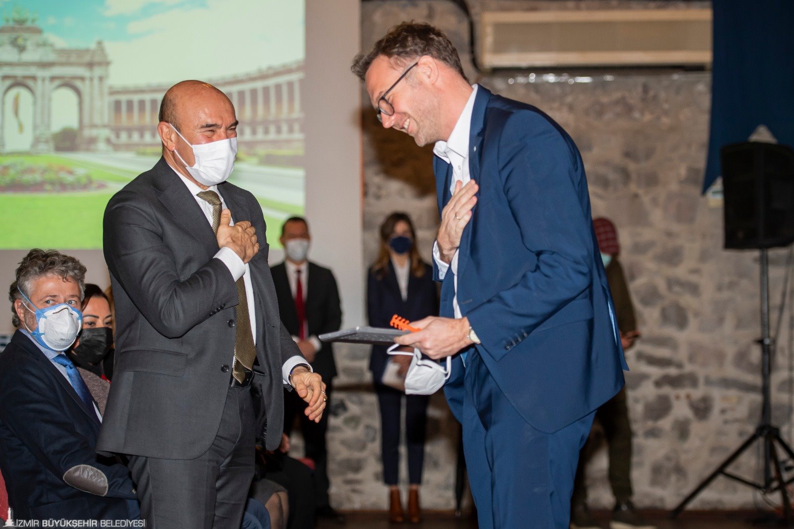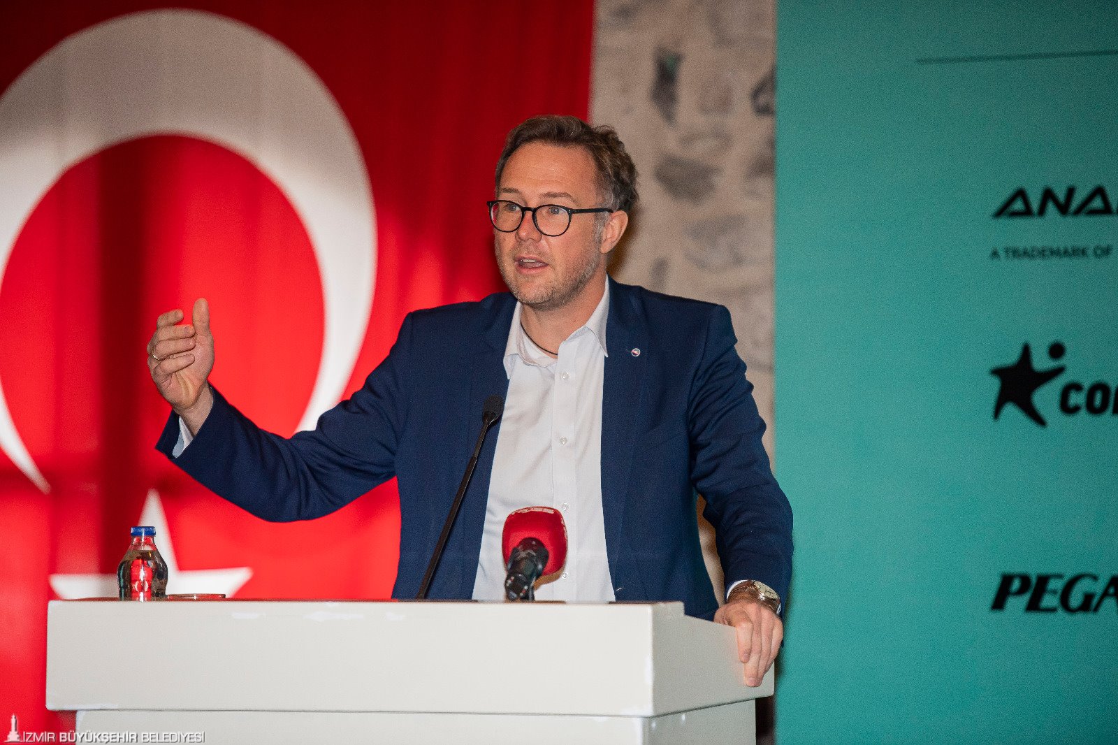 Konuşmasında göreve başlamadan önce sözünü verdiği gibi İzmir turizminin muazzam potansiyelini ortaya çıkarmak için var gücüyle çalışmaya devam ettiklerini de vurgulayan Başkan Soyer “2021 başında İzmir Turizm Stratejisi’ni İzmir Büyükşehir Belediyesi, İzmir Kalkınma Ajansı ve İzmir Vakfı ortaklığıyla yayınlamıştık. Şimdi bu stratejide her ne yazıyorsa, kent paydaşlarımızla birlikte teker teker uyguluyoruz. Bu süreçte dijital turizm altyapısını kuran Türkiye’deki ilk şehir olduk. Visitİzmir mobil aplikasyonunu yayınlayarak İzmirlilerin, turistlerin ve sektörün hizmetine sunduk. Pandeminin derinden sarstığı sektörü desteklemek için Türkiye’nin ilk güvenilir destinasyon sistemini, Turuncu Çember hijyen sertifikasını uygulamaya koyduk” dedi.