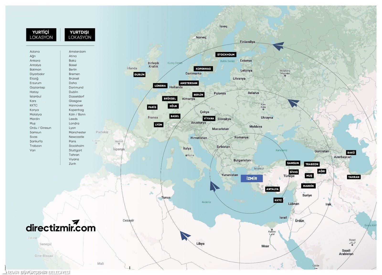 İzmir Büyükşehir Belediyesi ve İzmir Vakfı Başkanı Tunç Soyer, şehrin turizm potansiyelini artırma hedefi doğrultusunda “Direct İzmir” adıyla yeni bir projeyi daha hayata geçirdi. İzmir’den dünyaya, dünyadan İzmir’e yapılan direkt uçuşların tanıtımını yapan directizmir.com web sitesi, İzmir Vakfı ile Corendon Airlines, Pegasus Hava Yolları, SunExpress Hava Yolları ve Türk Hava Yolları’nın imzaladığı ortaklık protokolüyle hizmete açıldı.