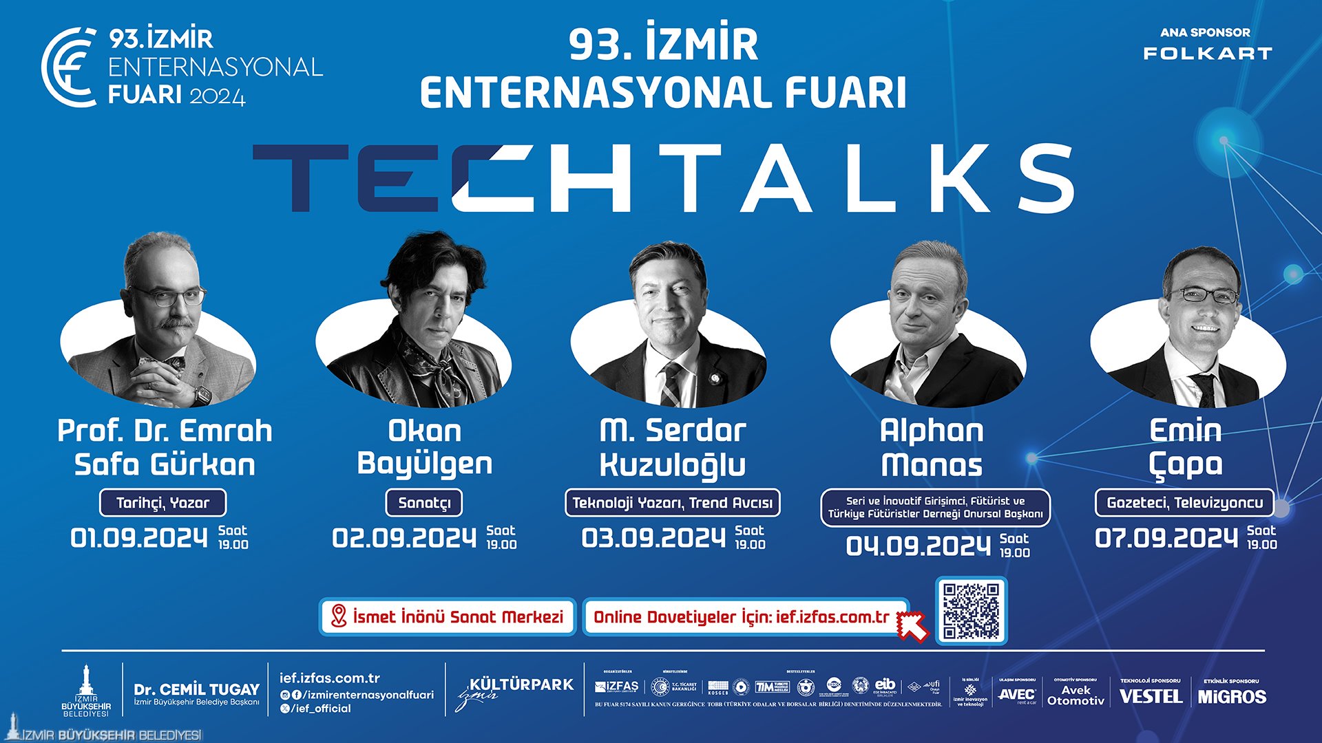 İZFAŞ ve İzmir İnovasyon ve Teknoloji AŞ’nin birlikte düzenlediği ‘TechTalks’ isimli söyleşilerde, Türkiye’nin merakla, ilgiyle, bilgilenerek dinlediği isimler, İsmet İnönü Sanat Merkezi’ndeki TechTalks etkinliğinde buluşacak. 1 Eylül günü tarihçi, akademisyen Prof. Dr. Emrah Safa Gürkan, 2 Eylül’de sanatçı Okan Bayülgen, 3 Eylül’de teknoloji yazarı, trend avcısı Serdar Kuzuloğlu, 4 Eylül’de seri ve inovatif girişimci, fütürist ve Türkiye Fütüristler Derneği Onursal Başkanı Alphan Manas, 7 Eylül’de gazeteci ve televizyoncu Emin Çapa konuşmacı olarak yer alacak.