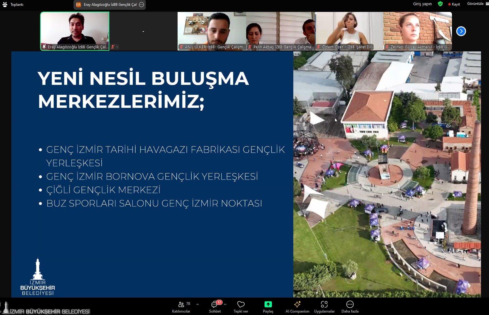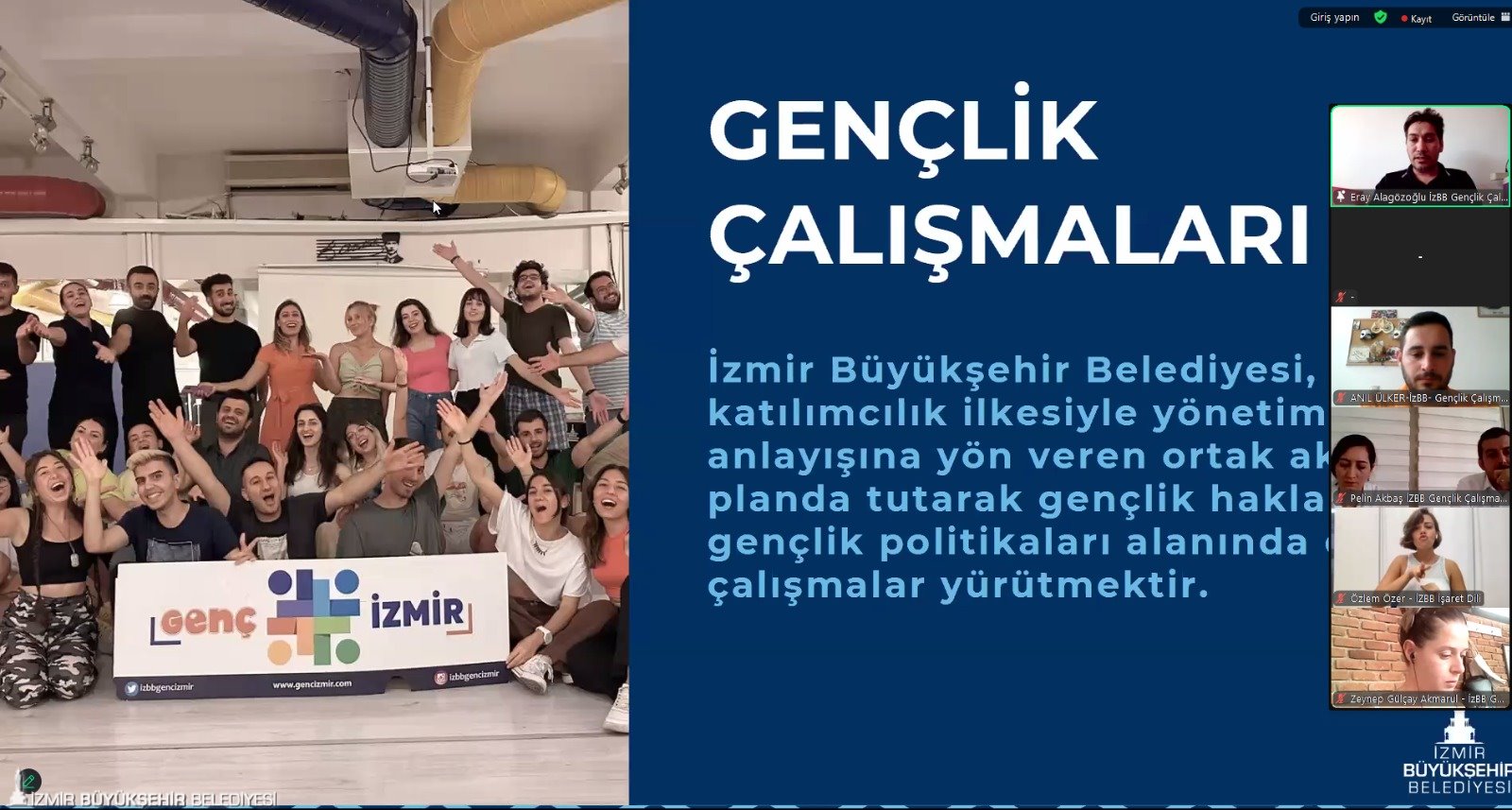 İzmir Büyükşehir Belediyesi “Genç Perspektifiyle İzmir” çalıştayı düzenledi. Gençlik ve Spor Hizmetleri Dairesi Başkanlığı’nın organize ettiği e-çalıştayda Büyükşehir Belediyesi’nin 2025-2029 yıllarını kapsayan yeni Stratejik Planı’nın hazırlık sürecinde etkileşim içinde olunan paydaşların görüşleri alındı. Katılımcılığı temel alan İzmir Büyükşehir Belediyesi, ihtiyaçlar ve taleplerle hizmet yol haritasını şekillendirmeyi hedefliyor.
