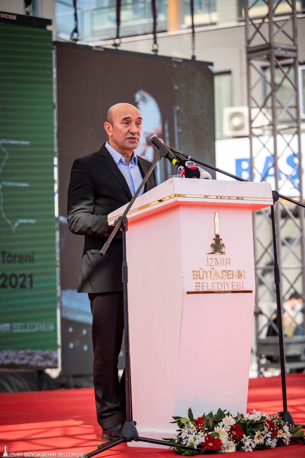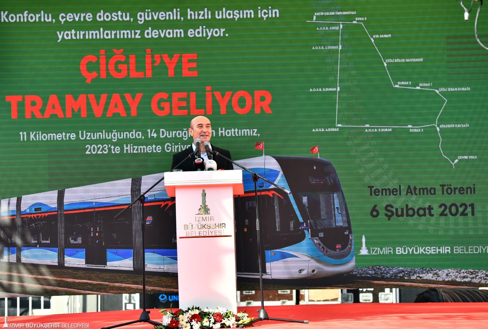 Törende konuşan İzmir Büyükşehir Belediye Başkanı Tunç Soyer, İzmir için tarihi bir günde bir arada olduklarını belirterek, 414 milyon 182 bin liralık yatırımla sözleşmesi imzalanan Çiğli Tramvayı'nın temelini atmanın mutluluğu ve gururunu yaşadıklarını belirterek hattın Çiğli halkına hızlı, alternatifli ve konforlu toplu ulaşım kolaylığı sağlayacağına işaret etti. Çiğli Tramvay ihalesinde bir ilki gerçekleştirerek yüklenici firmaya yeni mezun mühendis ve mimar istihdam etme zorunluluğu getirdiklerini hatırlatan Soyer, "Bu örnek uygulamamız sayesinde yeni mezun gençlerimizin mesleki kariyerlerine adım atmaları konusunda önemli bir katkı sağlamış olduk. İzmir Büyükşehir Belediyesi bundan sonraki ihalelerde bu uygulamaya devam edecek" dedi.