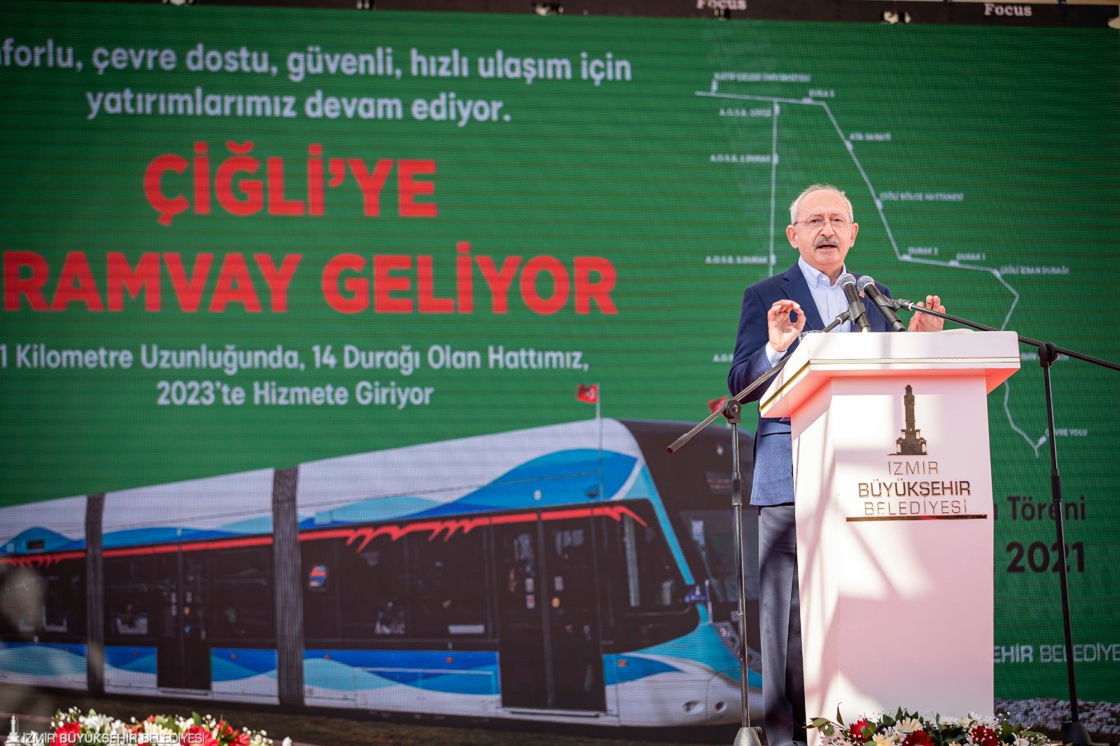 İzmir Büyükşehir Belediyesi raylı sistem yatırımlarına bir halka daha ekledi. Çiğli trafiğine nefes aldıracak, bu bölgedeki hastane, üniversite ve sanayiye ulaşımı kolaylaştıracak 11 kilometrelik Çiğli Tramvay hattının temeli Cumhuriyet Halk Partisi (CHP) Genel Başkanı Kemal Kılıçdaroğlu'nun katıldığı törenle atıldı.