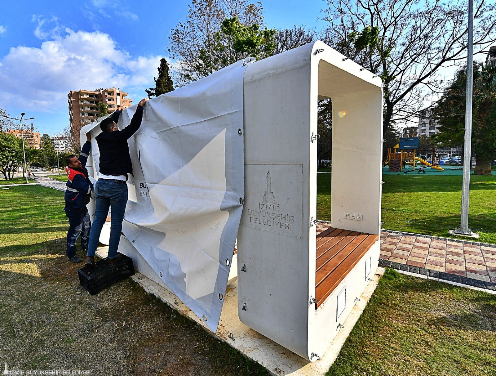 İzmir Büyükşehir Belediyesi Park ve Bahçeler Dairesi Başkanlığı Yeşil Alanlar Planlama Proje Şube Müdürü Müge Deniz Bal, İzmir depreminin ardından parkların ihtiyaçlarını yeniden gözden geçirdiklerini, buna uygun tasarımlar üretmeye başladıklarını söyledi. Yurttaşların günlük kullanımda konforunu artıran, acil durumlarda ihtiyaçlarını karşılayan kent mobilyalarını ilk olarak bu parkta kullanmaya başladıklarını ifade eden Müge Deniz Bal, “Hasan Ali Yücel Parkı’nda üç takımdan oluşan prototip mobilyalar bulunuyor. Kilitli depo haznesi var. Kilitli depo haznesinde acil ihtiyaçlara karşılık verebilecek su, acil sağlık çantası, battaniye gibi ürünler de yer alıyor. Enerjisini güneşten alan ve afet alnında olası bir elektrik kesilmesi sırasında elektrik hizmeti veren bir ünitemiz ve bu ünitede wi-fi bağlantısı var. Ayrıca engelli araçlarının şarjı da buradan sağlanabiliyor. Bu üniteleri deprem anında vatandaşlarımızı olumsuz hava koşullarından korumak için kapalı bir alan haline getirebiliyoruz” dedi. Bal, deprem parklarını İzmir genelinde yaygınlaştırmayı planladıklarını da aktardı.