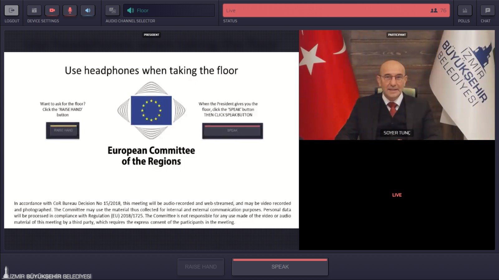 Toplantıya TC Dışişleri Bakan Yardımcısı Faruk Kaymakcı, TC AB Nezdinde Türkiye Daimi Temsilcisi, Büyükelçi Mehmet Kemal Bozay, AB Komisyonu Genişleme Müzakereleri Genel Müdürlüğü Türkiye Daire Başkanı Bernard Brunet ve Strateji Direktörü Merriam Ferran da katıldı. Avrupa Birliği Bölgeler Komitesi Türkiye Grubu Başkanı Danimarka Haderslev Belediye Meclis Üyesi Jens Christian Gjesing, İzmir Büyükşehir Belediye Başkanı Tunç Soyer’e verdiği güçlü mesajlardan dolayı teşekkür etti.