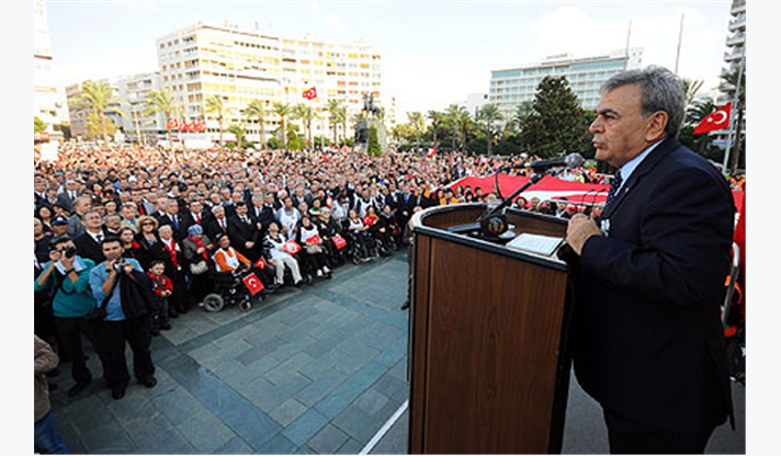 Cumhuriyet Meydanı’nda yaptığı konuşmada Ulu Önder’e duyulan özlemi dile getiren İzmir Büyükşehir Belediye Başkanı Aziz Kocaoğlu, “Bu yıl üçüncüsünü gerçekleştirdiğimiz Atatürk’e saygı yürüyüşü, kadınıyla erkeğiyle, genciyle çocuğuyla; birliğimizi ve dirliğimizi hep koruyacağımızı; ayrıya-gayrıya düşmeden, düşürülmeye asla izin vermeden, Cumhuriyet’e ve ilkelerine hep bağlı kalacağımızı anımsamak ve anımsatmaktır” dedi.