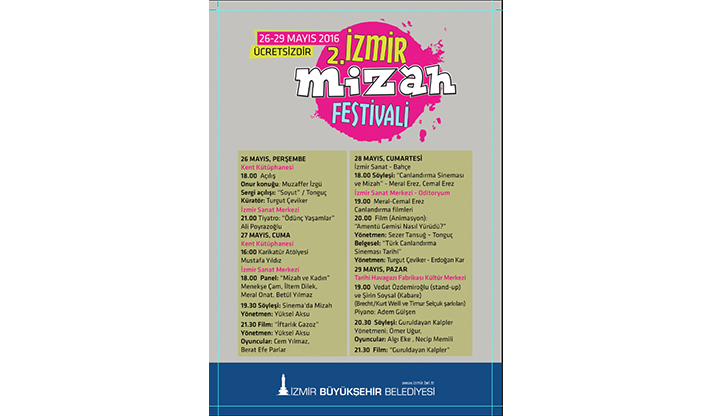 İzmir Büyükşehir Belediyesi, geçtiğimiz sene Aziz Nesin’in doğumunun 100. yılında başlattığı “İzmir Mizah Festivali”nin bu yıl 2.sini gerçekleştirecek. 26-29 Mayıs tarihleri arasında İzmir Sanat Merkezi, Havagazı Fabrikası ve Kent Kütüphanesi'nde düzenlenecek etkinlikler kapsamında, edebiyat, karikatür, tiyatro ve sinema alanlarında söyleşi, atölye, sahne ve film gösterileri yer alacak.