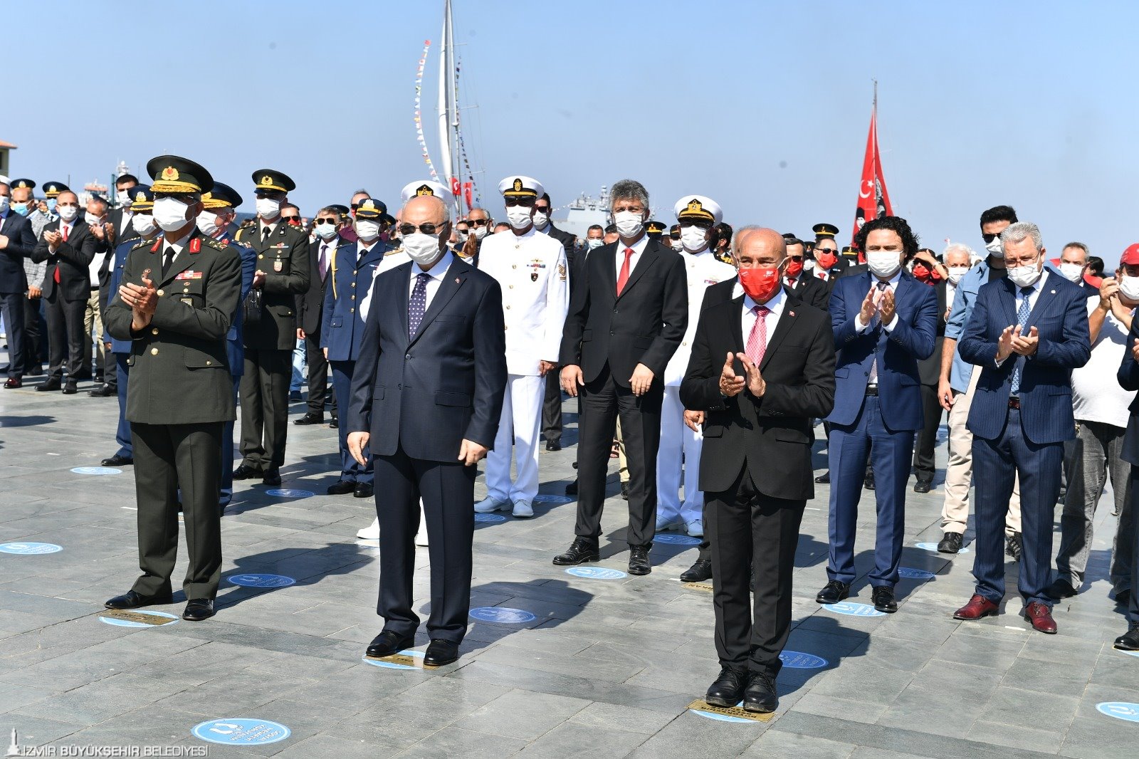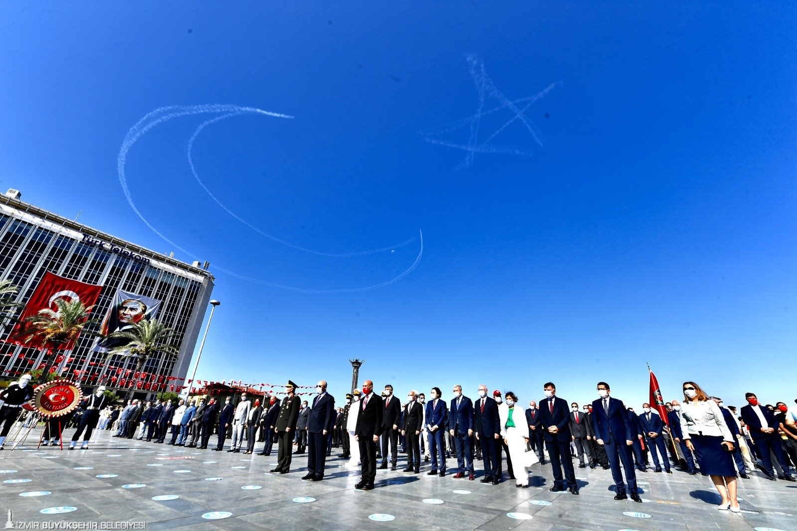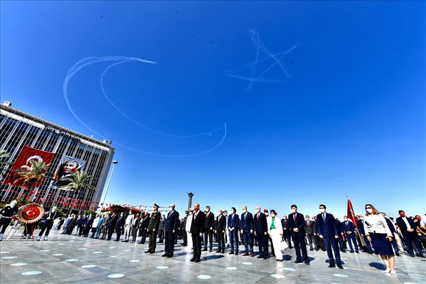 Mahmut Atilla Kaya, Necip Nasır, Cemal Bekle, İzmir'deki üniversitelerin rektörleri, siyaset ve iş dünyasının temsilcileri katıldı. Cumhuriyet Meydanı'nda bulunan Atatürk Anıtı'na çelenk sunulmasının ardından tören saygı duruşu ve İstiklal Marşı'nın okunmasıyla devam etti. Tören boyunca selamlama uçuşu yapan Türk Yıldızları ile Solotürk, gökyüzüne ay ve yıldız çizdi. Cumhurbaşkanı Recep Tayyip Erdoğan'ın mesajı da törende okundu.