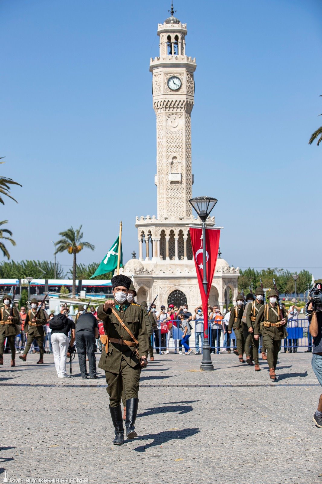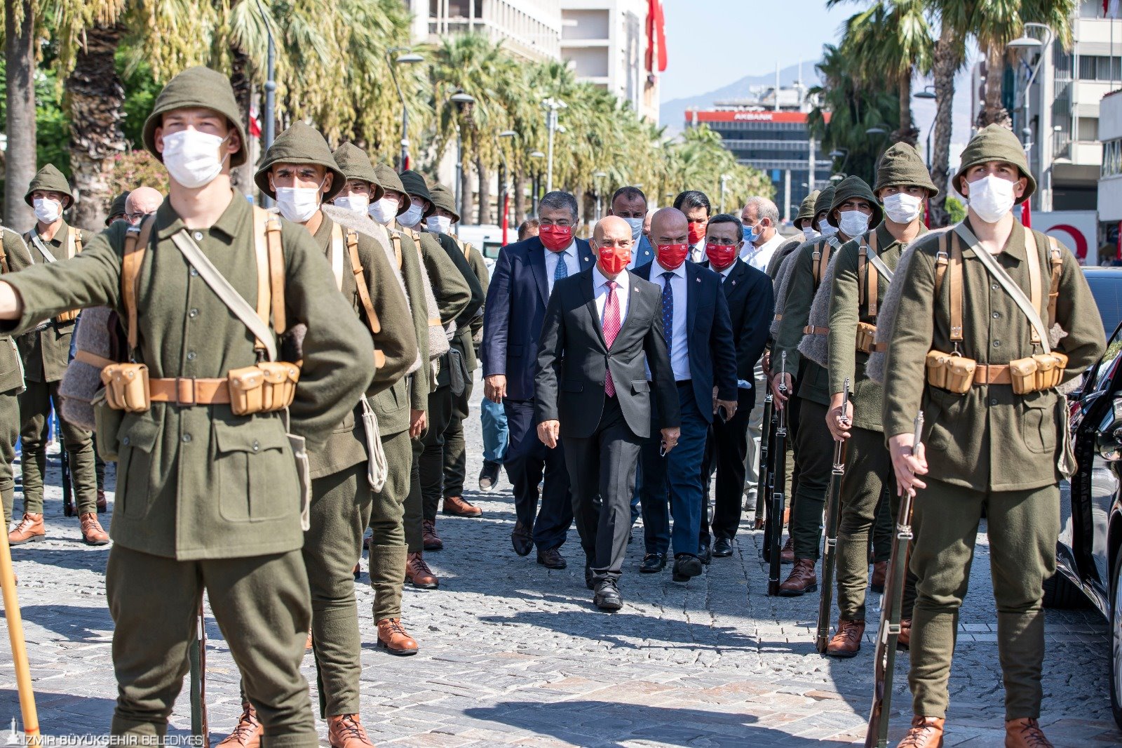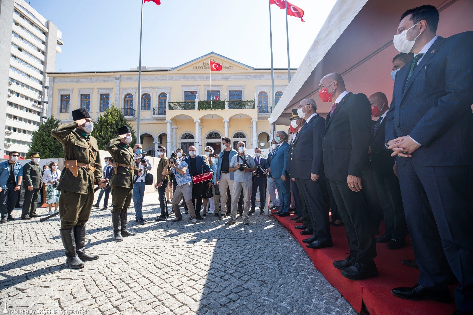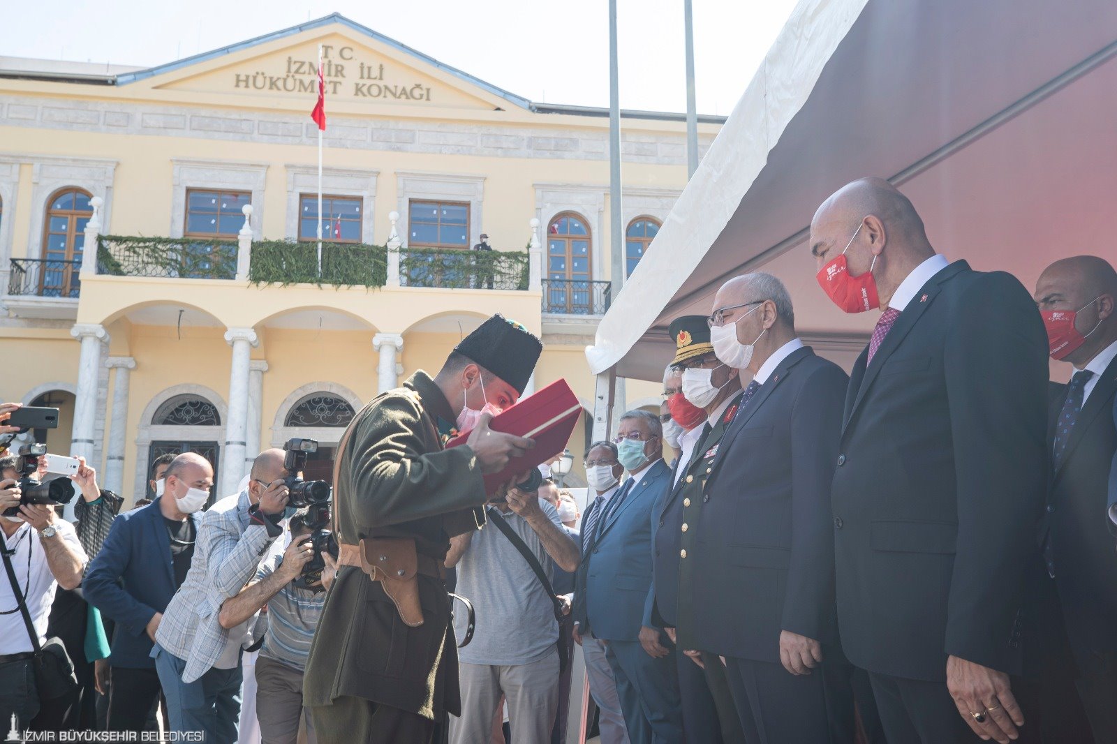 Cumhuriyet Meydanı’ndaki programın ardından İzmir Valiliği önündeki törene geçildi. Burada da 98 yıl önce ilk birliklerin İzmir’e girişi canlandırıldı. İzmir Valiliği'nde Türk bayrağının göndere çekildiği anlar, herkesi yeniden duygulandırdı. Ardından birlik komutanı İzmir Valisi Yavuz Selim Köşger'e Türk bayrağı verdi. İzmir Büyükşehir Belediye Başkanı Tunç Soyer de birlik komutanına plaket verdi. Türkiye Emekli Subaylar Derneği Genel Başkanı Namık Kemal Çalışkan da Anıtkabir Komutanlığı'ndan aldığı bayrağı Vali Köşger'e verdi. Soyer'e de şehitliklerden alınan topraklar verildi. Tören, bu görüntülerle sona erdi.