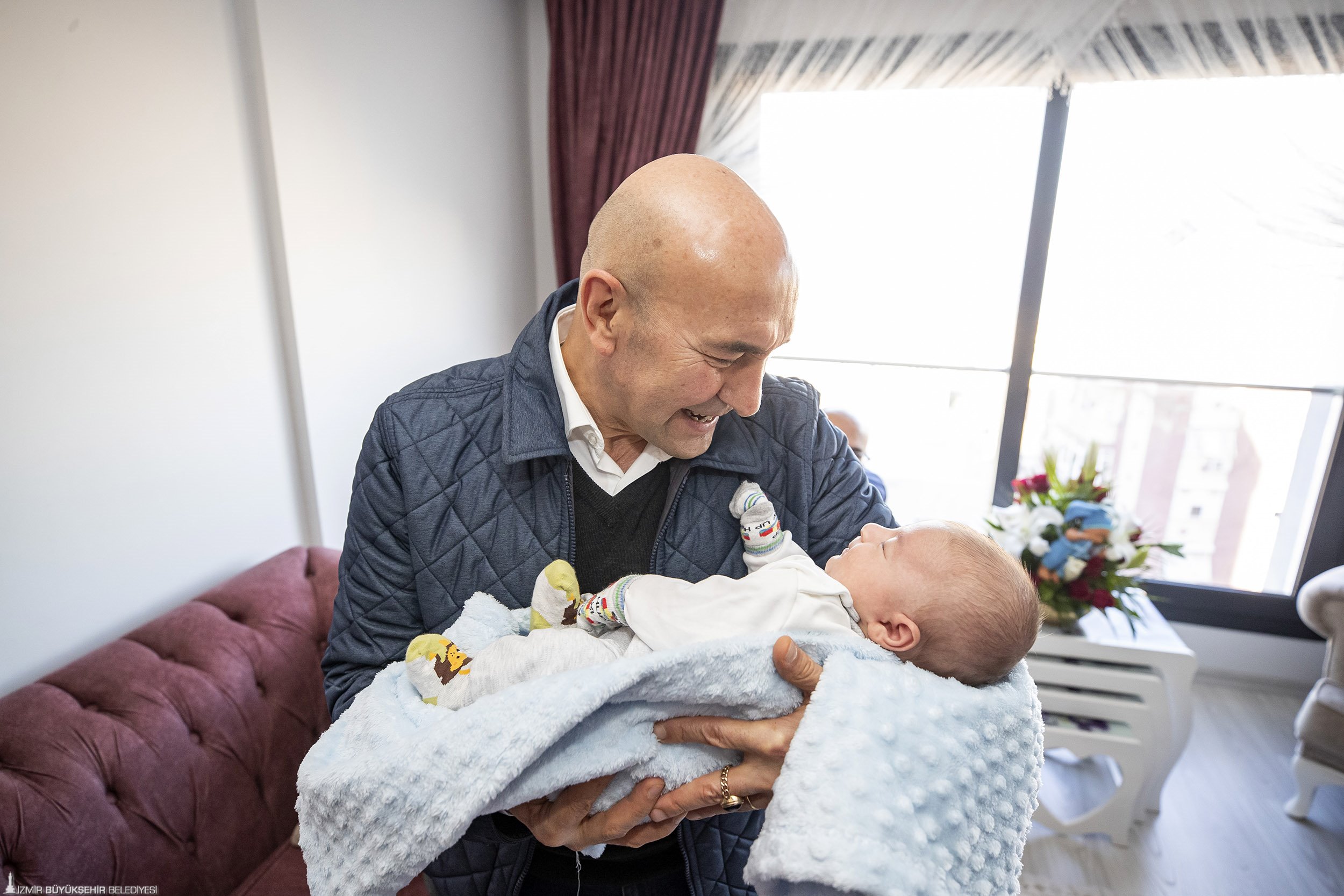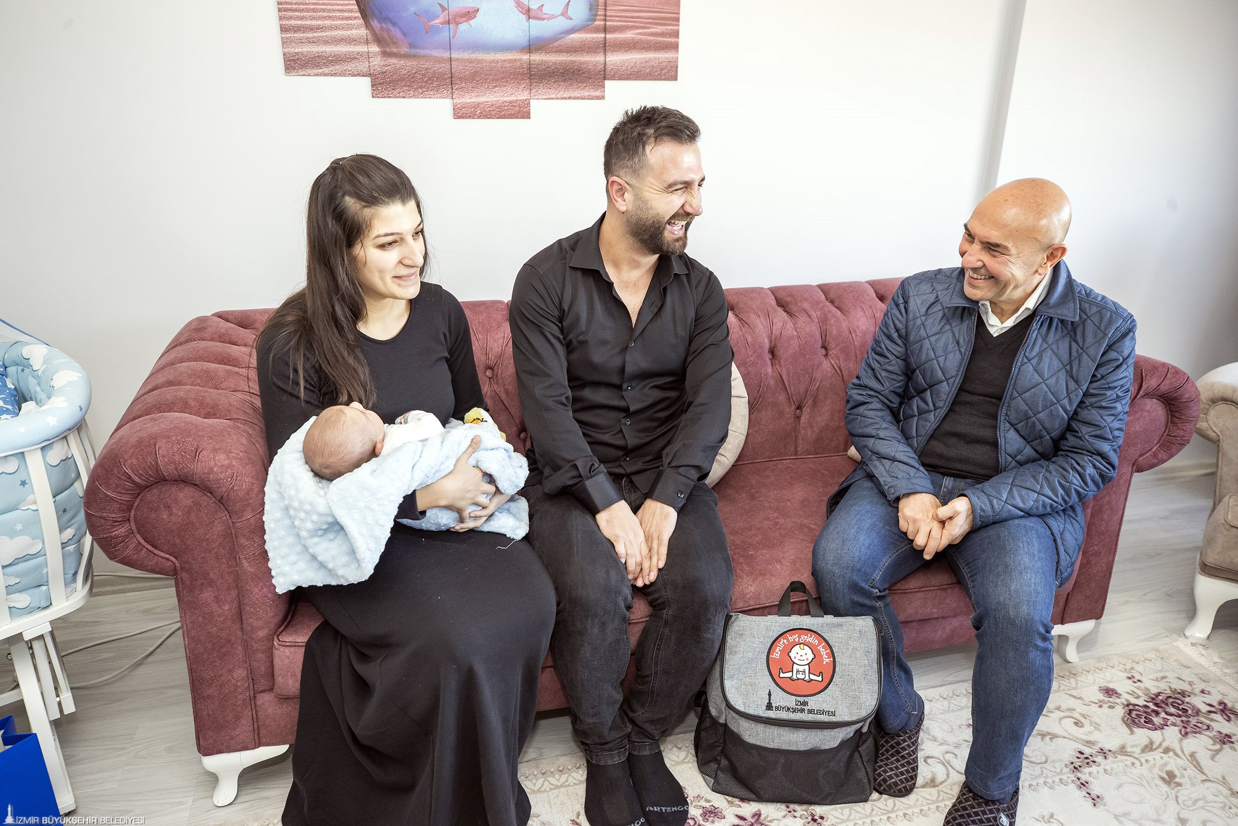 İzmir Büyükşehir Belediyesi yeni bebek sahibi aileleri, İzmir'e Hoş Geldin Bebek paketiyle karşılıyor. 0-3 aylık bebekler için hazırlanan setin ilkini, İzmir Büyükşehir Belediye Başkanı Tunç Soyer bir aylık Miran bebeğin anne ve babası Serpil-Tekin Demir’e takdim etti. Demir ailesinin Kadifekale Aziziye Mahallesi'ndeki evine konuk olan Tunç Soyer, “Bugünden itibaren İzmir’de doğan her bebek için Hoş Geldin Bebek paketi dağıtılacak ve onlar adına fidan dikilecek. Çocuklarımız ağaçlarıyla büyüyecek. Bu sayede kente olan aidiyet duyguları da güçlenecek” dedi.