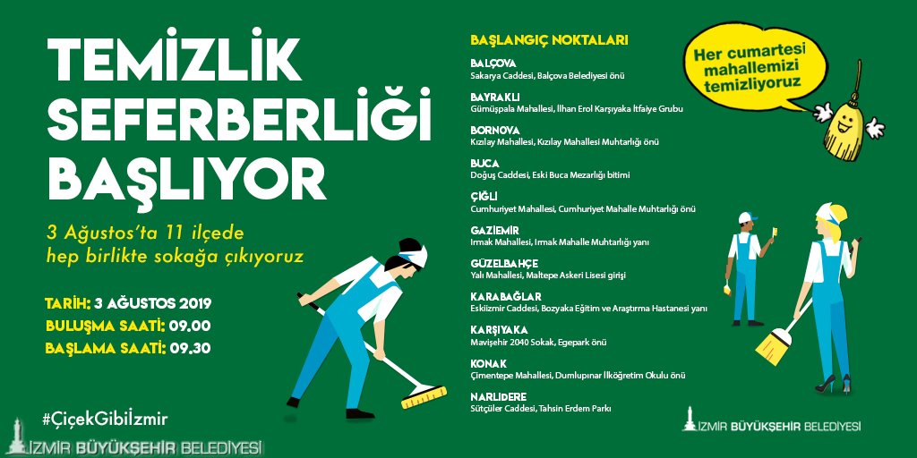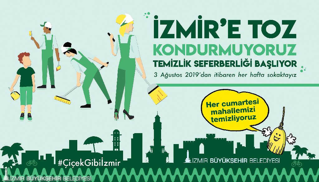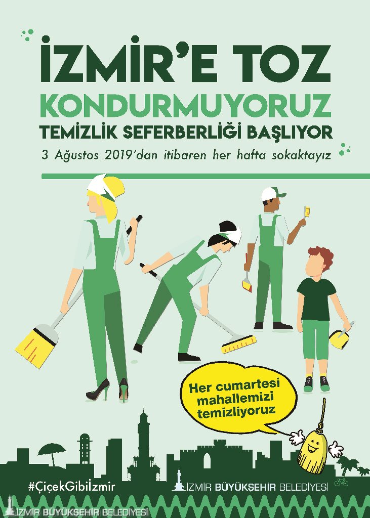 İlçe belediyelerin temizlik çalışmalarına modern araçlarla destek olan, kendi sorumluluk alanında bulunan ana arter, meydan ve bulvarların temizliği için aralıksız çalışan İzmir Büyükşehir Belediyesi, şimdi de mahalle mahalle temizlik seferberliği başlattı. İzmir Büyükşehir Belediyesi ekipleri, ilçe belediyeler, sivil toplum örgütleri, gönüllüler ve İzmirliler yarından (3 Ağustos 2019) itibaren her hafta cumartesi günü “Çiçek Gibi Bir İzmir” için sokağa çıkacak. İzmir Büyükşehir Belediye Başkanı Tunç Soyer, temizlik seferberliğini Çiğli Cumhuriyet Mahallesi’nden başlatacak.