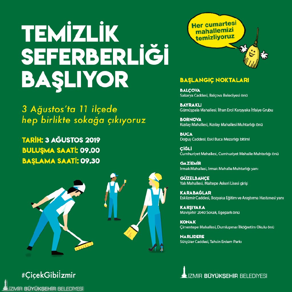 İzmir Büyükşehir Belediyesi’nin 50 temizlik aracı ve 200’e yakın personeli ile desteklenecek temizlik seferberliği, 3 Ağustos 2019 tarihinde 11 ilçede saat 09.30’da başlayacak. Her hafta farklı bir mahallede yürütülecek temizlik çalışmalarında İzmir Büyükşehir Belediyesi’nin vakumlu yol süpürme, basınçlı yol yıkama, afiş sökme araçları ile süpürme personeli görev alacak. Yol ve kaldırımlar süpürülecek, yollar yıkanacak, çöpler toplanacak. İzmirliler de bu çalışmalara gönüllü destek verecek. Her hafta cumartesi günü ilçenin bir başka mahallesinde kampanya sürdürülecek. Mahalle isimleri hem afişlerle hem de İzmir Büyükşehir Belediyesi’nin sosyal medya hesaplarından duyurulacak. İtfaiye Daire Başkanlığı’na bağlı sualtı dalgıç ekipleri de Cumhuriyet Meydanı’nda deniz dibinde temizlik çalışması yapacak. Deniz süpürgeleri ve kıyıdan çöp toplama ekipleri de temiz bir Körfez için yaptıkları rutin temizliği sürdürecek.