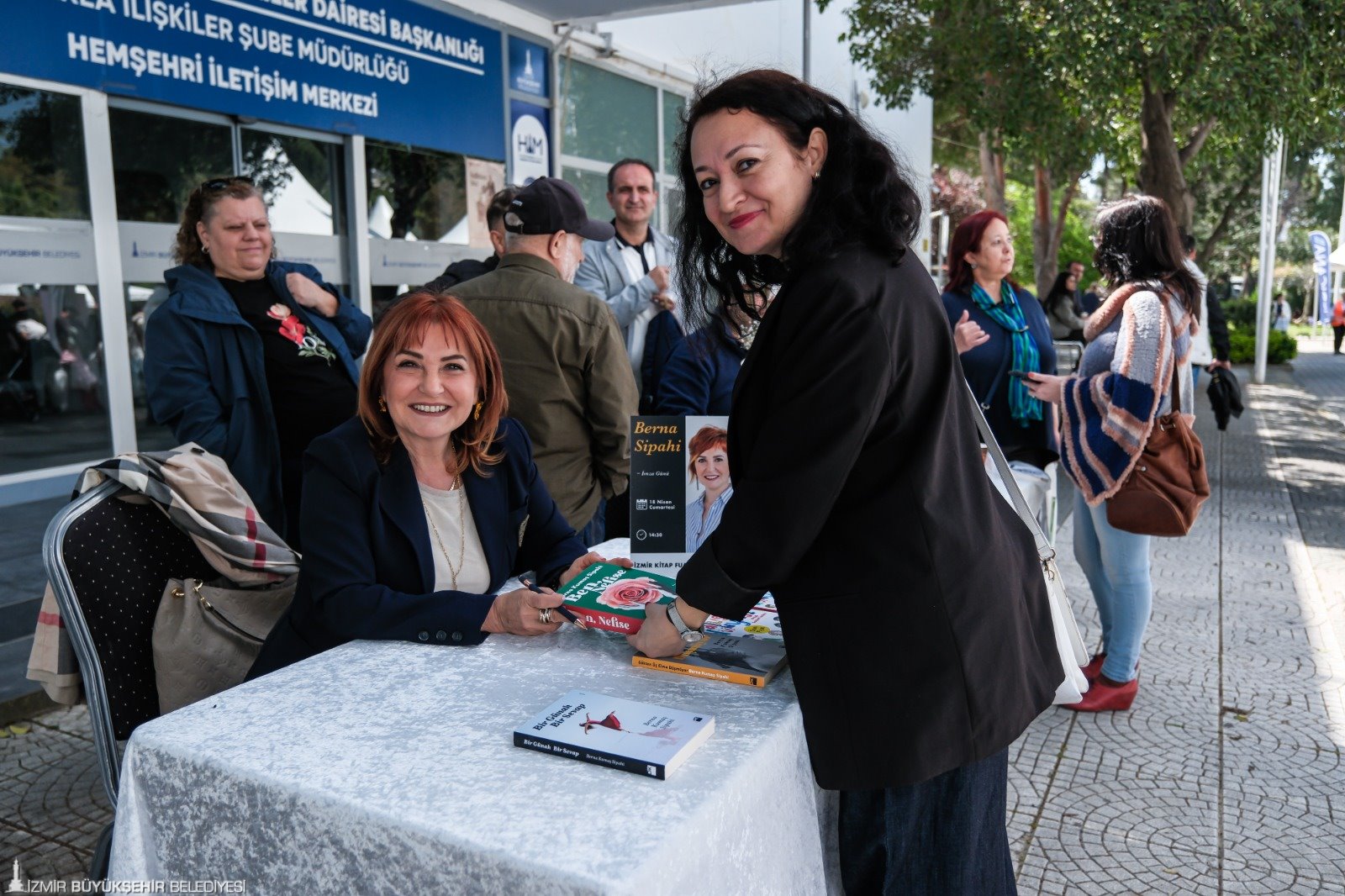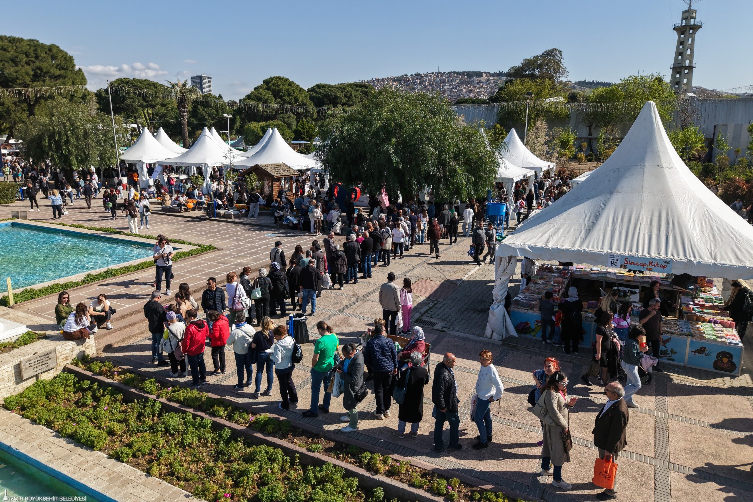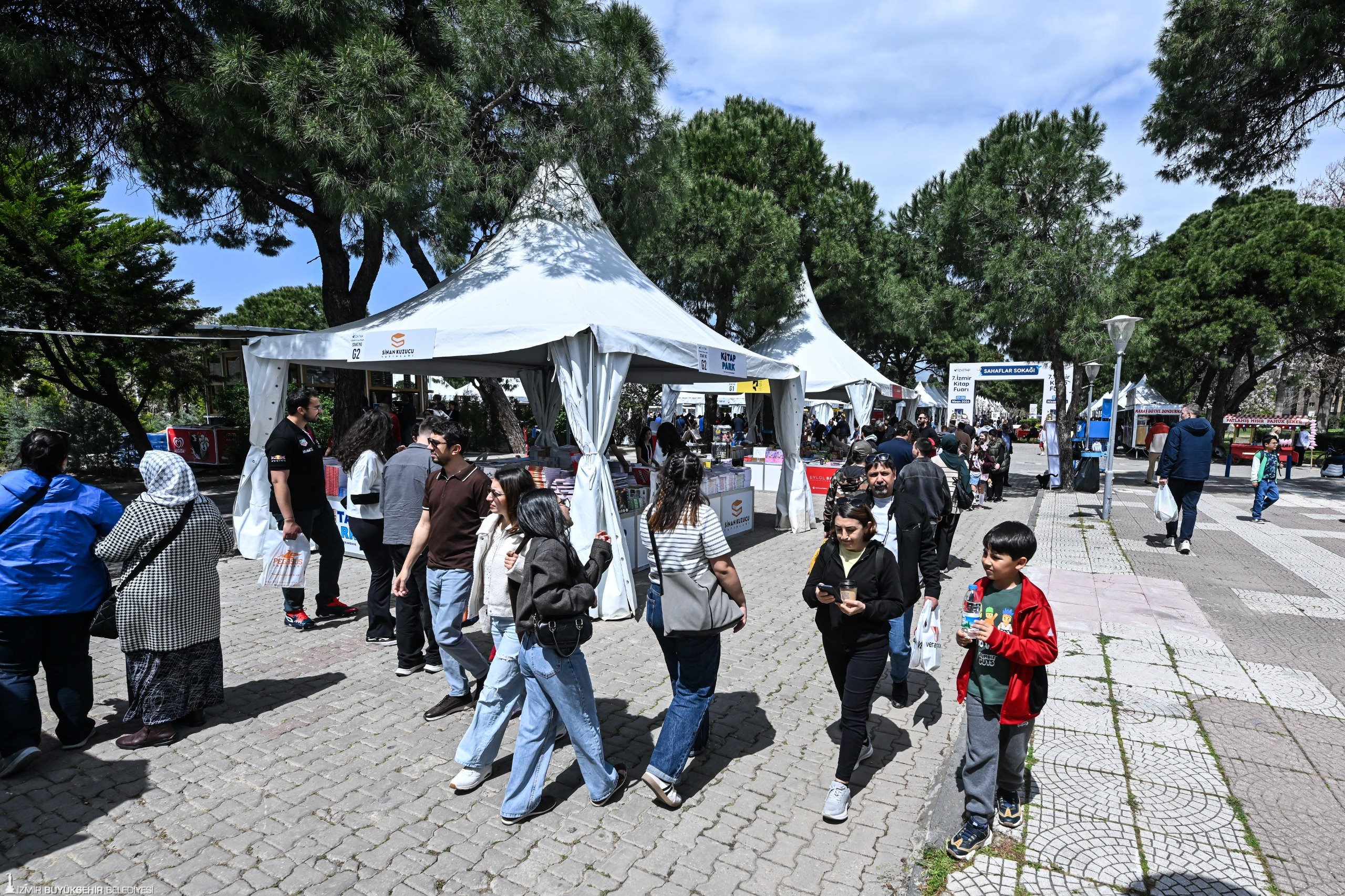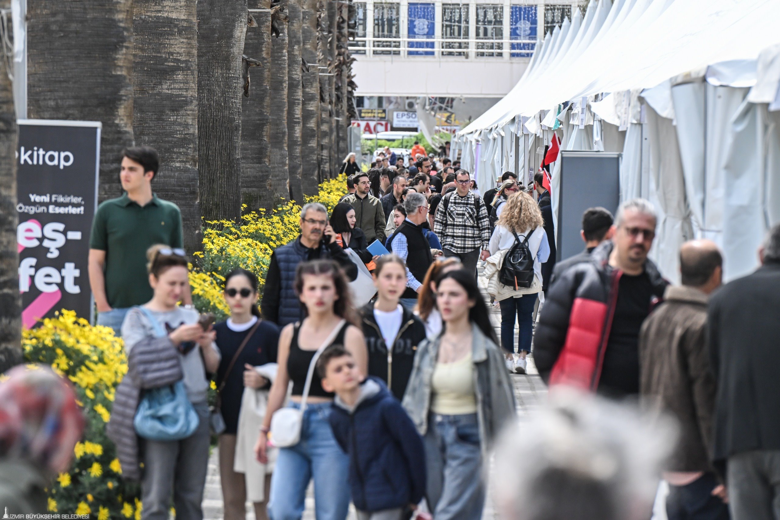 İzmir Büyükşehir Belediyesi'nin ev sahipliğinde, İZFAŞ ve TACT Fuarcılık iş birliğiyle 17-26 Nisan tarihleri arasında Kültürpark’ta düzenlenen İZKİTAP – 7. İzmir Kitap Fuarı, yayınevleri, sahaflar, eğitim ve kültür kurumları ile sivil toplum kuruluşlarını bir araya getirirken; yaklaşık 200 katılımcı ve 400’e yakın yazar, şair, gazeteci ve akademisyeni okurlarla buluşturuyor. Fuar kapsamında söyleşi ve imzalarla birlikte toplamda 500’e yakın etkinlik düzenleniyor. Fuarın ikinci gününde, hafta sonu güzel havayı da fırsat bilen kitapseverler, Kültürpark’ı doldurdu. Öğrenciler, çocuklarıyla birlikte fuara gelen aileler, her yaştan İzmirli, edebiyatla dolu bir gün yaşadı. Özellikle söyleşi alanları ve imza stantlarında kuyruklar oluştu. Okurlar hem sevdikleri yazarlarla bir araya gelme hem de yeni yayımlanan kitapları keşfetme fırsatı buldu.