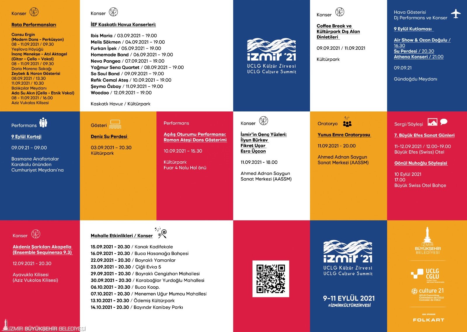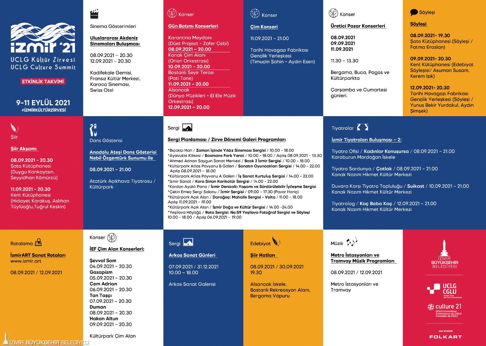 İzmir Büyükşehir Belediyesi, 3-12 Eylül tarihlerinde yapılacak İzmir Enternasyonal Fuarı ve 9-11 Eylül tarihleri arasındaki Dünya Belediyeler Birliği (UCLG) Kültür Zirvesi kapsamında kentte bir dizi etkinlik düzenliyor. Konserler, sinema gösterimleri, dinletiler, şiir, edebiyat ve kültür söyleşileri, resim sergileri, sanat gezileri, deniz su perdesi gösterileri, İzmir Körfezi vapur gezileri ve daha birçok etkinlik İzmirliler ile buluşacak. Kültür sanat mekanlarından kentin sokak ve meydanlarına, kütüphanelerden tarihi alanlara, metro istasyonları ve tramvaylardan üretici pazarlarına kadar İzmir’in dört bir yanında düzenlenecek etkinlikler İzmirlilerin sanata doymasını sağlayacak.