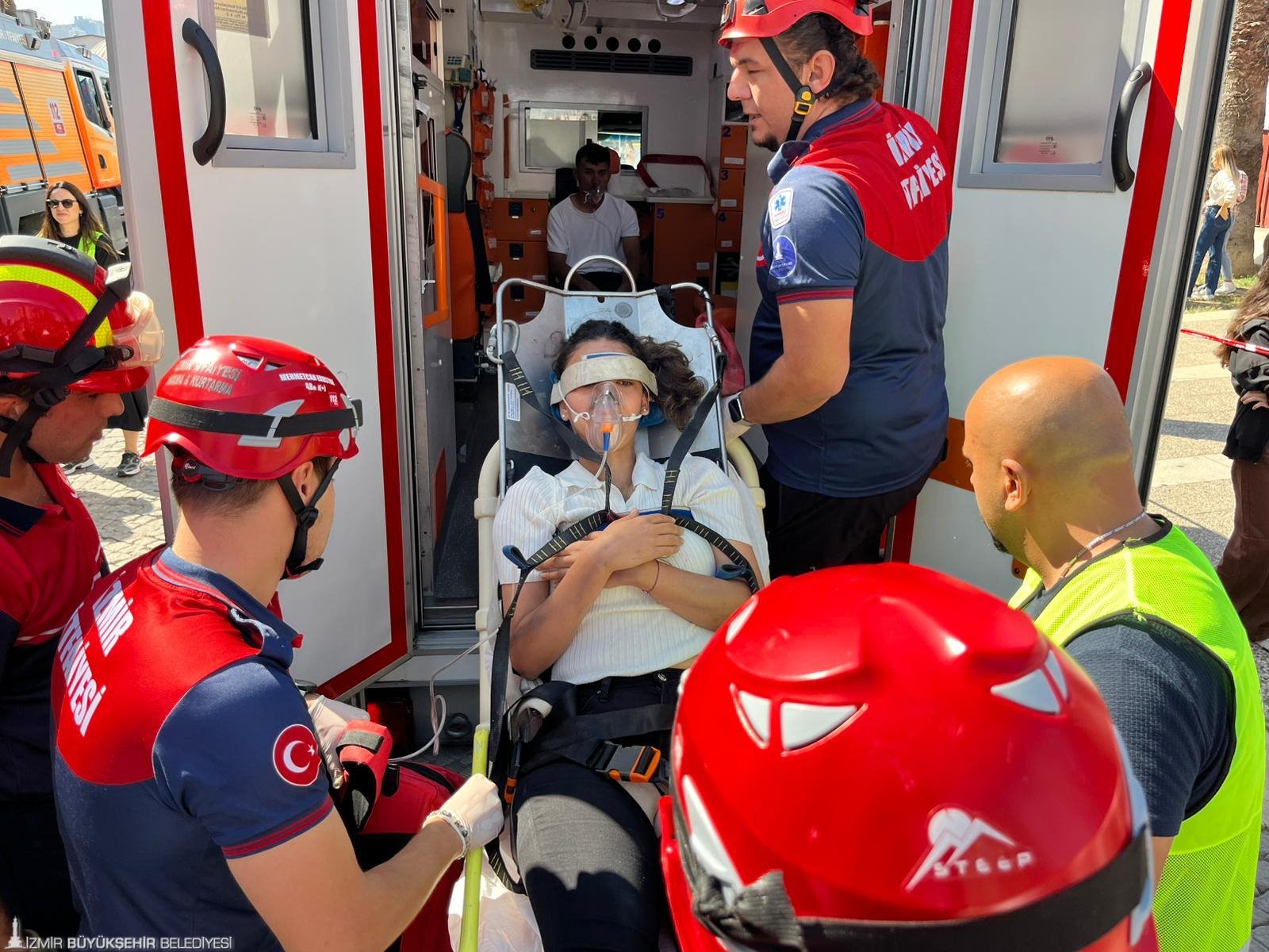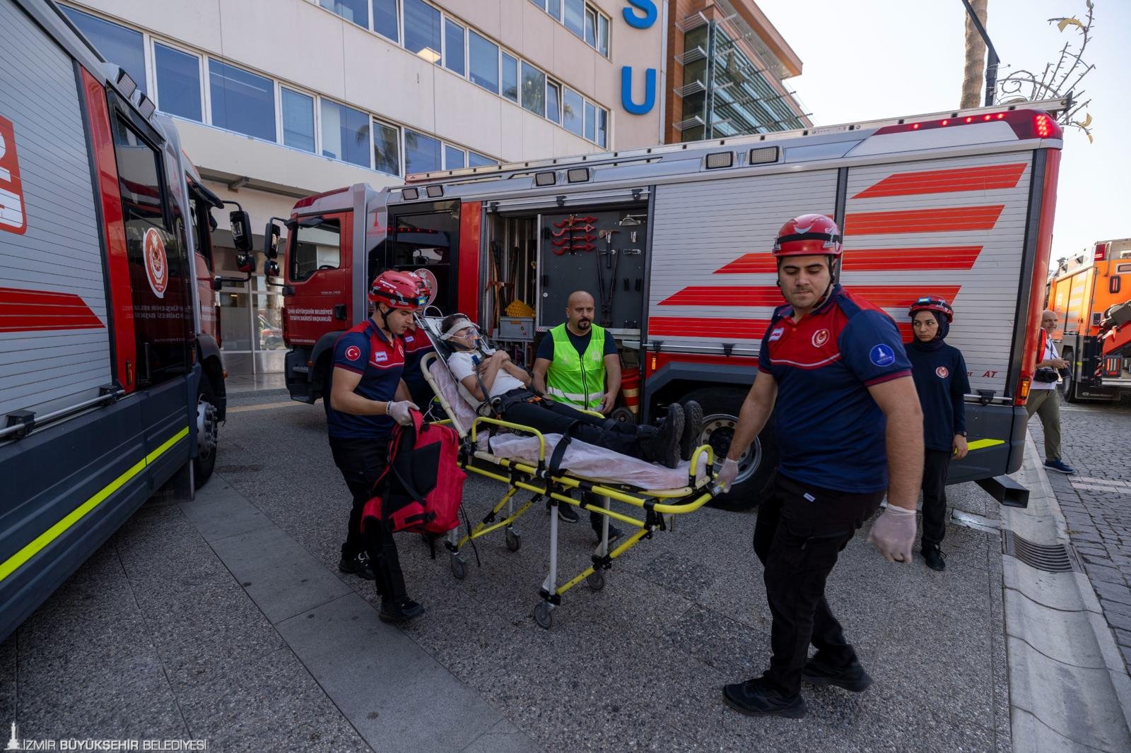 Binanın santral odasında elektrik kontağından kaynaklanan yangın kısa sürede üst katlara yayıldı. İZSU acil durum ekipleri, itfaiye gelene kadar binadaki personelin tahliyesini gerçekleştirerek çevre güvenliğini sağladı. Senaryo gereği binanın çeşitli katlarında biri engelli olmak üzere toplam dört kişi mahsur kaldı. Olay yerine hızla müdahale eden İzmir İtfaiyesi ekipleri, yangını başarıyla söndürürken, binada mahsur kalanları bulundukları yerden kurtardı. Binanın birinci katında bulunan biri engelli olmak üzere iki kişi acil durum taşıma teknikleri kullanılarak bulunduğu yerden kurtarılırken, 22 metrelik merdivenli araç kullanılarak ikinci kat terasında mahsur kalan kazazede sepet sedye ile indirildi. Kurtarma ekibi, dördüncü kattaki kazazedeyi kurtarma sedyesi ile ip iniş tekniğini kullanarak tahliye etti. Son olarak bina içinde duman tahliyesi yapılarak güvenlik sağlandı. AKS ekipleri, yangından kurtarılan yaralıların ilk sağlık müdahalesini yaptı ve ardından hastanelere sevk etti. Tatbikat ekiplerin koordineli çalışmaları sonucu başarıyla tamamlandı. Ekipler tatbikatı heyecanla izleyen yurttaşlar tarafından uzun süre alkışlandı.