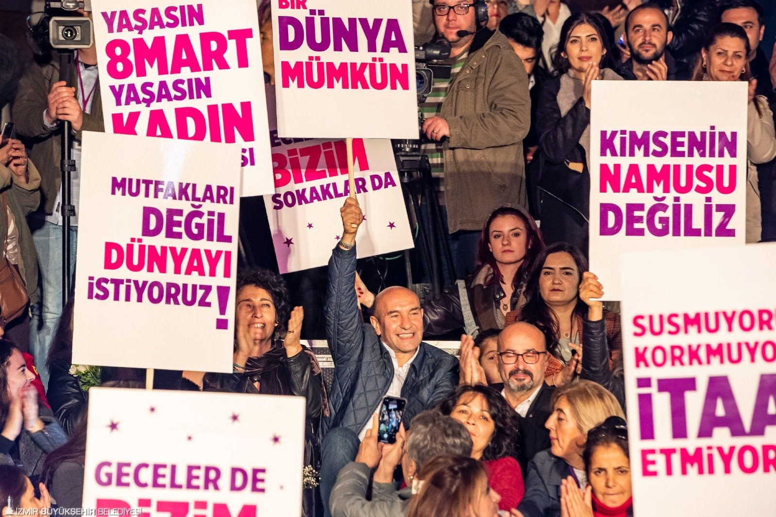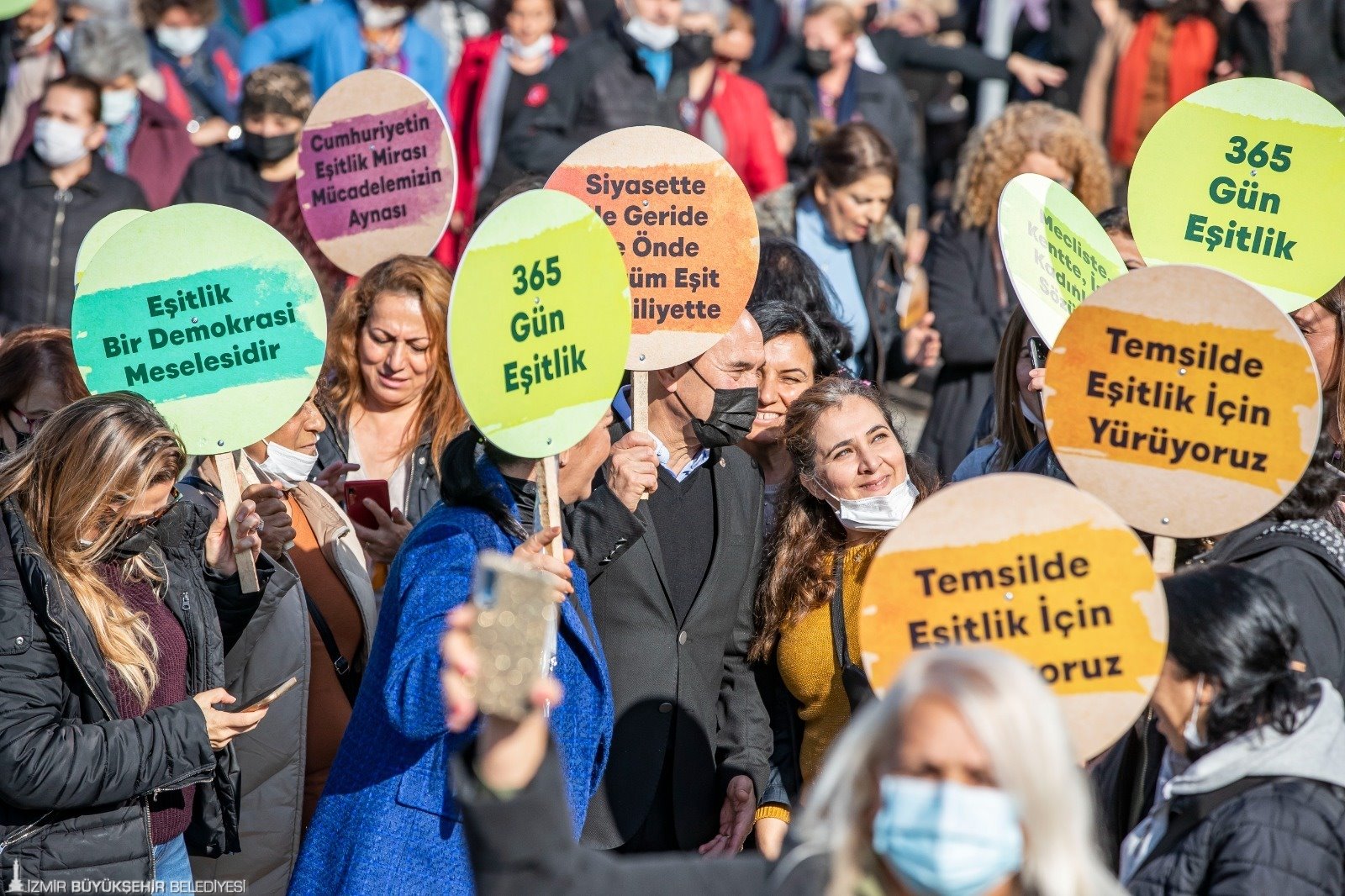 Başkan Soyer, İzmir Büyükşehir Belediyesi’nin karar alma mekanizmalarında eşit temsilin uygulandığını dile getirerek “Biz yönetim ve istihdam politikasında cinsiyet eşitliği ilkesini esas alıyoruz. Belediyemiz ülkemizde en fazla kadın yöneticinin olduğu kurumların başında geliyor. Büyükşehir Belediyesi’nde kadınlar karar alma mekanizmalarında güçlü bir şekilde varlığını hissettiriyor. Kadın ve erkek yönetici oranlarımız neredeyse yarı yarıya” diye konuştu. Erkek egemen iş kollarında kadın istihdamını önemsediklerini vurgulayan Soyer, sözlerini şöyle sürdürdü: “Bu hedefle gemi kaptanı, Eshot şoförü, metro ve tramvay vatmanı, zabıta memuru, itfaiye memuru, vinç operatörü, güverte personeli iş kollarında kadın istihdamını sürekli arttırıyoruz. İZSU’da daha yeni iş makinası operatörü ve ağır vasıta şoförü 30 kadın işbaşı yaptı. Son üç yılda İzmir Büyükşehir Belediyesi’nde kadın çalışan oranının yüzde 40 artış gösterdiğini de söylemeliyim.” Başkan Soyer, sadece İzmir Büyükşehir Belediyesi’nde değil İzmir’de de kadın erkek eşitliğini hayatın her alanında sağlamak için pek çok somut proje yürüttüklerini de ekleyerek sözlerini şöyle tamamladı: “Şiddetin olmadığı, eşit ve adil bir dünya için tüm kadınların umudunu İzmir’den yeşerteceğiz”