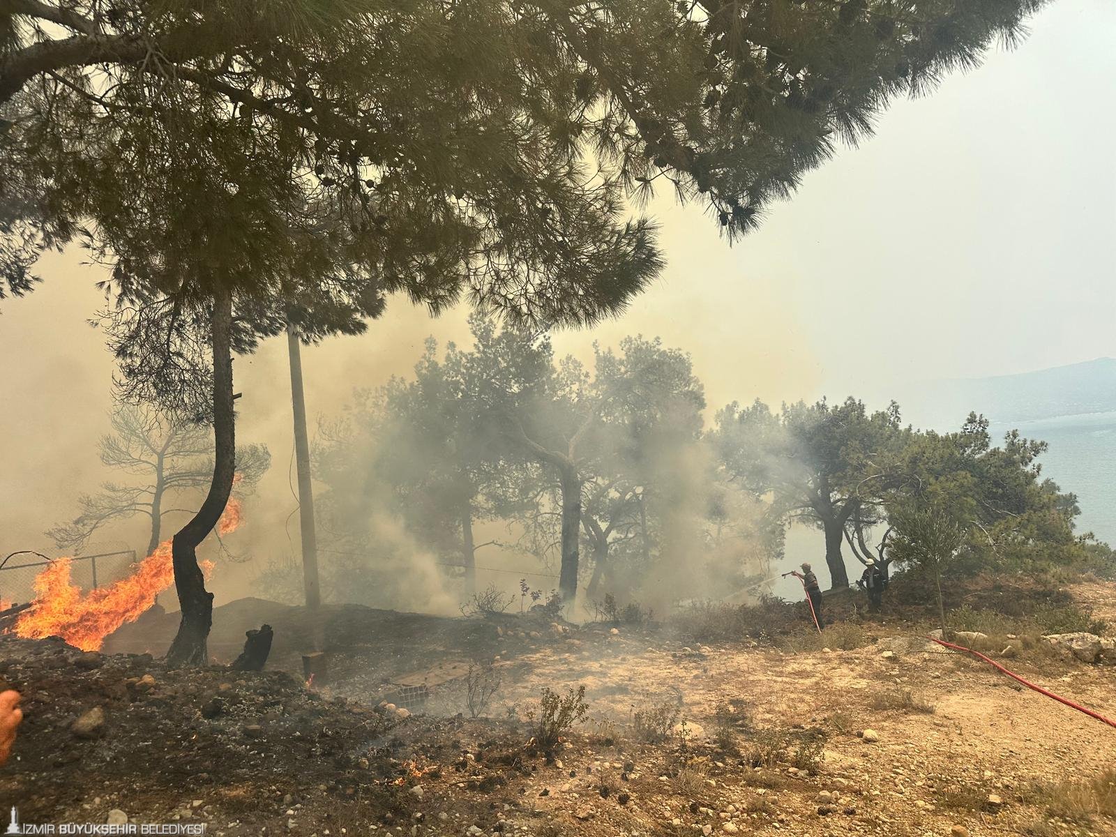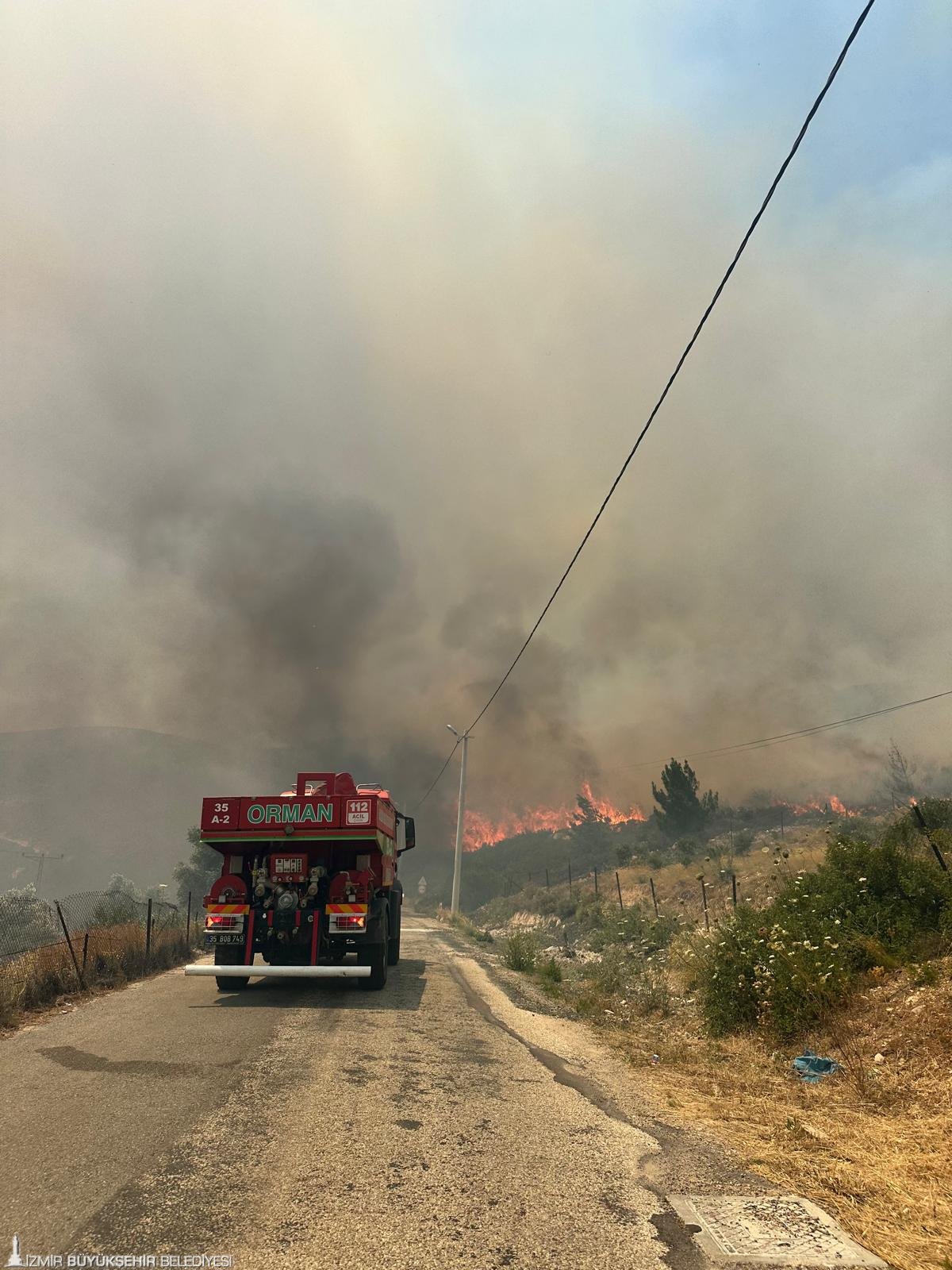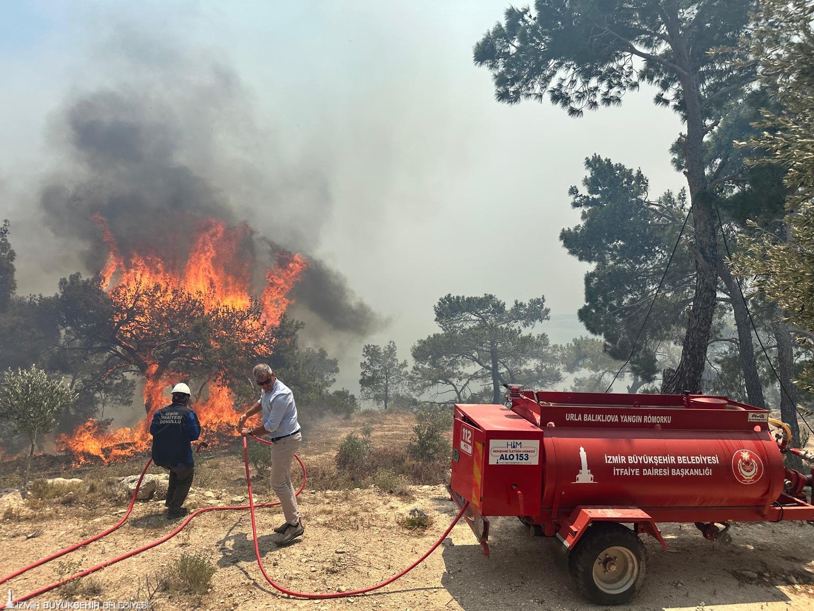 İzmir Büyükşehir Belediyesi İtfaiye Dairesi Başkanlığı ekipleri, öğle saatlerinde Karaburun Mordoğan’da başlayan orman yangınını kontrol altına almak için yoğun mesai harcıyor. İzmir İtfaiyesi ekiplerinin yanı sıra İzmir Orman Bölge Müdürlüğü’ne ait 2 uçak, 6 helikopterin havadan müdahale ettiği yangını söndürme çalışmalarında çok sayıda arazöz ve ilçe belediyelerince gönderilen su tankerleri kullanılıyor. Çalışmalara orman gönüllüleri de destek veriyor. Yangının yerleşim yerlerine ulaşmasını engelleyen ekipler, alevleri kontrol altına almak için çalışmalarını sürdürüyor.