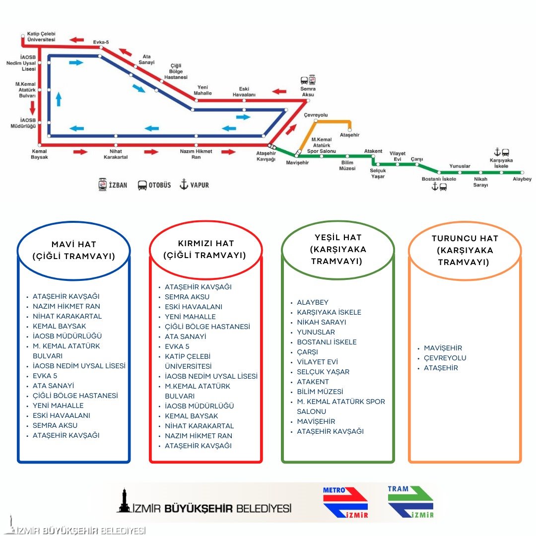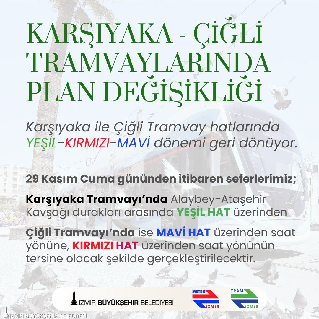 İzmir Metro AŞ’nin işlettiği Karşıyaka ve Çiğli tramvay hatlarında sefer planları, bugün (29 Kasım) itibariyle değişti. Bölgede bir süredir Alaybey - Katip Çelebi Üniversitesi duraklarının ardından; Atatürk Organize Sanayi Bölgesi hattı üzerinden Alaybey'e dönerek ring seferleri yapılıyordu. Yeni düzenleme ile seferler artık Alaybey - Ataşehir Kavşağı durakları arasında Yeşil Hat üzerinden yapılacak. Çiğli'de ise seferler yine Mavi ve Kırmızı hatlar üzerinden gerçekleştirilecek. Çiğli Tramvayı Mavi Hat seferleri saat yönünde, Kırmızı Hat seferleri ise saat yönünün tersine olacak şekilde yapılacak.