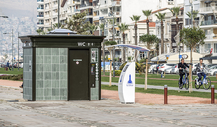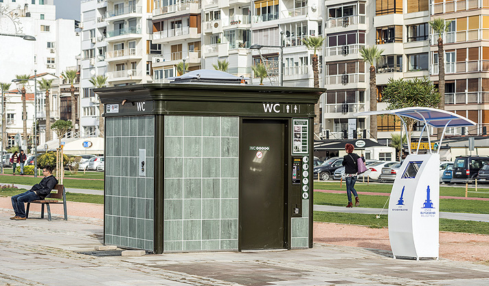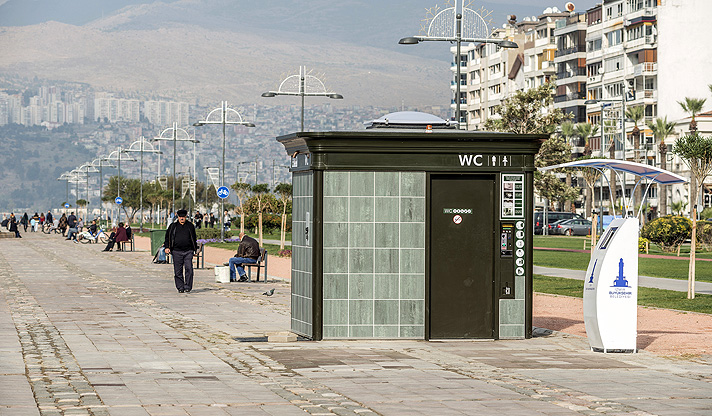 İzmir’in uygar kimliğine yakışır tuvaletlerin en önemli özellikleri hijyenik, estetik ve güvenli olması. İlk uygulaması Alsancak kıyıda görülen yeni tuvalet, otomatik temizleme sistemi sayesinde oldukça hijyenik. Klozet kendine özel kapalı bir bölmede otomatik olarak tümüyle yıkanıyor. Kauçuk kanallı zemin, her kullanımdan sonra basınç sensörü sayesinde suyla temizleniyor.