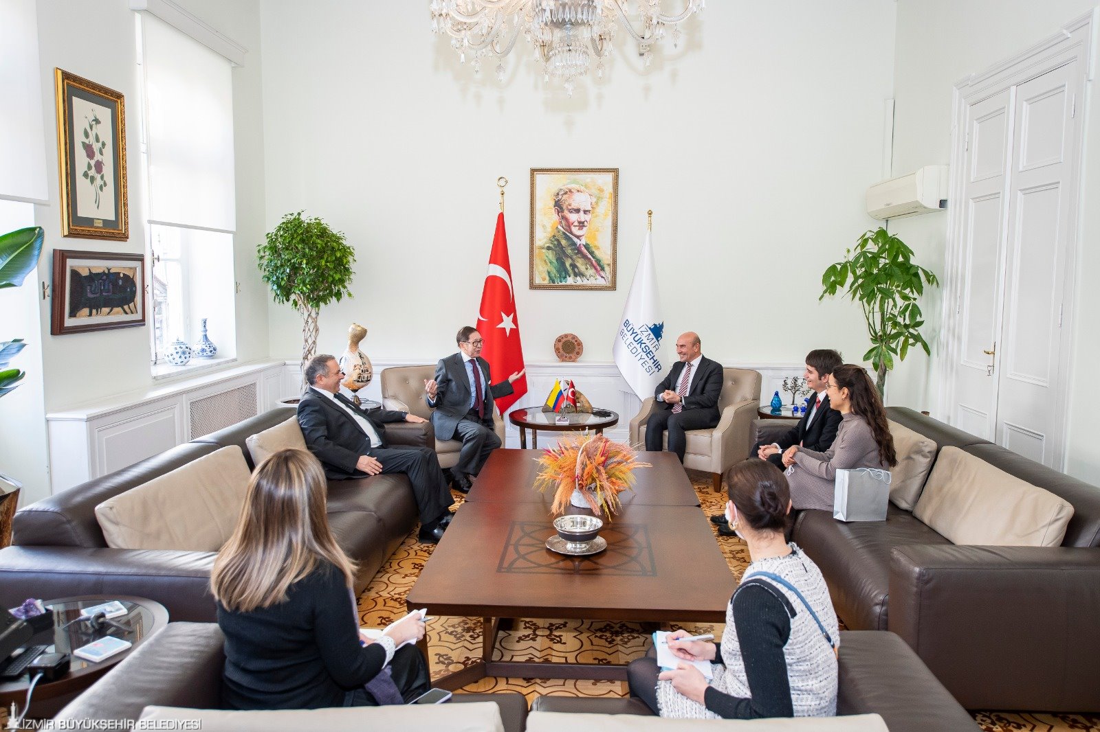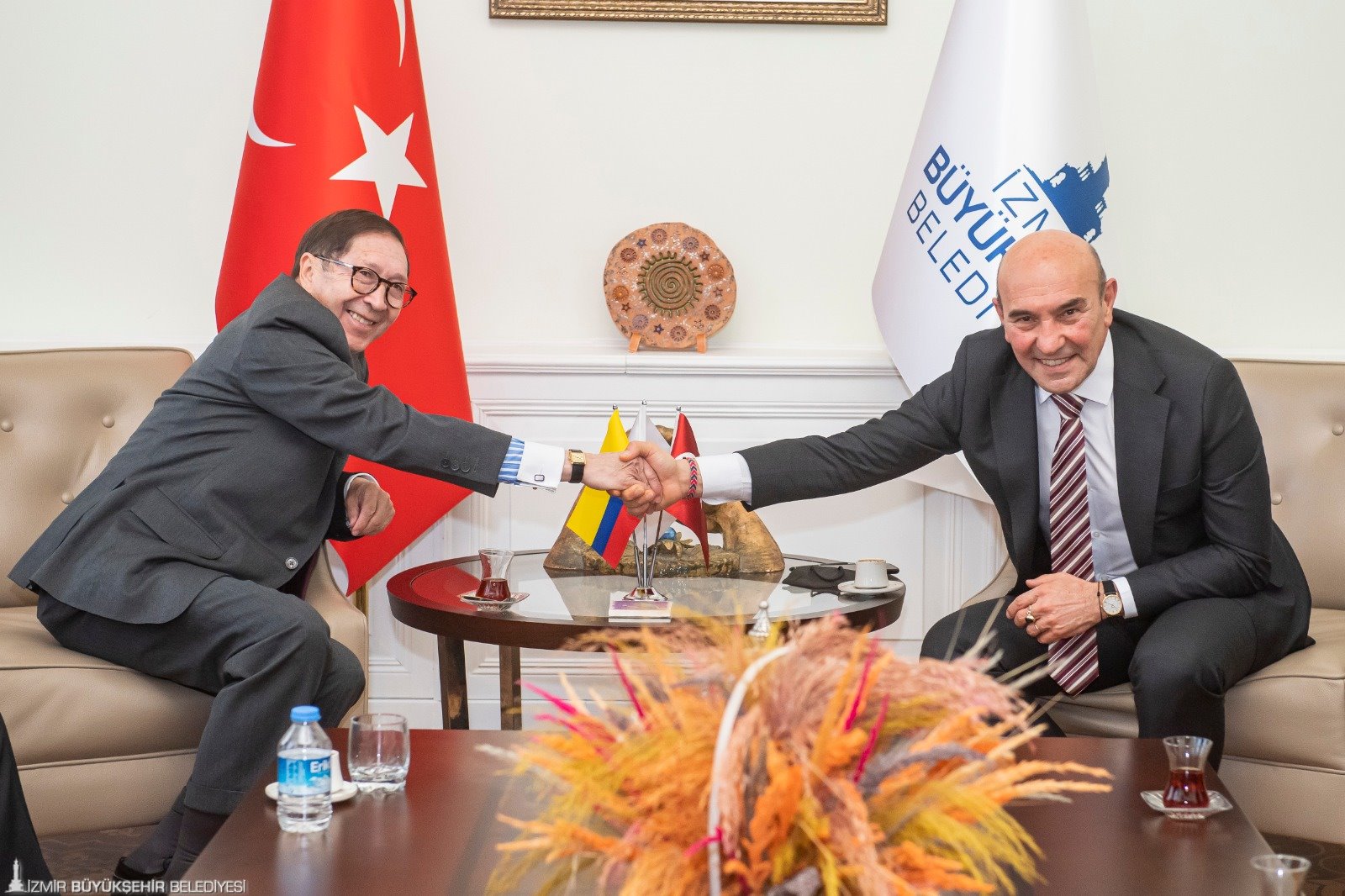 İzmir Büyükşehir Belediye Başkanı Tunç Soyer Ankara’nın Kolombiya Büyükelçisi Julio Aníbal Riano ile Kolombiya İzmir Fahri Konsolosu Eliya Alharal'ı ağırladı. Görüşmede iki ülke arasında karşılıklı işbirliğini geliştirme olanakları üzerine konuşuldu. Kolombiya Büyükelçisi Julio Aníbal Riano, İzmir’de Kolombiyalı mural sanatçılarının olacağı ve Kolombiya kahvesinin tanıtılacağı bir festival düzenlemek istediklerini aktardı. Kolombiya İzmir Fahri Konsolosu Eliya Alharal da Başkan Tunç Soyer ile aktif bir şekilde çalışmak istediklerini söyleyerek “Kültür ve sanata verdiğiniz desteklerden dolayı teşekkür ediyoruz” dedi. Kültür ve sanatsız bir hayatın mümkün olmadığını belirten Başkan Soyer ise İzmir’de yapılması planlanan etkinliğe gerekli tüm desteği vereceklerini ifade etti.