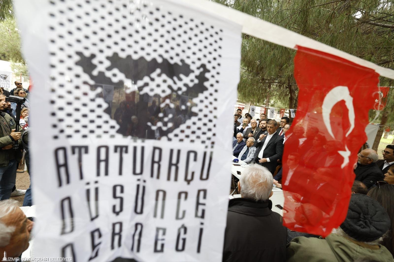 Tüm ADD şubeleri ve üyeleri adına destek mesajı veren ADD Genel Başkanı Dr. Mustafa Hüsnü Bozkurt, “Bugün, daha önceden planladığımız Atatürkçü Düşünce Derneği İzmir şubeleri toplantısını maalesef burada yapmak gereği duyduk. Osmanlı döneminden kalma un fabrikası olan, 1926 yılında Atatürk’ün emriyle İzmir Büyükşehir Belediyesi mülkiyetine verilen Meslek Fabrikası binası için buradayız. 9 Eylül’de Türk ordusu İzmir’e girdiğinde burada kurulan tuzak sonucu açılan ateşle Mehmetçiklerimiz şehit oldu. Hadi Gazi Mustafa Kemal Atatürk’ten utanmadınız, şehitlerden de mi utanmadınız? O askerlerimizin şehit olduğu yerde şimdi maalesef İzmirliler 24 saat nöbet tutuyorlar. Atatürk’ün kendilerine verdiği yer ellerinden alınmasın diye nöbet tutuyorlar. Biz de Atatürkçü Düşünce Derneği olarak eş güdüm toplantımızı burada yapıyoruz. Bütün Atatürkçü Düşünce Derneği şubeleri adına İzmir’den sesleniyoruz. Bu hukuksuz kararın, yanlış karardan vazgeçilmesini istiyoruz” ifadelerini kullandı.