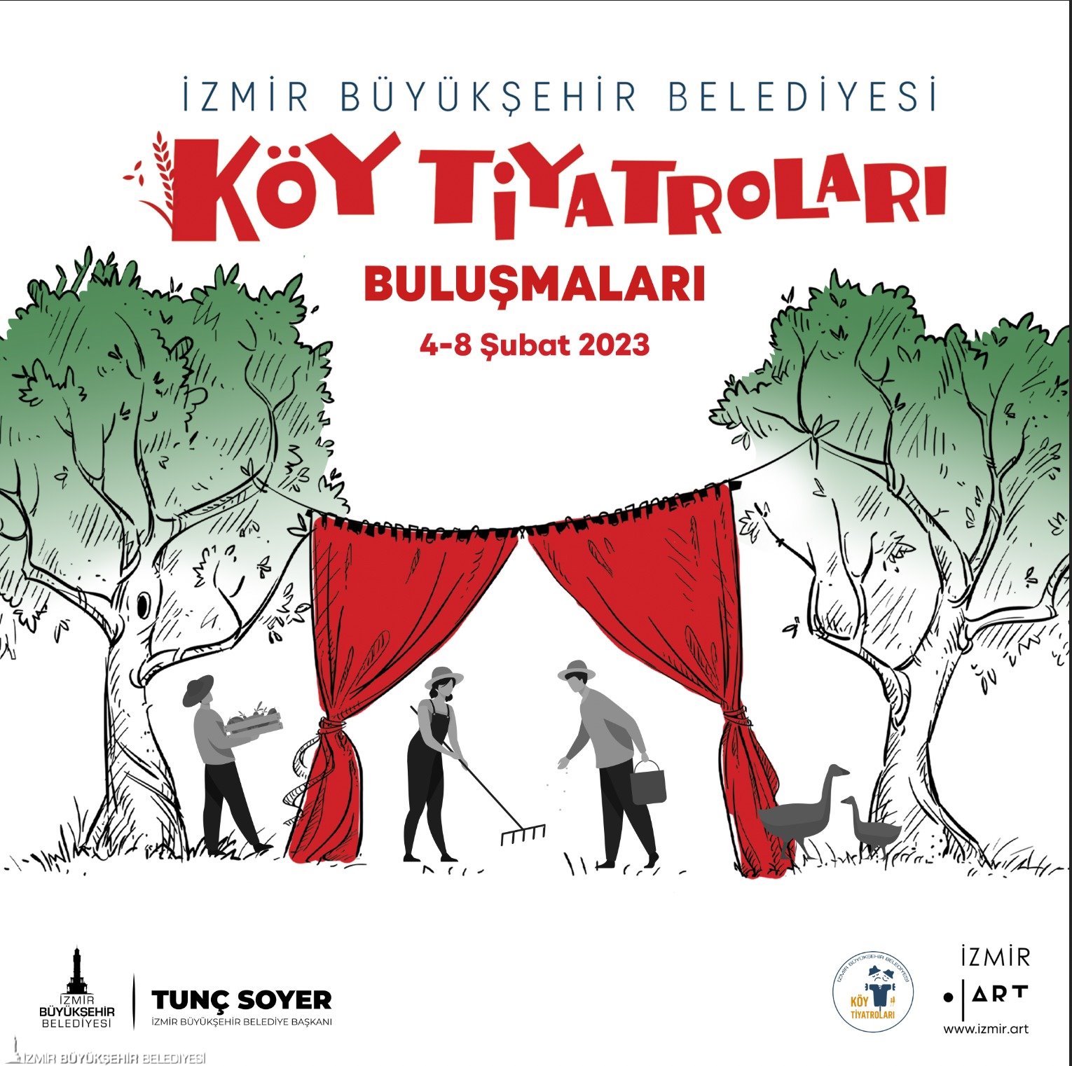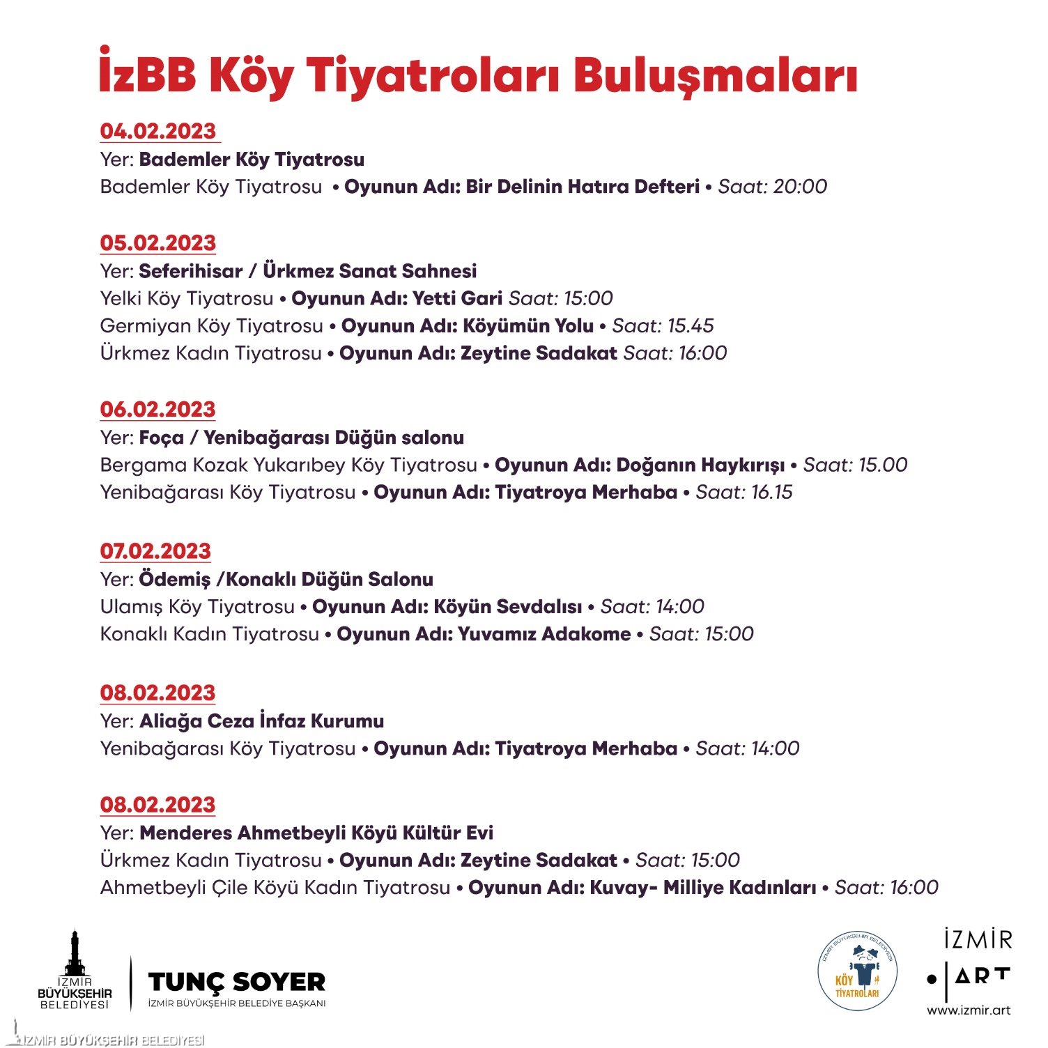 Köy Tiyatroları Buluşmaları "Sanata dokunan ellerde kir barınmaz" sloganıyla dört gün boyunca Urla, Seferihisar, Foça, Aliağa, Ödemiş ve Menderes’te yapılacak. Her köy kendi hikâyesinden yola çıkarak köy seyirlik tarzı oyunları seyirciyle buluşturacak.